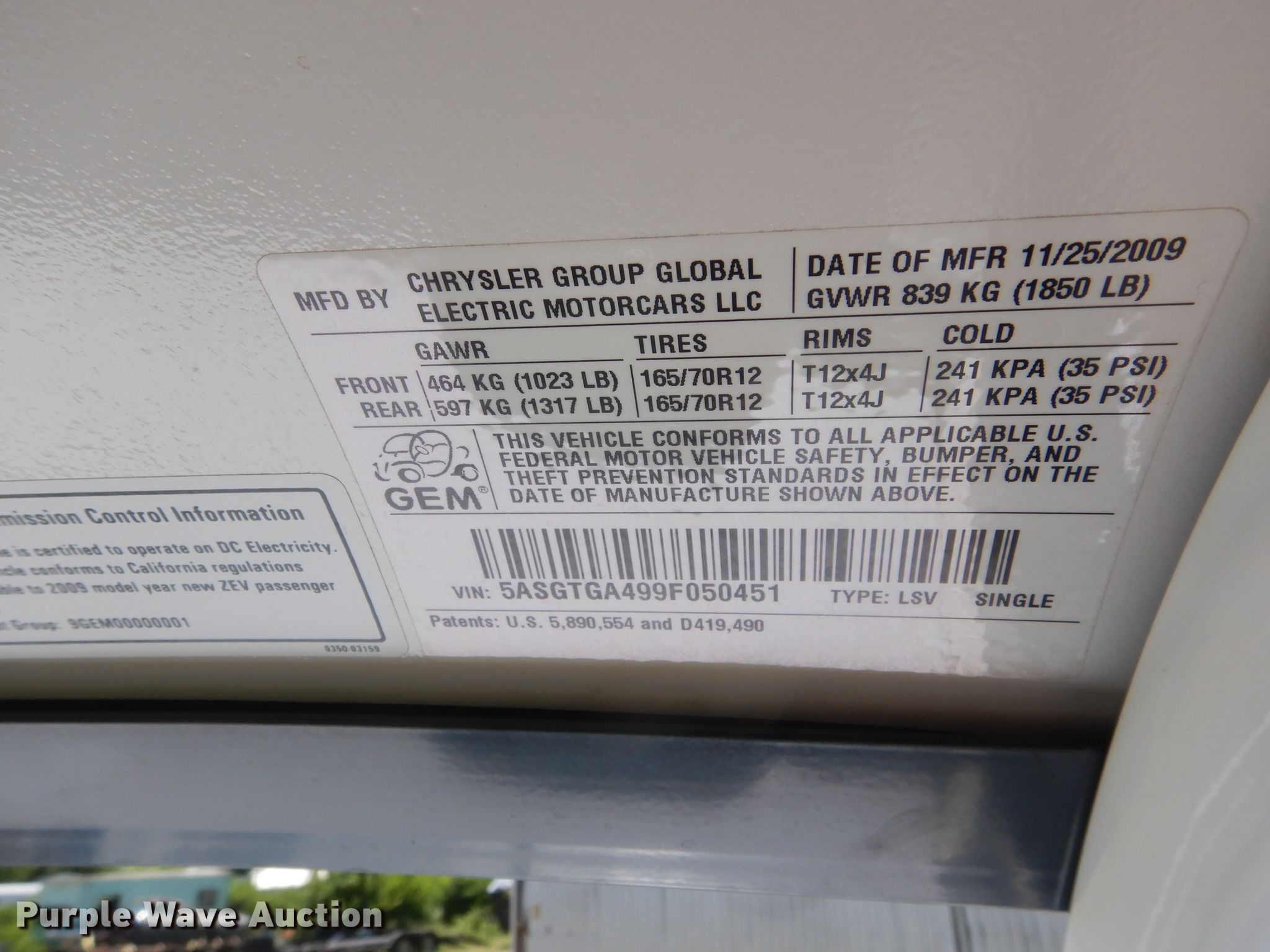 2009 Chrysler GEM utility vehicle. 42 miles on odometer. Engine GE 5BC49JB1160, Serial: DCBA097P011, Fuel type: Electric, HP: 5. Transmission Hydrostatic. Operators station Canopy, Passengers: 2. Tires Size: 165/70R12. Oklahoma title. Title distribution may be delayed up to 14 days from verification of funds. 5ASGTGA499F050451. 700 Evanhale Rd. Oklahoma City, OK 73127