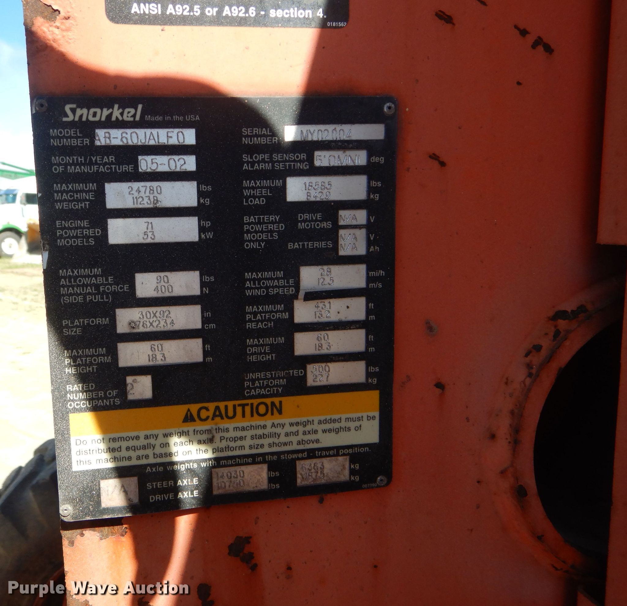 Purple Wave is selling a used Boom Lift in Iowa. This item is a 2002 Snorkel AB-60JALF0 boom lift with the following: 2,949 hours on meter, Serial: MY02004