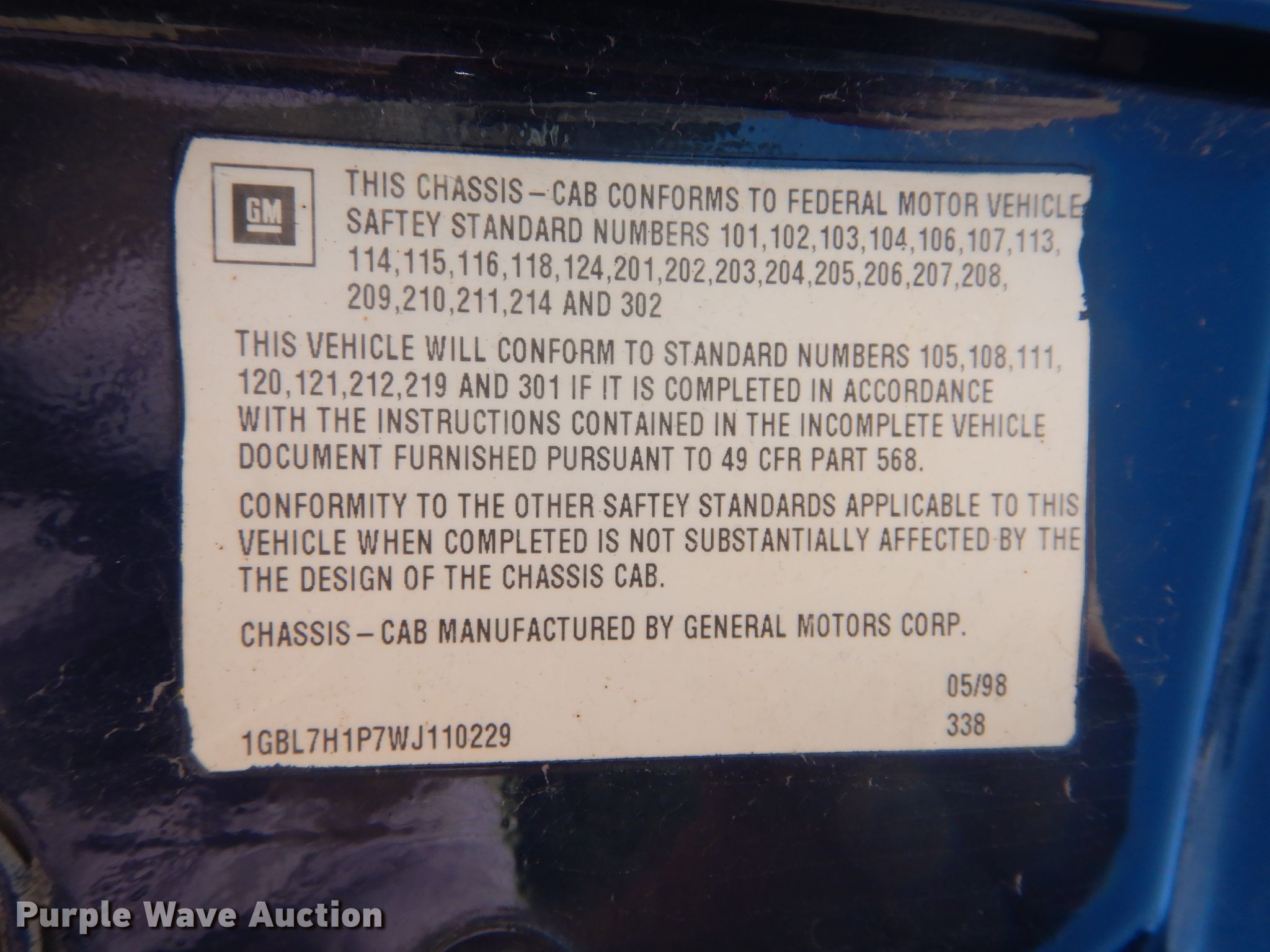 1997 Chevrolet C7500 dump truck. 187,520 miles on odometer. Engine Displacement: 6.0L, Cylinders: 8, Fuel type: Gas. Transmission Manual, Speed: 5. Chassis Axles: Single, Suspension: Spring, Brakes: Hydraulic, PTO, GVWR: 27,100 lbs, Wheelbase: 140". Interior AC, Heat, Brake controller. Operational Dump bed 9' L x 96" W, Side height: 30", Side board height: 18", Ram: Single , End gate: Manual. Notes Decals will be removed prior to auction. Oklahoma title. 1GBL7H1P7VJ109130. Integrity Construction. 403 E Flynn St. Alva, OK 73717