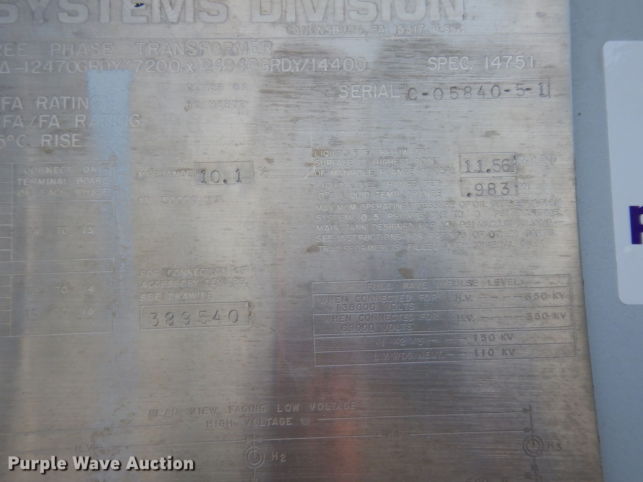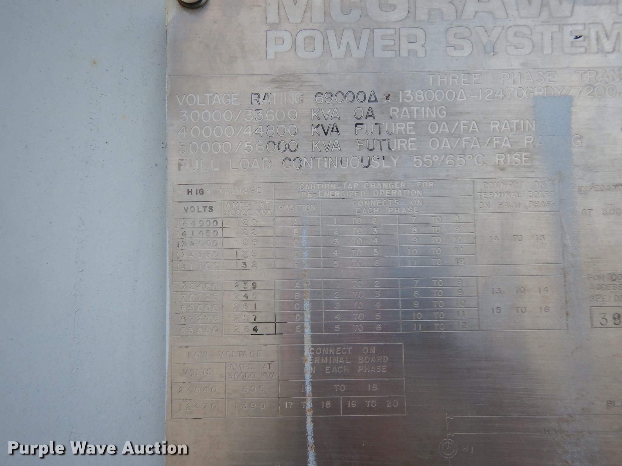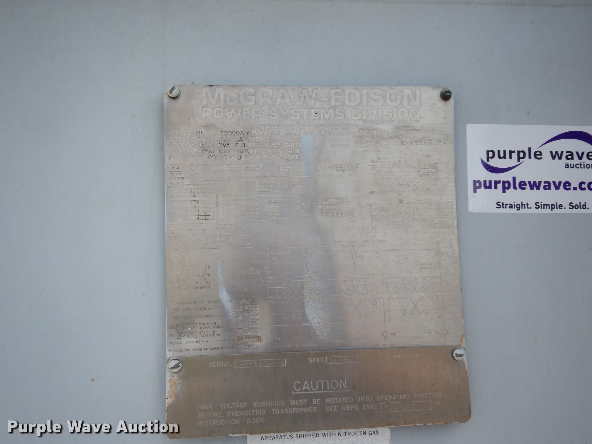 Purple Wave is selling a used Other Industrial or Business in Texas. This item is a McGraw-Edison transformer with the following: 341"L x 159.5"W x 198"H, Three phase, Voltage ratings, 30,000/33,600, 40,000/44,800, 50,000/56,000, 159,750 lbs total weight, Serial C-05840-5-1