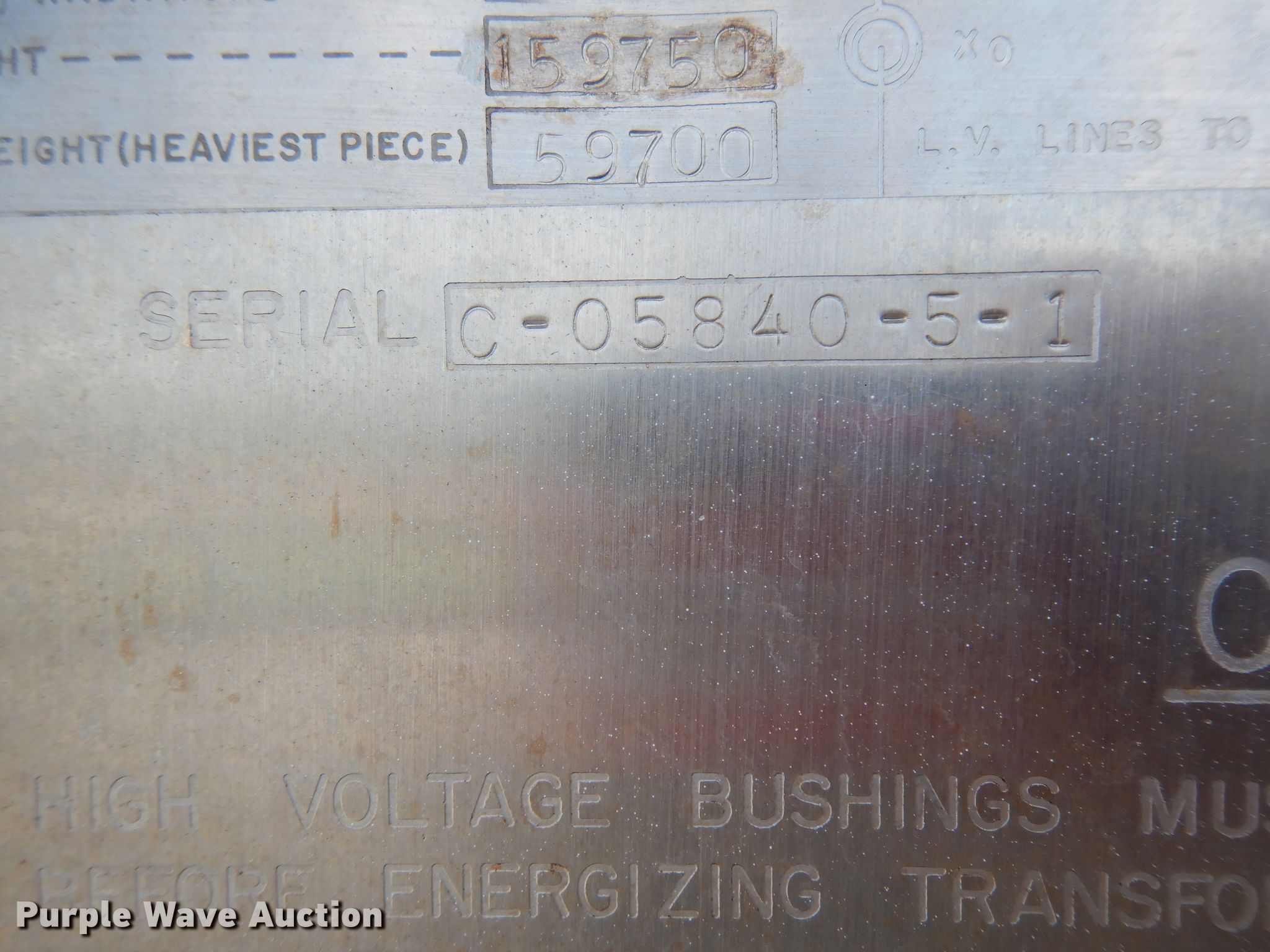 McGraw-Edison transformer. 341"L x 159.5"W x 198"H, Three phase, Voltage ratings 30,000/33,600, 40,000/44,800, 50,000/56,000, 159,750 lbs total weight, Serial C-05840-5-1. Load-out and removal is the sole responsibility of the purchaser. Hunt Utility - Open inspection July 16. 3801 S Mayberry Rd. Mission, TX 78572