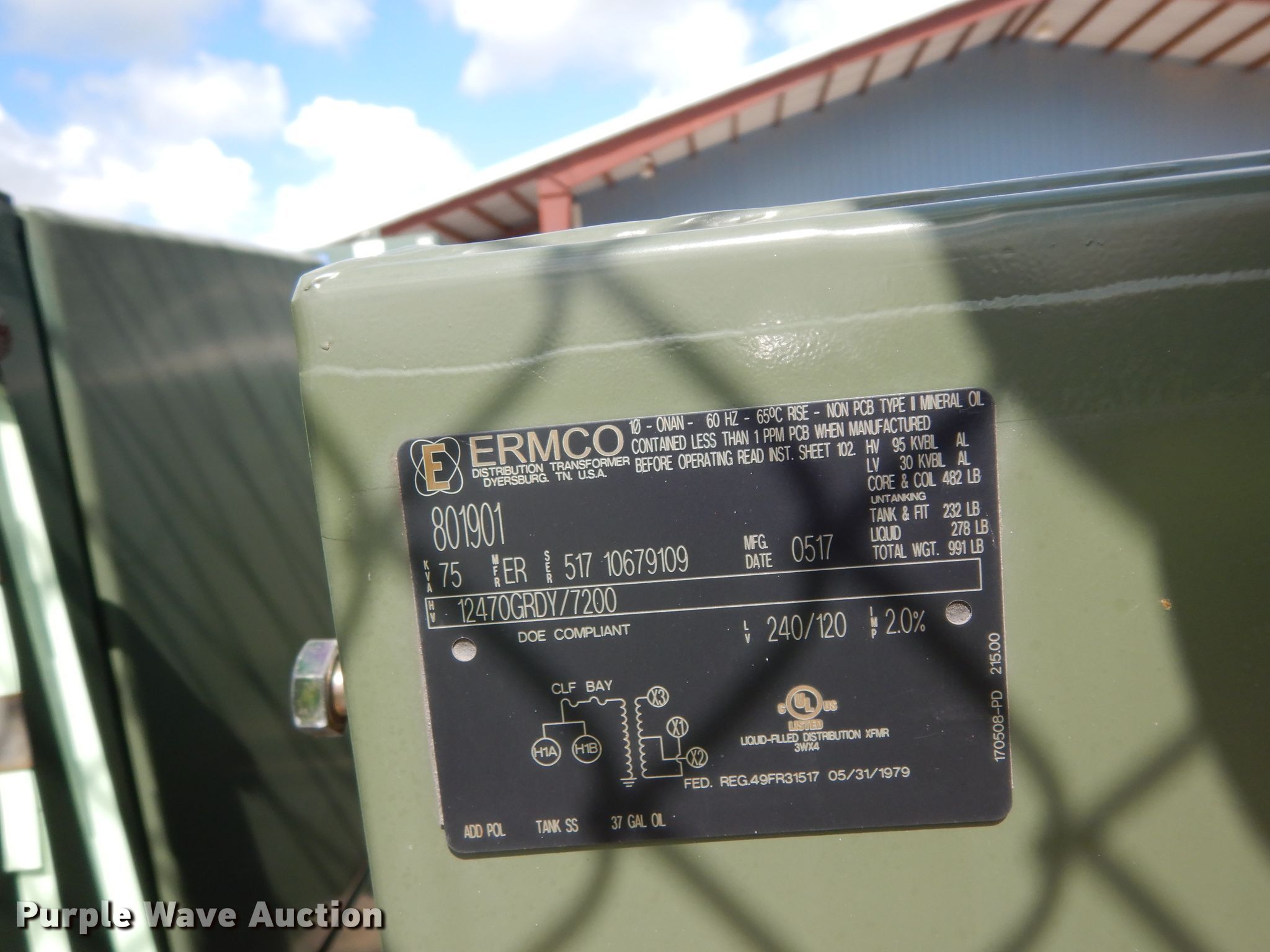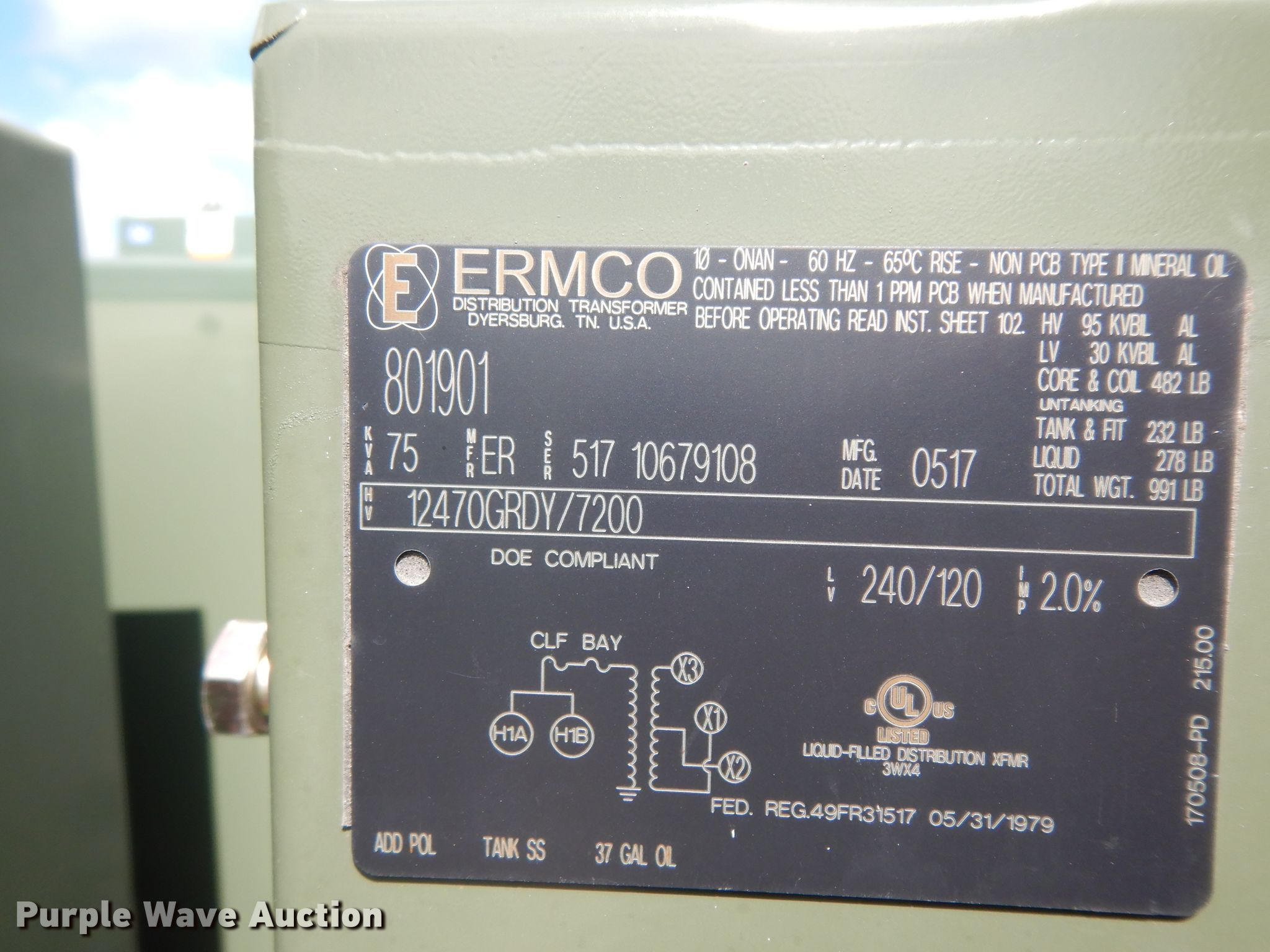 (2) Ermco stainless steel transformers. 75 kVA, Single phase, 240/120V, ID# 801901. Hunt Utility - Open inspection July 16. 3801 S Mayberry Rd. Mission, TX 78572