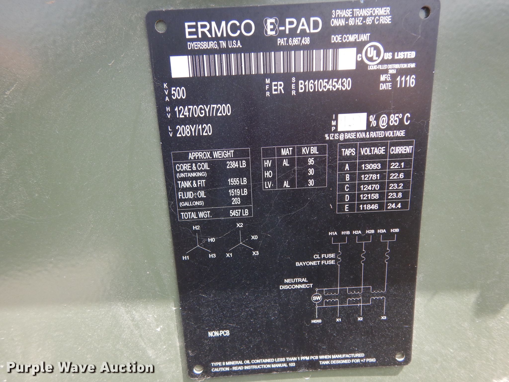 Purple Wave is selling a used Other Industrial or Business in Texas. This item is a (2) 2016 Ermco stainless steel transformers with the following: 500 kVA, Three phase, 208Y/120V, ID# 807130