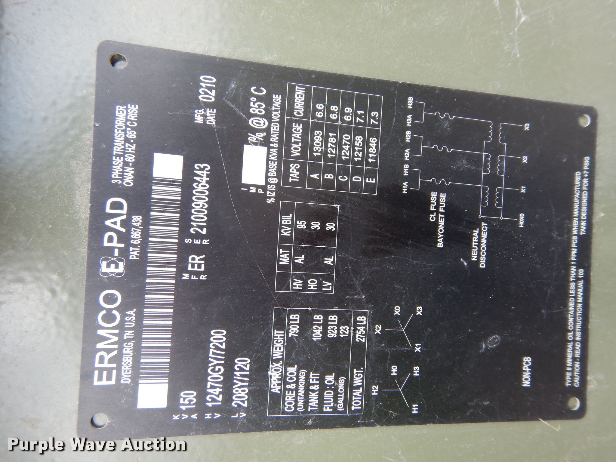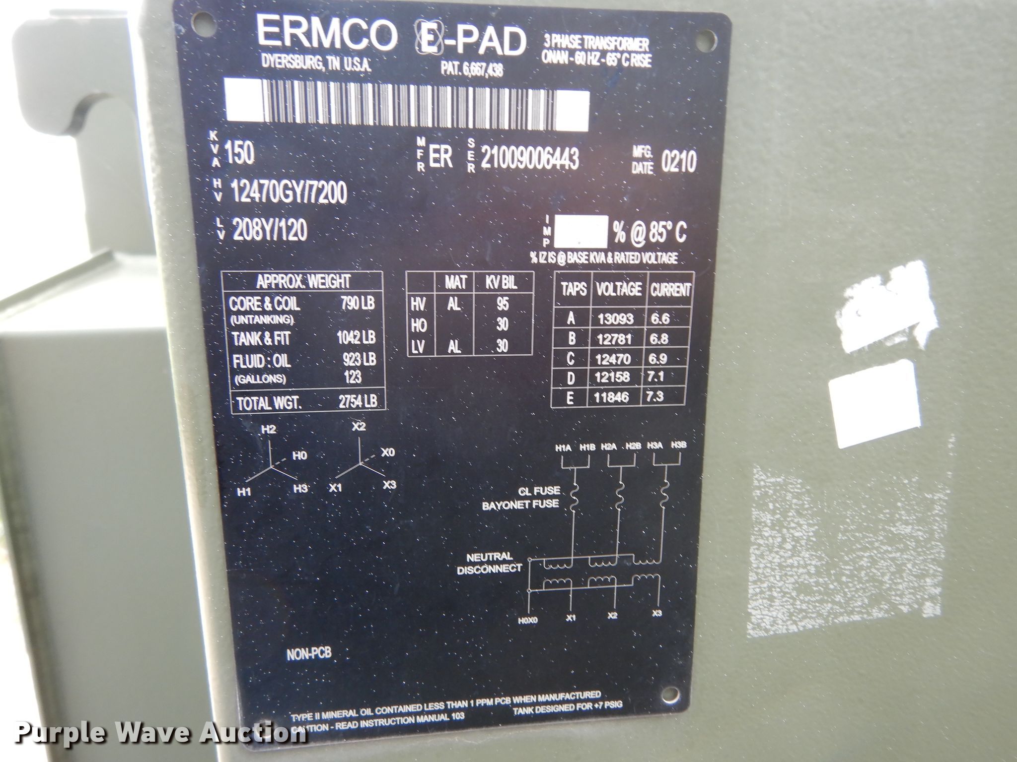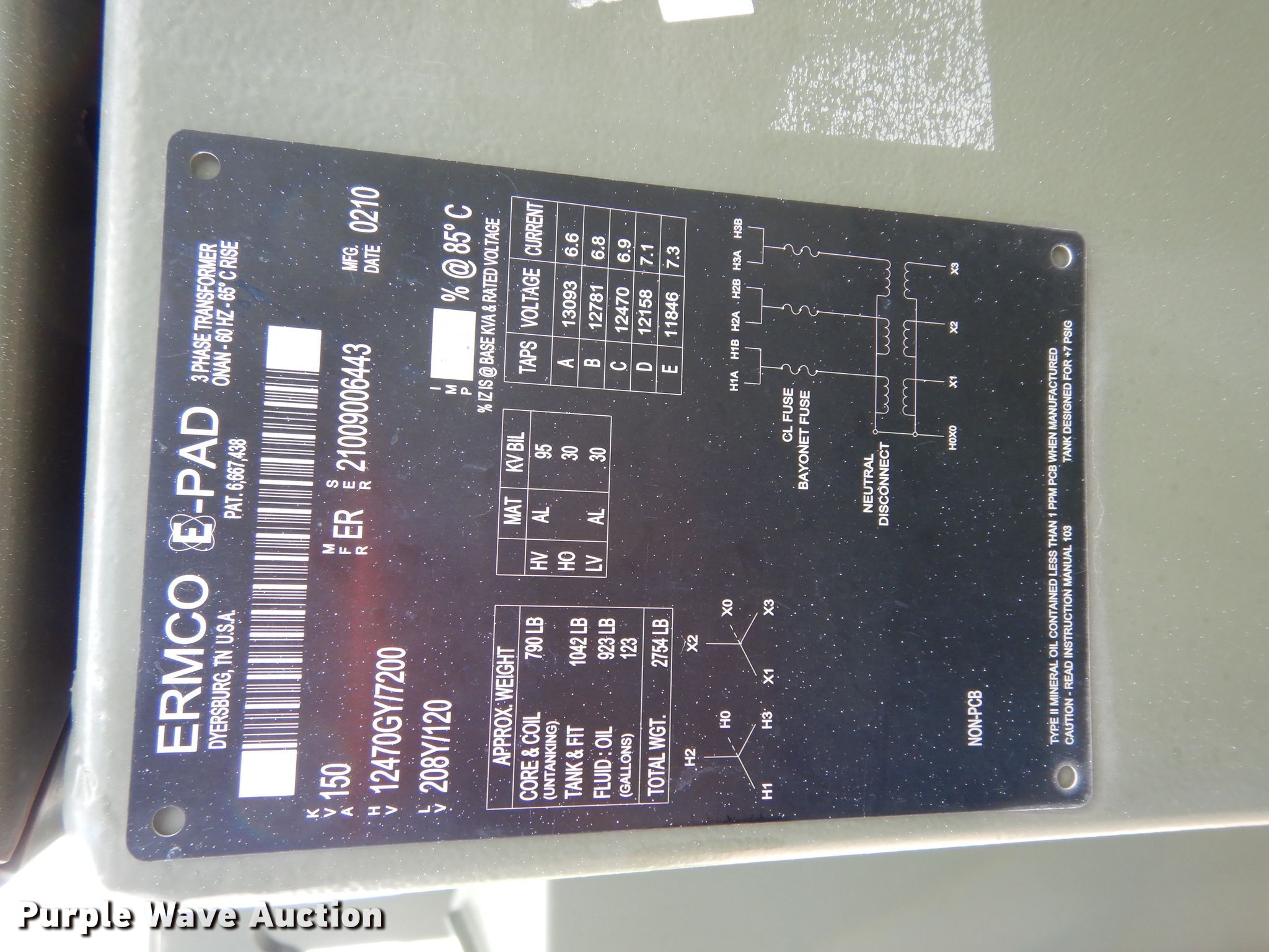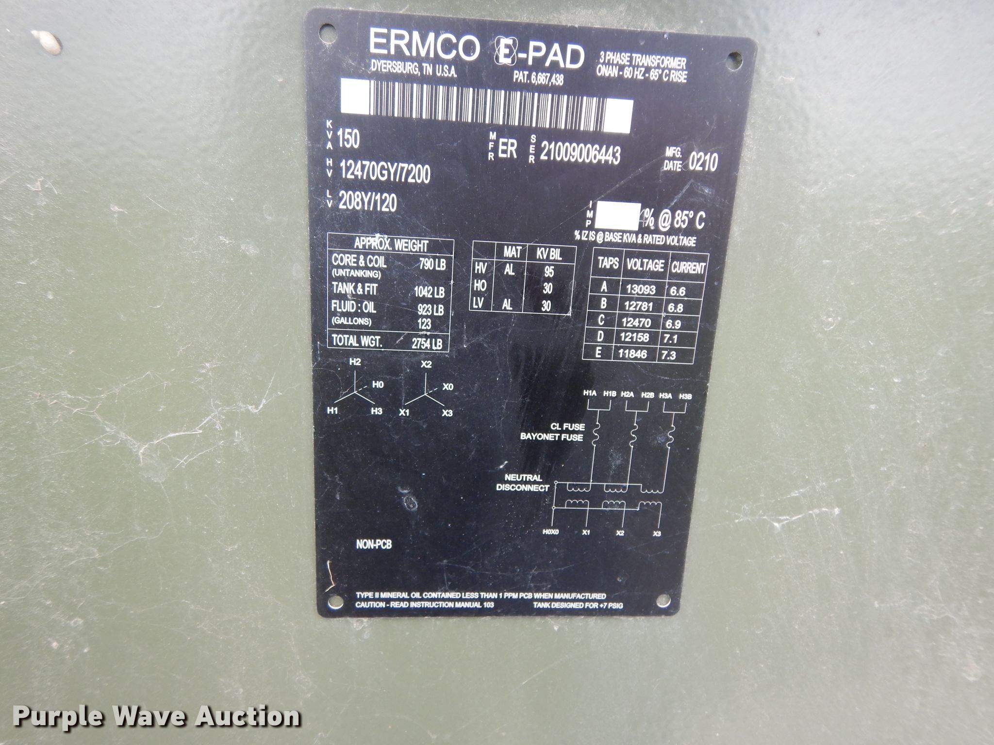 Purple Wave is selling a used Other Industrial or Business in Texas. This item is a 2010 Ermco transformer with the following: 150 kVA, Three phase, 208Y/120V, ID# 800653