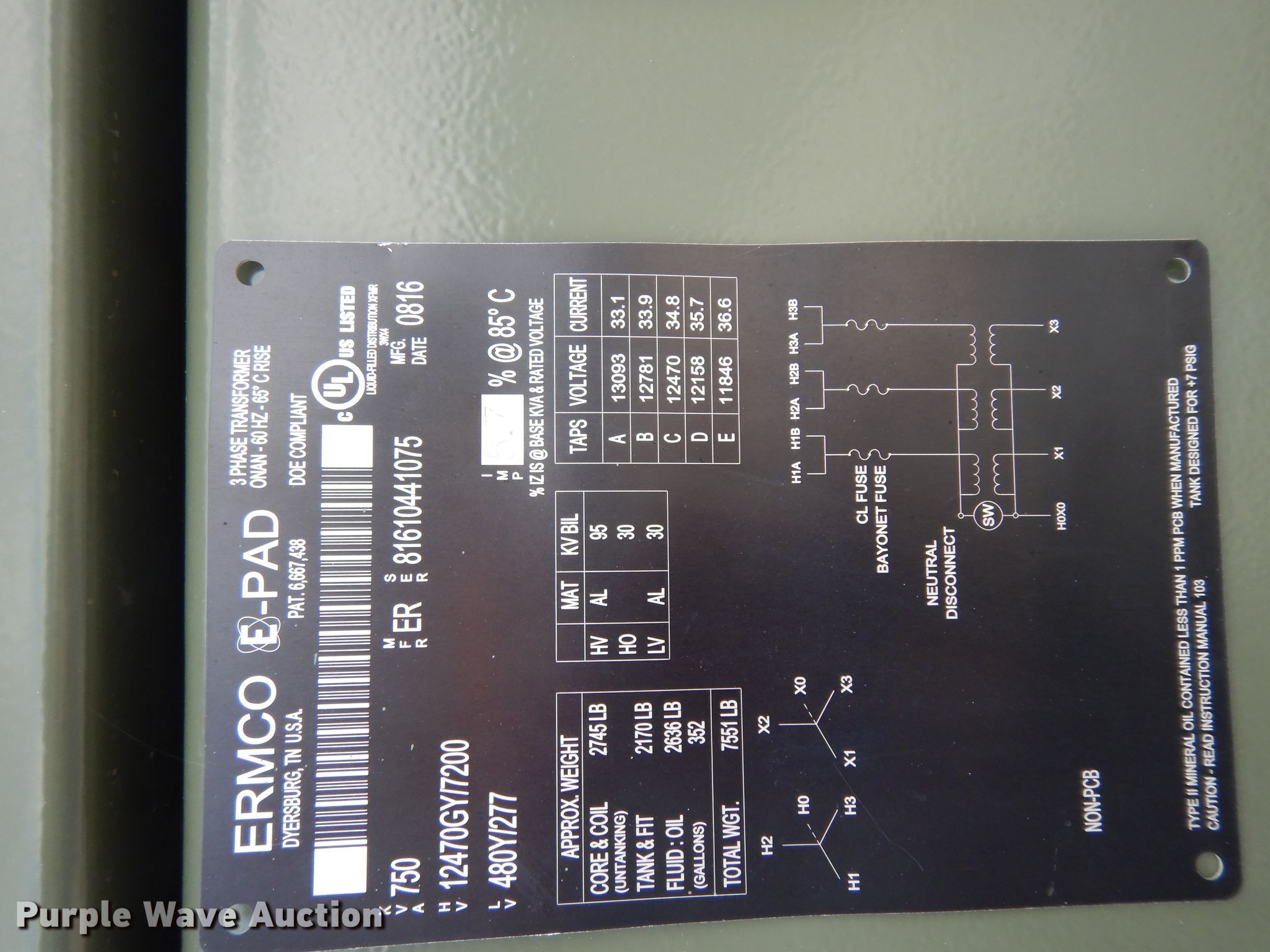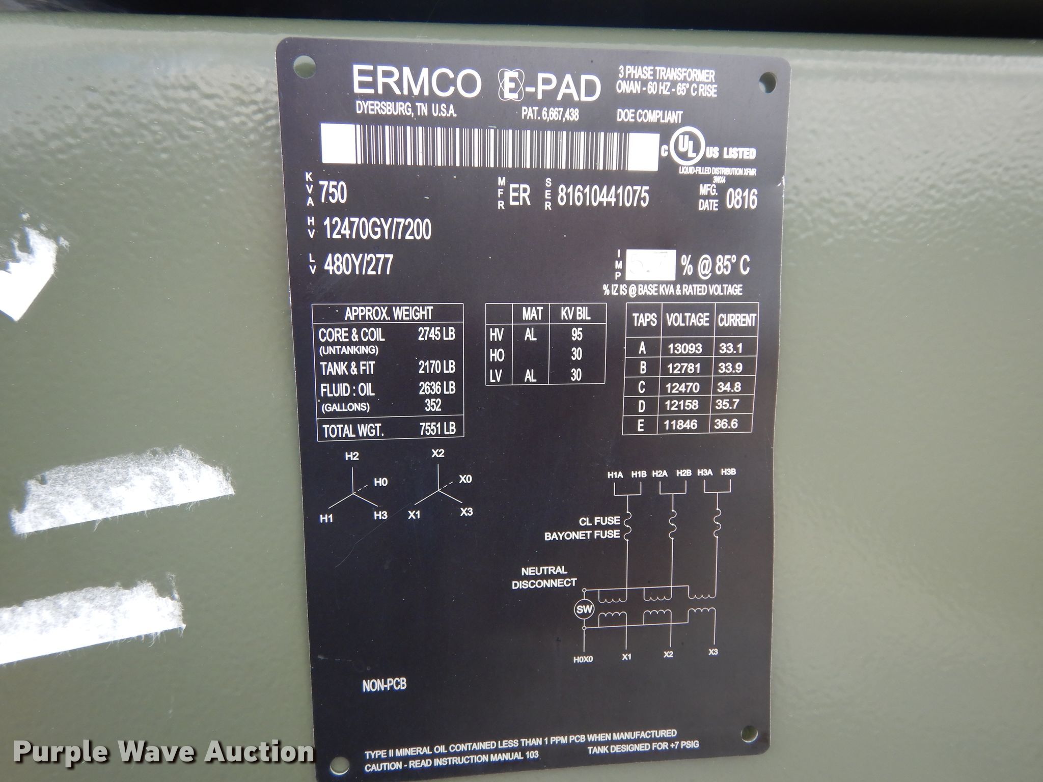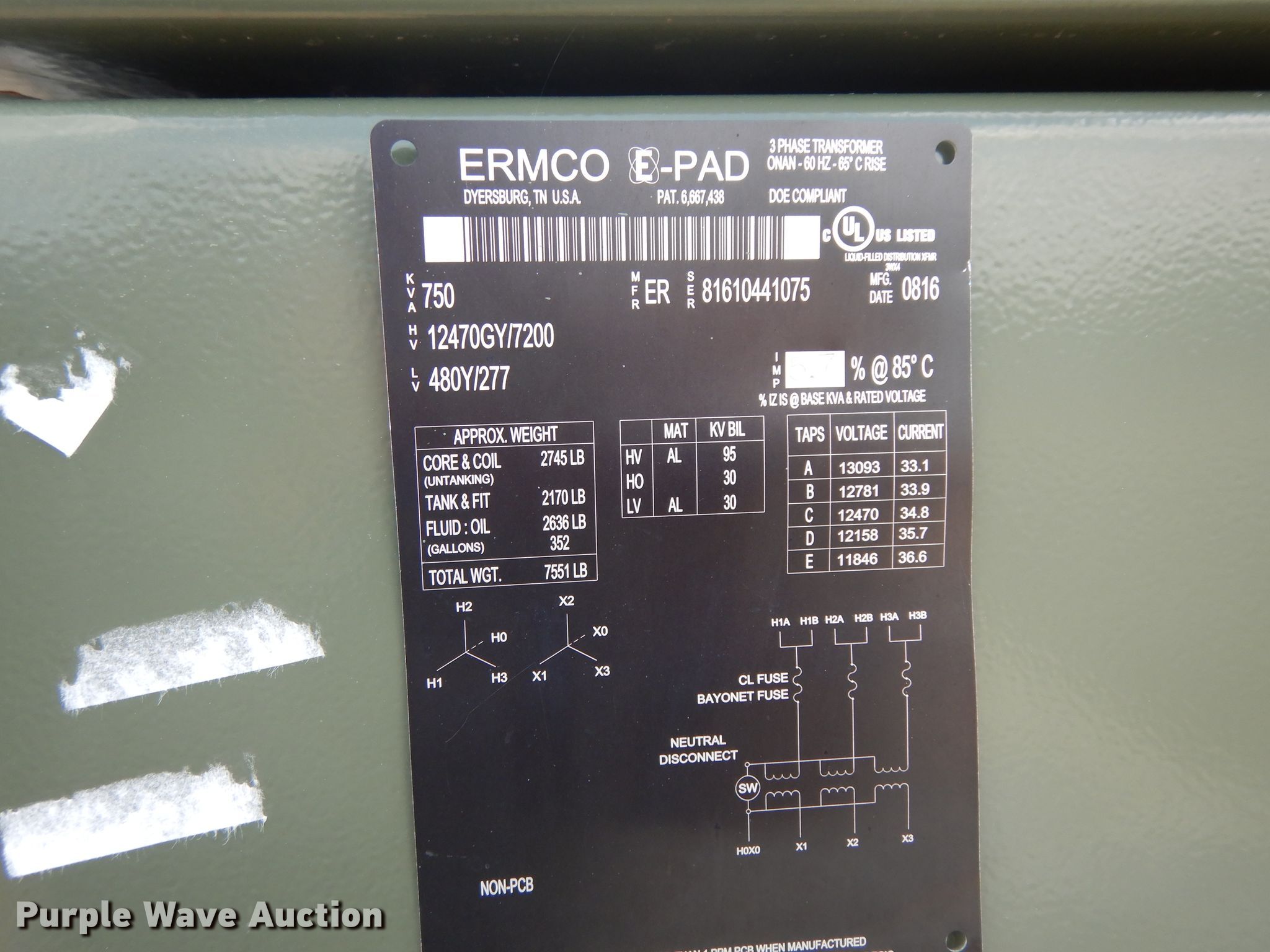 Purple Wave is selling a used Other Industrial or Business in Texas. This item is a 2016 Ermco transformer with the following: 750 kVA, Three phase, 480Y/277V, ID# 800661