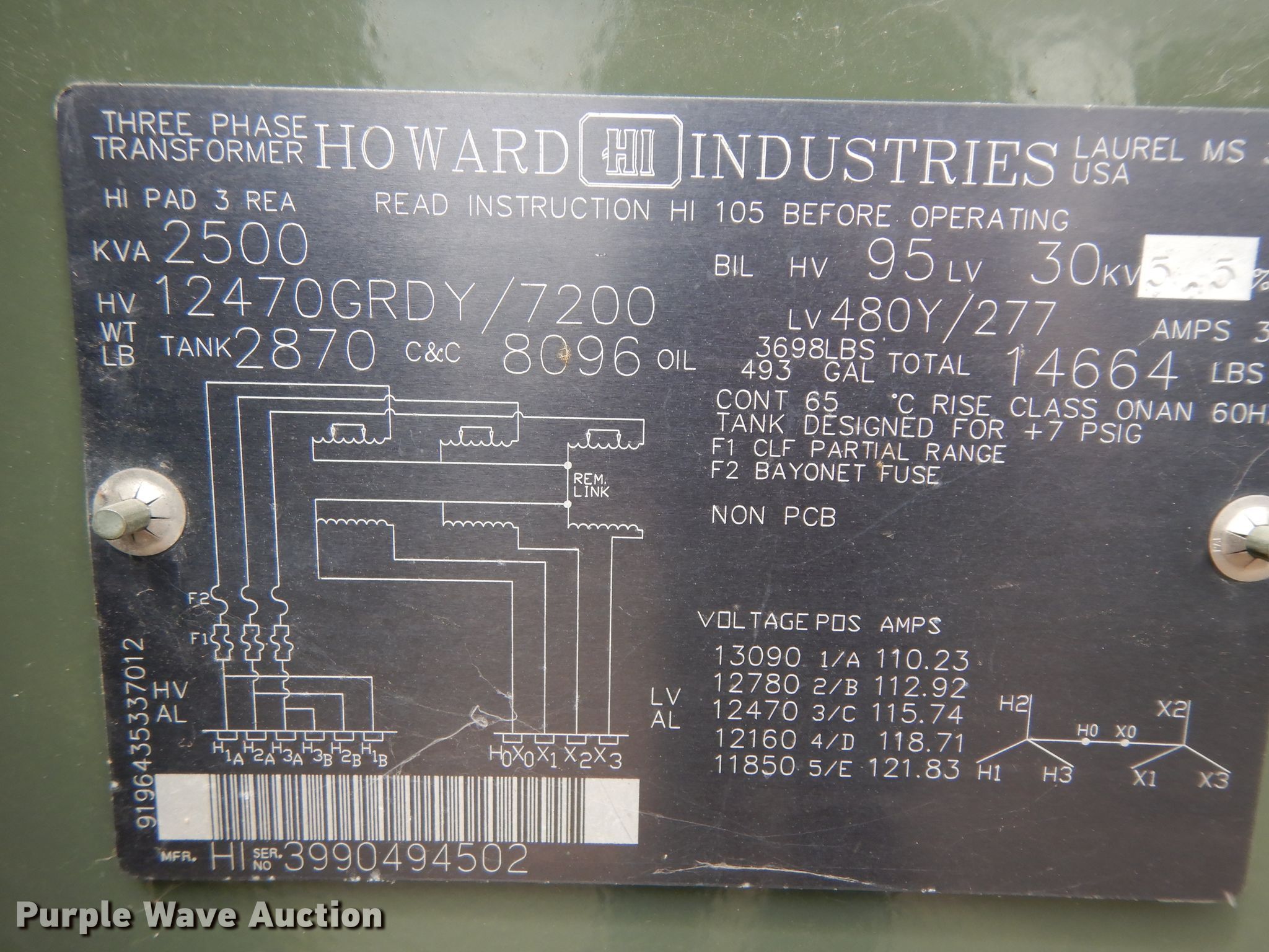 Purple Wave is selling a used Other Industrial or Business in Texas. This item is a Howard transformer with the following: 2,500 kVA, Three phase, 480Y/277V, 14,660 lbs weight, ID# 800652