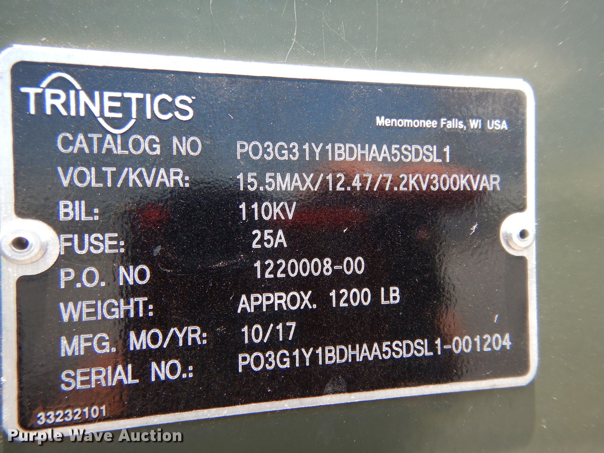 Purple Wave is selling a used Other Industrial or Business in Texas. This item is a (2) 2017 Trinetics SmartBank capacitor banks with the following: Volt/kVAR: 16.5MAX/12.47/7.2kV300kVAR, Bil: 95kV, Fuse: 26A, 12,000 lbs weight
