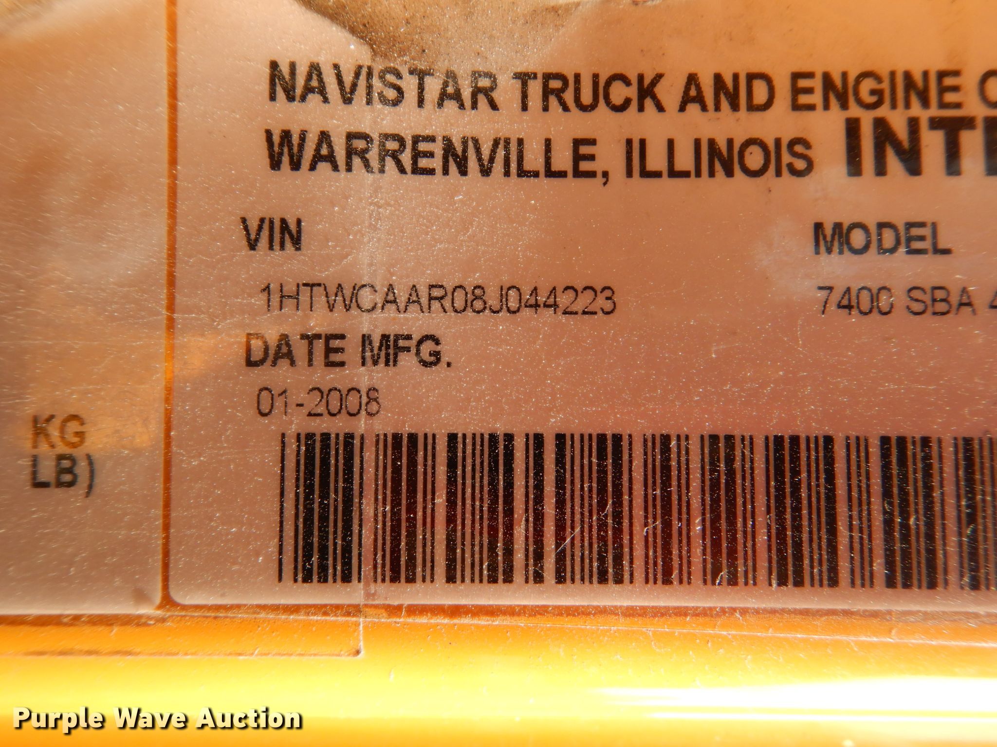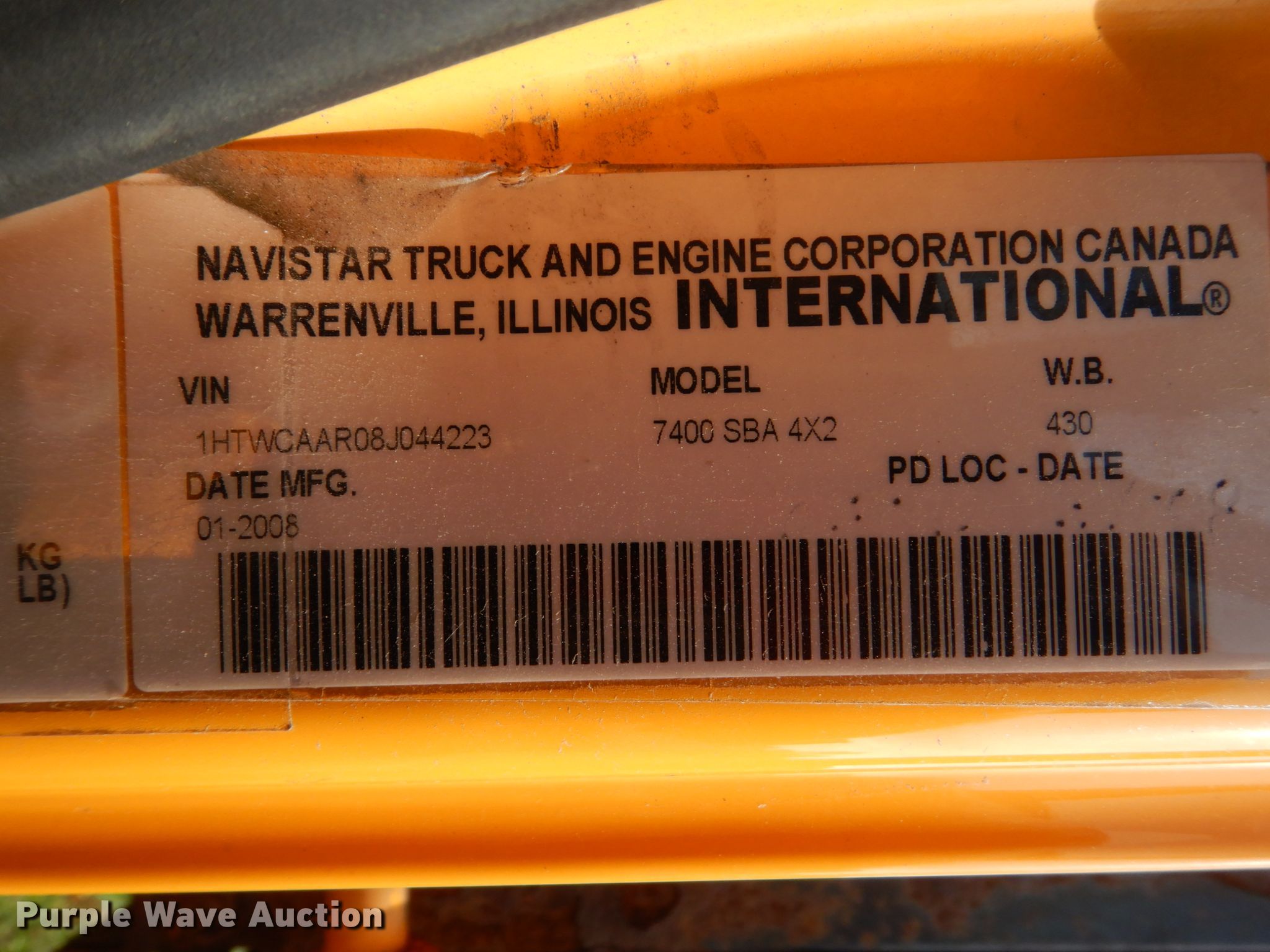 2008 International WorkStar 7400 dump truck. Unknown miles on odometer, Unit #: 51-34. Engine International GDT285, Displacement: 7.6L, Cylinders: 6, Fuel type: Diesel. Transmission Automatic. Chassis Double frame, Axles: Single, Suspension: Spring, Brakes: Air, PTO, GVWR: 41,000 lbs FAWR: 18,000 lbs, RAWR: 23,000 lbs. Interior AC, Heat, Heated mirrors, Cruise control. Operational Dump bed 13' L x 84" W, Side height: 36", Bed type: Steel, Spreader Monroe DM-132-86-48. Tires Size: 11R22.5. Notes Cylinder head cracked, Non-operational unit. South Dakota title. 1HTWCAAR08J044223. Sioux Falls Street Department - Open inspection July 23. 1000 E Chambers St.. Sioux Falls, SD 57104