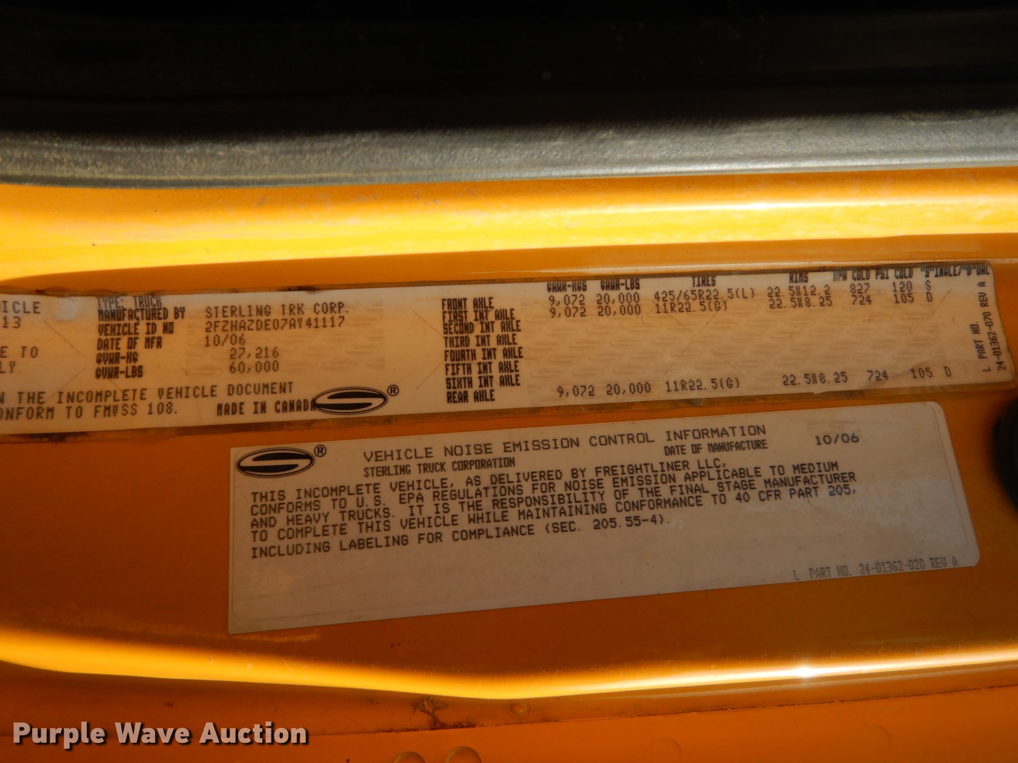 2007 Sterling L-Line vacuum truck. 76,990 miles on odometer, Unit #: 51-21. Engine Caterpillar C13, Displacement: 12.5L, Cylinders: 6, Fuel type: Diesel. Transmission Manual, Speed: 8. Chassis Axles: Tandem, Suspension: Spring, Brakes: Air, PTO, GVWR: 60,000 lbs. Interior AC, Heat, Heated mirrors, Cruise control. Operational Bed/ tank Vactor 2100, Rear manway, Rear outlet: 10in, Engine John Deere , Cylinders: 6, Fuel: Diesel, Hose reel Front, Hydraulic, Telescopic boom Diameter: 6".. Tires Front: 425/65R22.5, Rear: 11R22.5. Notes Inter-axle differential lock, Pony engine is inoperable. South Dakota title. 2FZHAZDE07AY41117. Sioux Falls Street Department - Open inspection July 23. 1000 E Chambers St.. Sioux Falls, SD 57104