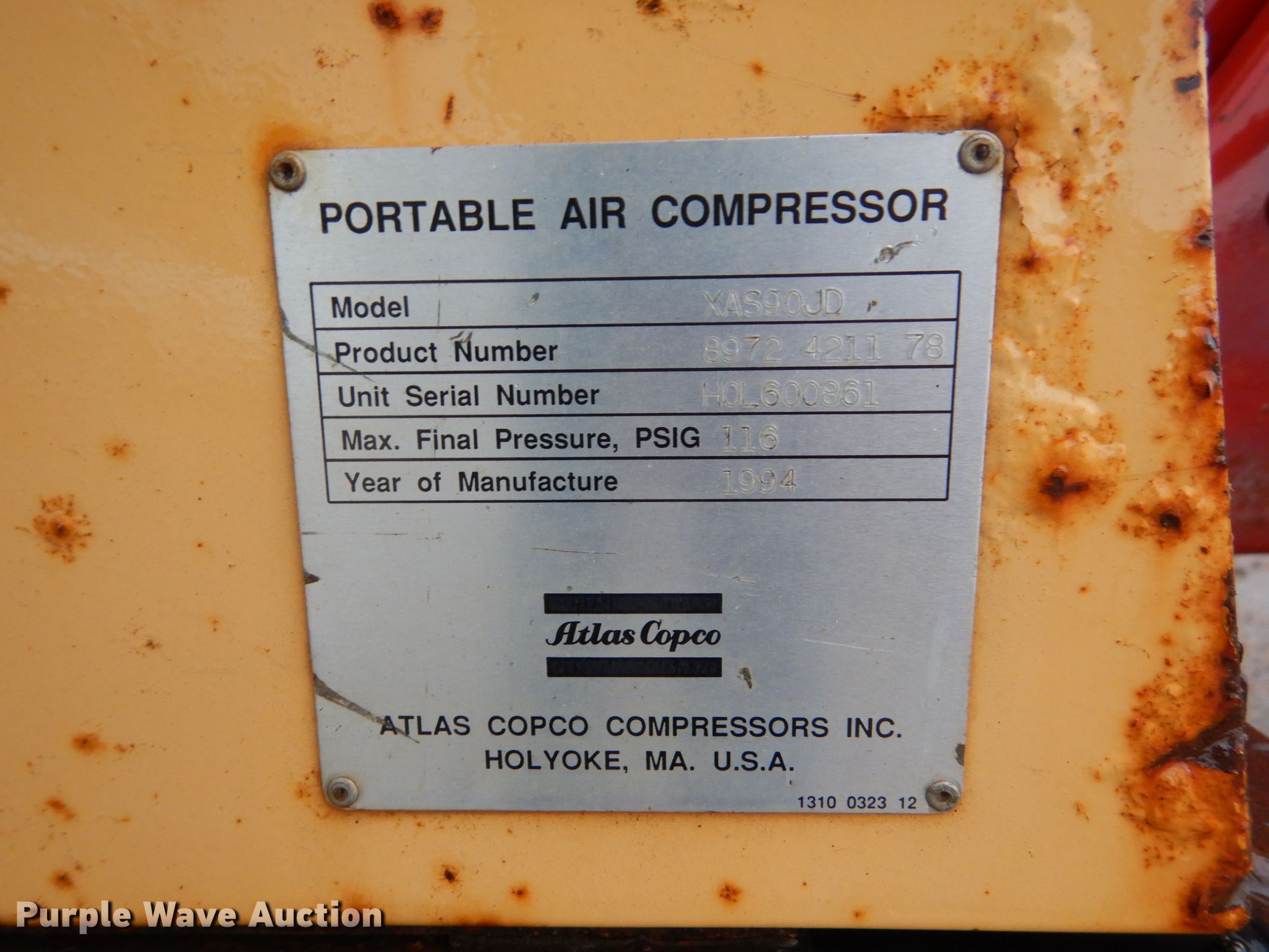 Purple Wave is selling a used Air Compressor in South Dakota. This item is a 1994 Atlas Copco XAS90JD air compressor with the following: 1,753 hours on meter, Serial: HOL600851, Unit #: 51-47
