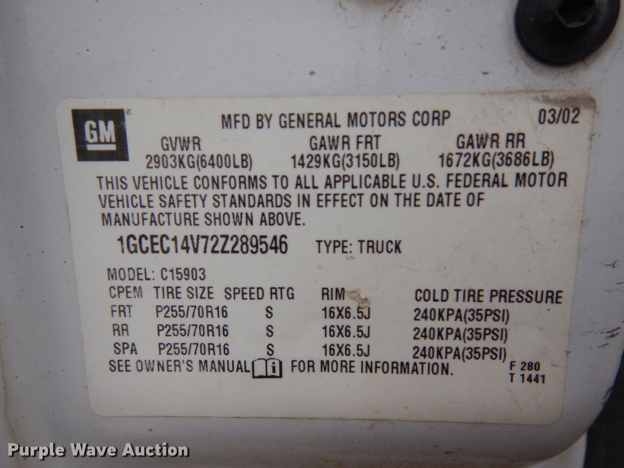 2002 Chevrolet Silverado 1500 pickup truck. 112,815 miles on odometer, Unit #: 51-9. Engine Displacement: 4.8L V8 OHV 16V, Cylinders: 8, Fuel type: Gas. Transmission Automatic. Interior AC, Heat. Operational Tommy gate end gate lift. Tires Size: 255/70R16. South Dakota title. Title distribution may be delayed up to 14 days from verification of funds. 1GCEC14V72Z289546. Sioux Falls Street Department - Open inspection July 23. 1000 E Chambers St.. Sioux Falls, SD 57104
