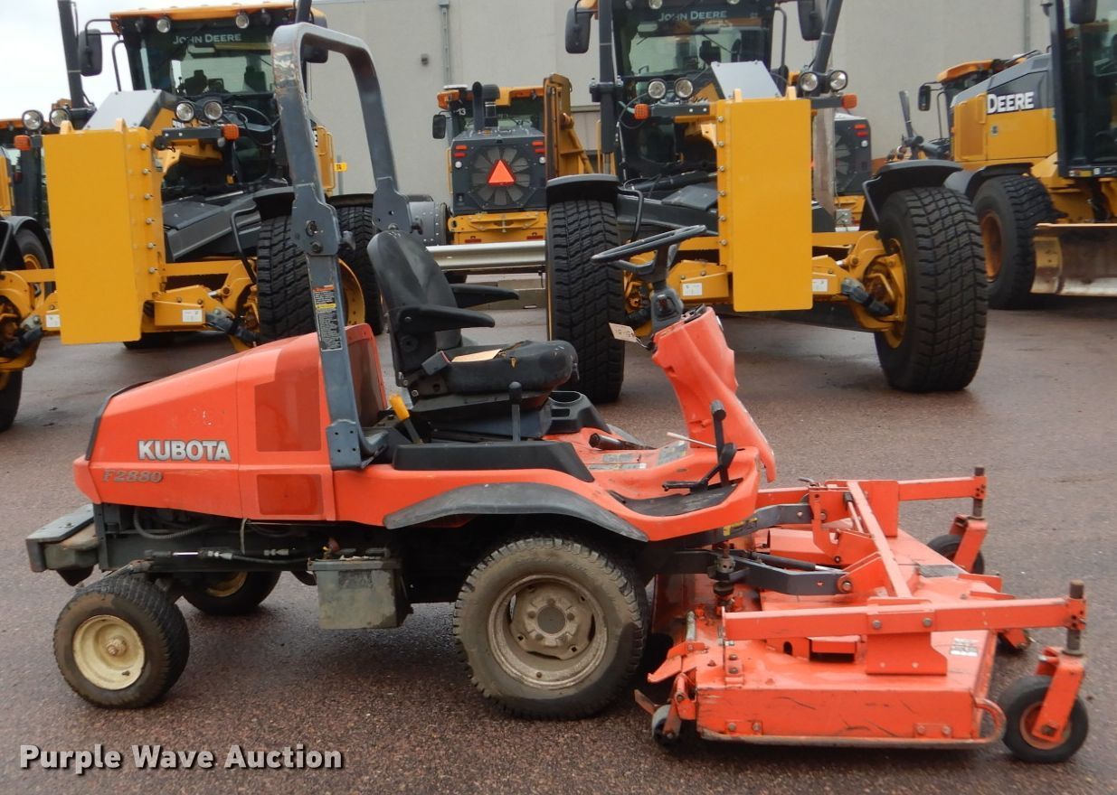 Purple Wave is selling a used Commercial Turf Mower in South Dakota. This item is a 2007 Kubota F2880 lawn mower with the following: 1,941 hours on meter, 72"W deck, Kubota three cylinder diesel engine, Hydrostatic transmission, OROPS, Hydraulic front deck lift, 23 x 10.5-12 front tires, 16 x 8.50-8 rear tires, Deck will not engage, Non-operational unit, Unit# 51-51