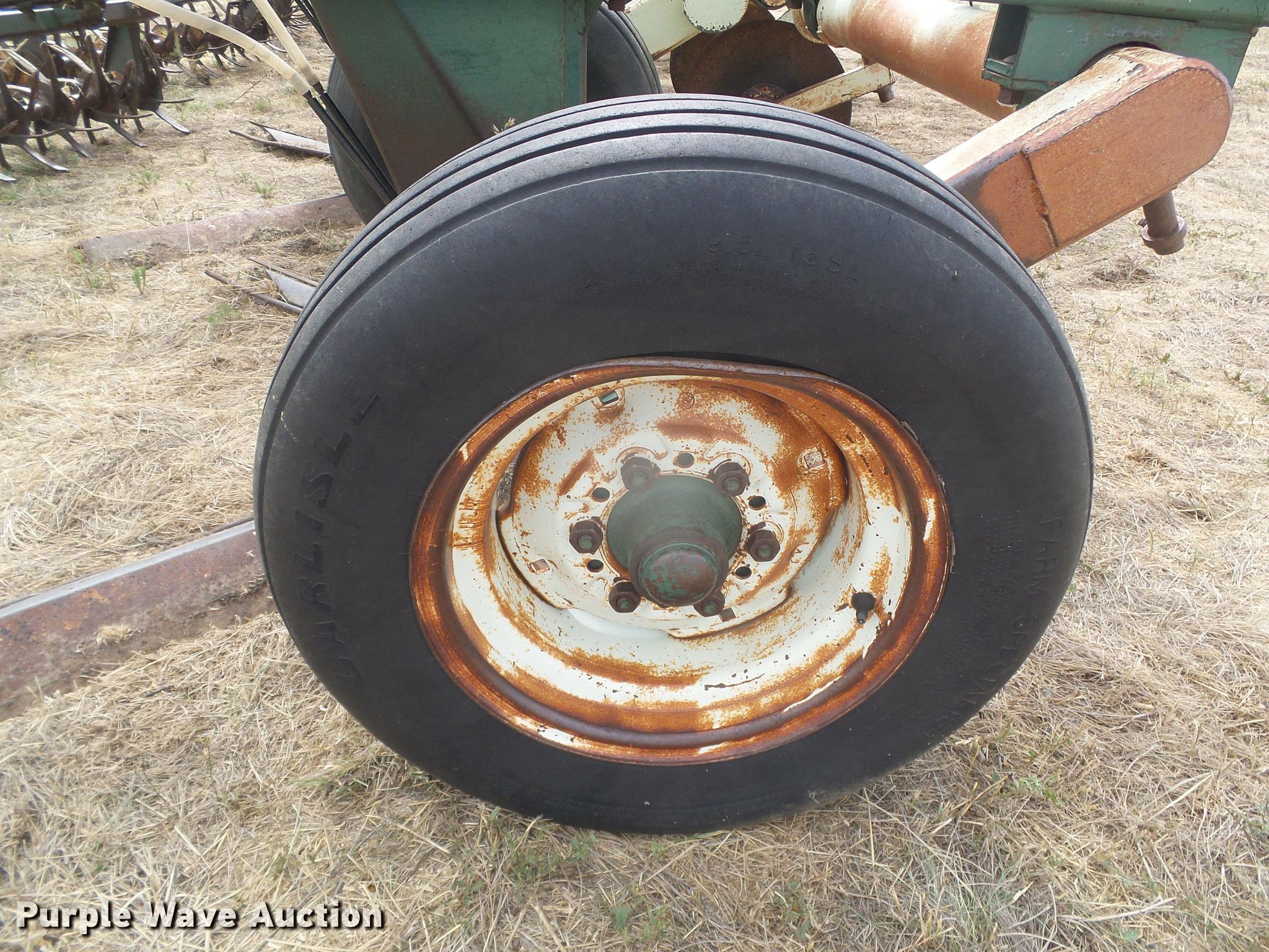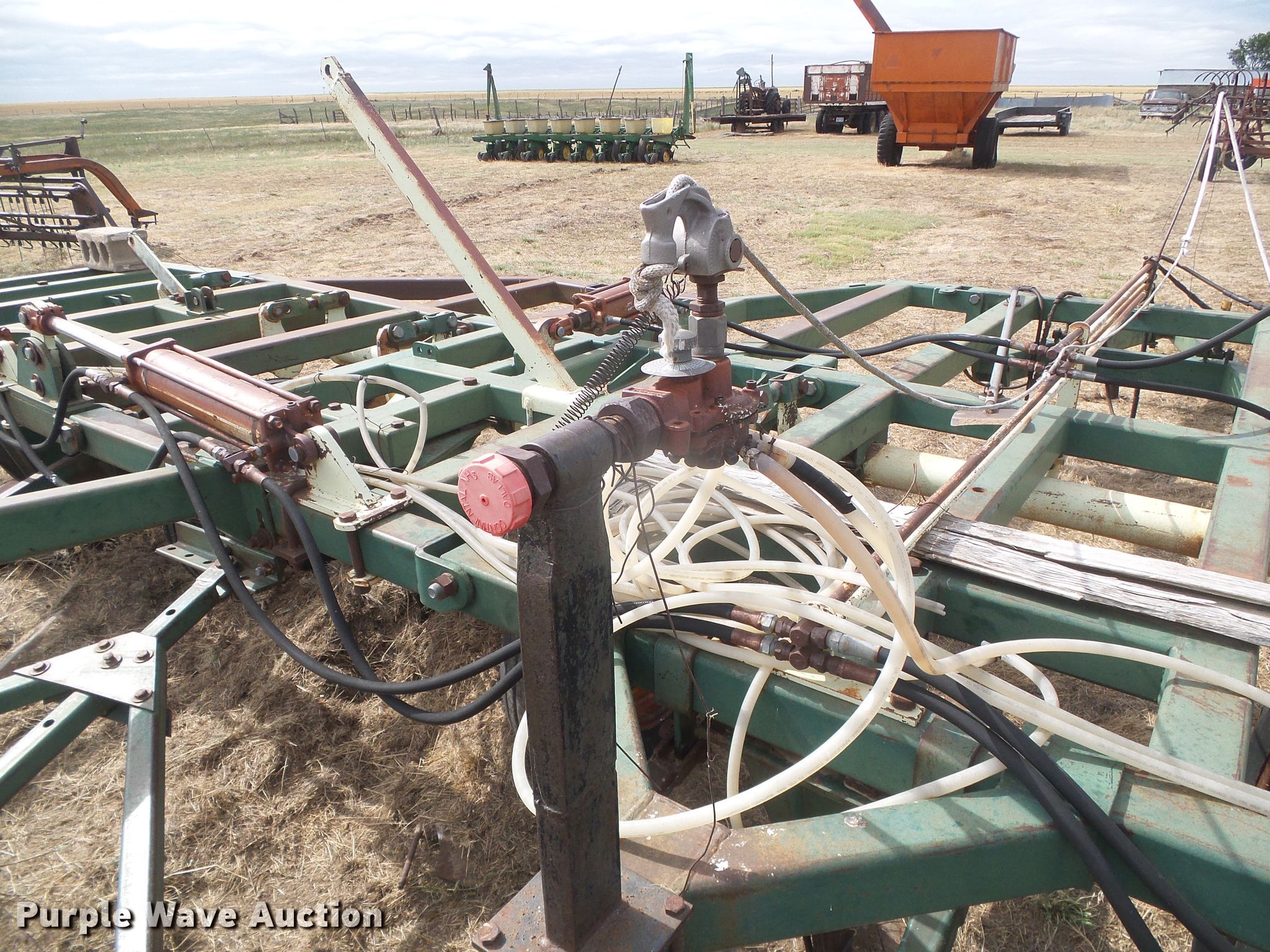 Purple Wave is selling a used Field Cultivator or Sweep Plow in Kansas. This item is a Flex King 7X5 sweep plow with the following: 35'W, (7) approx. 59.5"W sweeps, Rolling pickets/treader, Manual leveler, Hydraulic lift and fold, 9.5L-15 tires, Center tire flat, needs to be replaced, Serial 4708