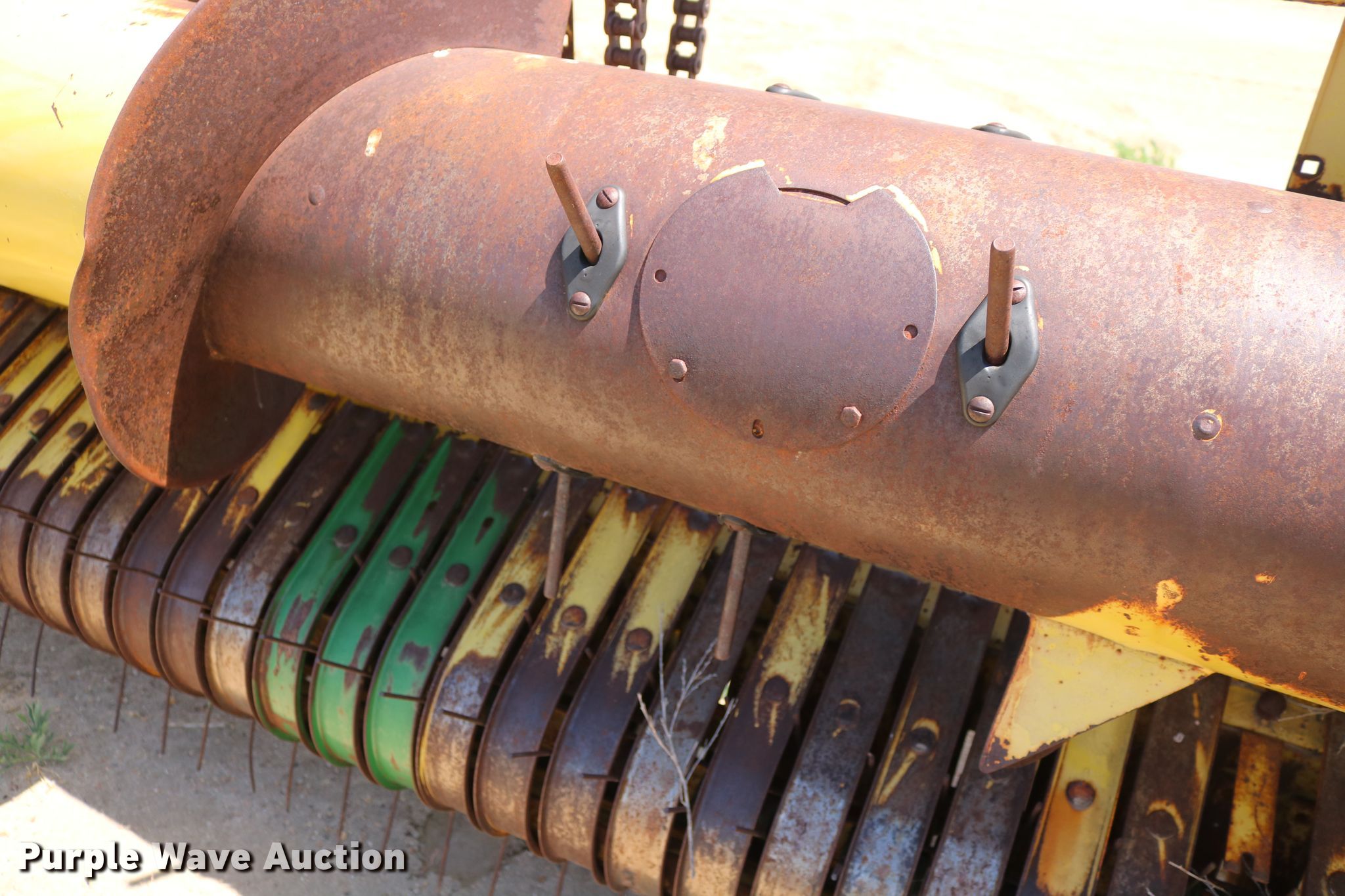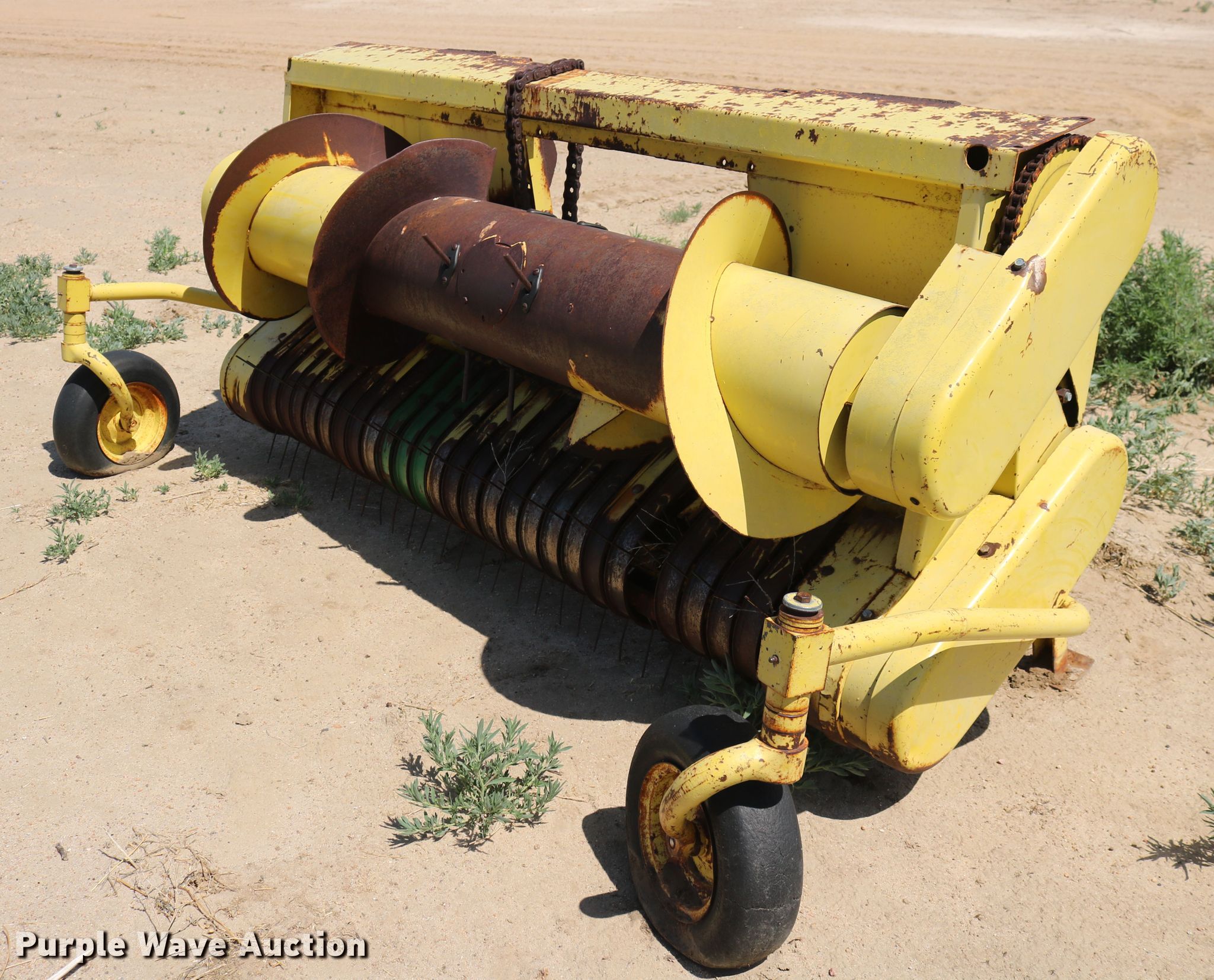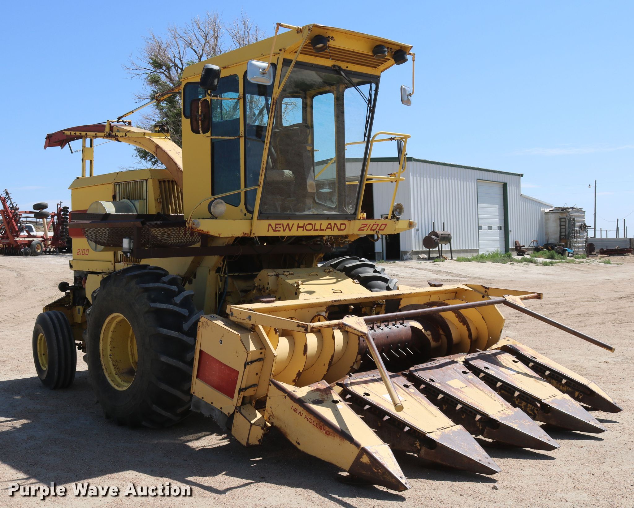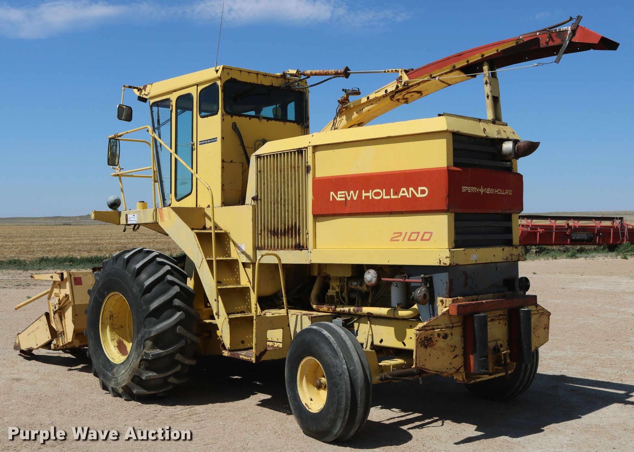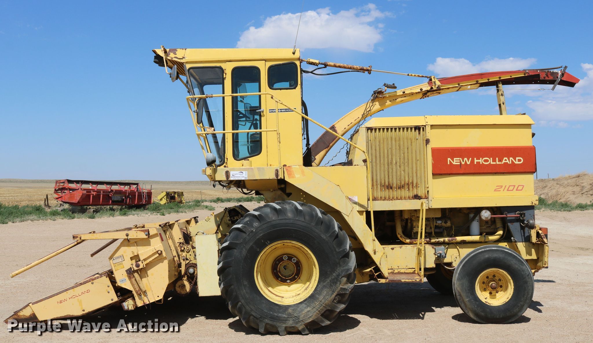 Purple Wave is selling a used Forage Harvester in Colorado. This item is a 1981 New Holland 2100 forage harvester with the following: 881 cutter hours on meter, Caterpillar 3406 six cylinder diesel engine, Serial 90U12522, Hydrostatic transmission, 4F-4R gears, AC, Metal detector, Hydraulic adjust spout, New Holland 989A4 corn head, 10'W, Four rows, 30" row spacing, Single driveline, Serial 498817, John Deere pickup head, 6'W, Gauge wheels, Single driveline, Serial 188953, Rear hitch, 23.1-26 front tires, 11.00-16 rear tires, Operator manual, Additional parts and spout, Metal detector needs re-calibrated/adjusted, Serial 459070