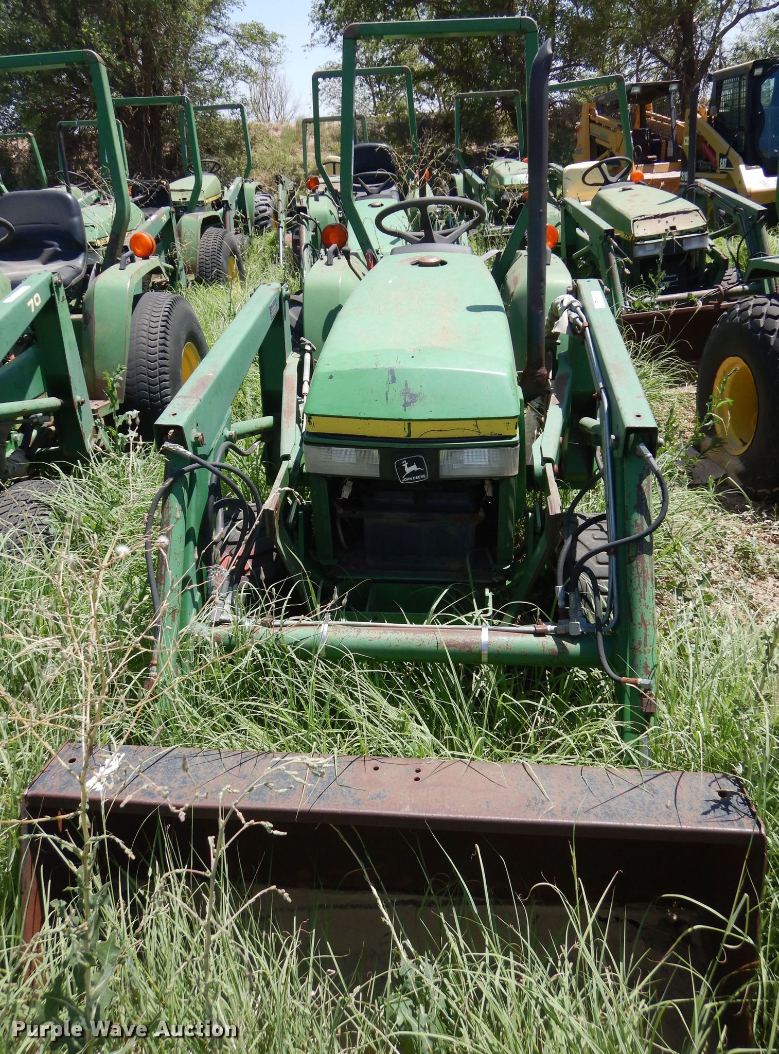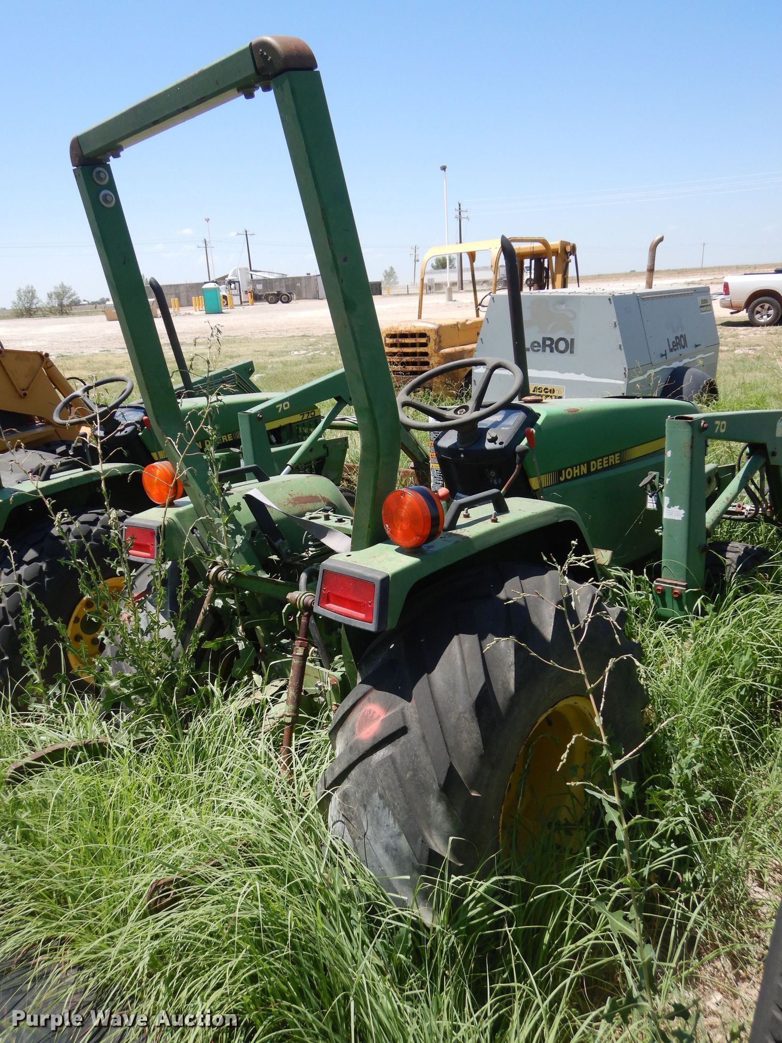 John Deere 770 tractor. 1,521 hours on meter, Serial: M00770A141655. Engine Cylinders: 3, Fuel type: Diesel. Transmission Manual, 4F - 1R. Operational PTO: 540, Three point, Loader John Deere 70, Controls: Joystick, Bucket Width: 48".. Tires Front: 25x8.50-14, Rear: 13.50-16. Notes Unknown operating condition. Seaboard Foods. Optima, OK 73945