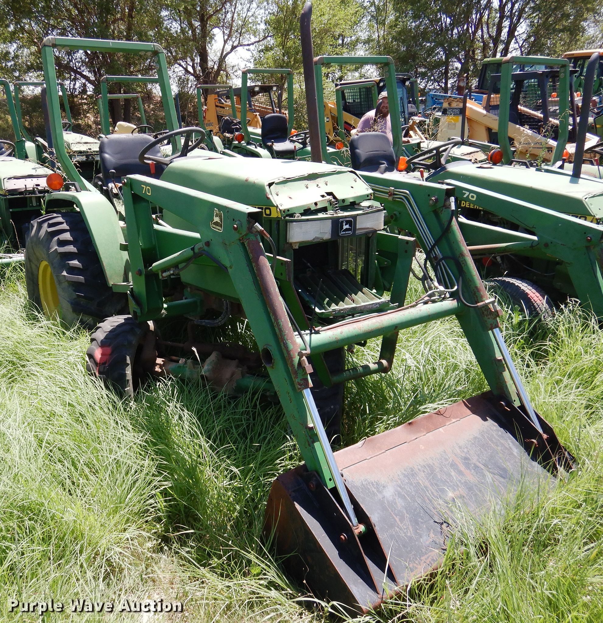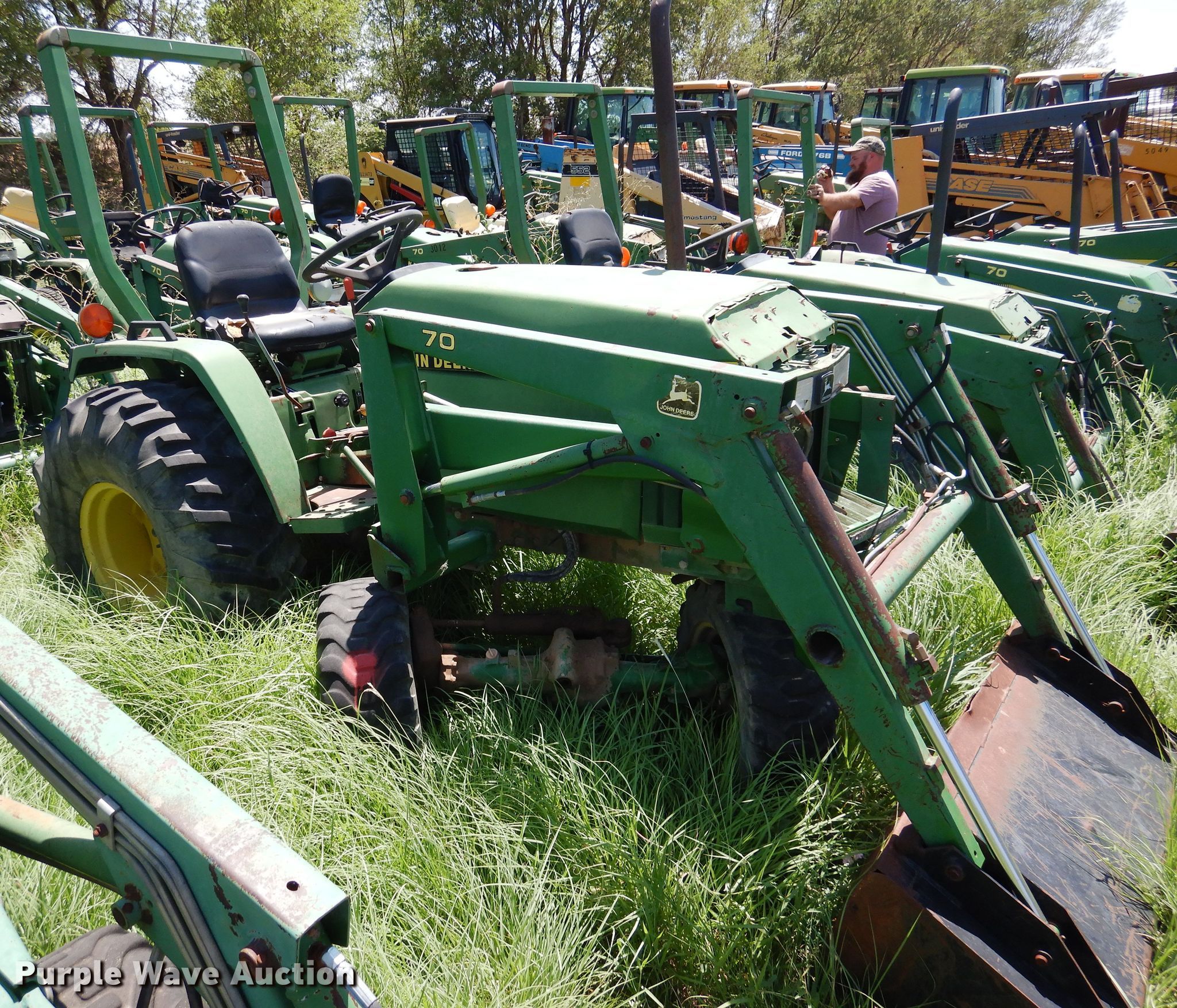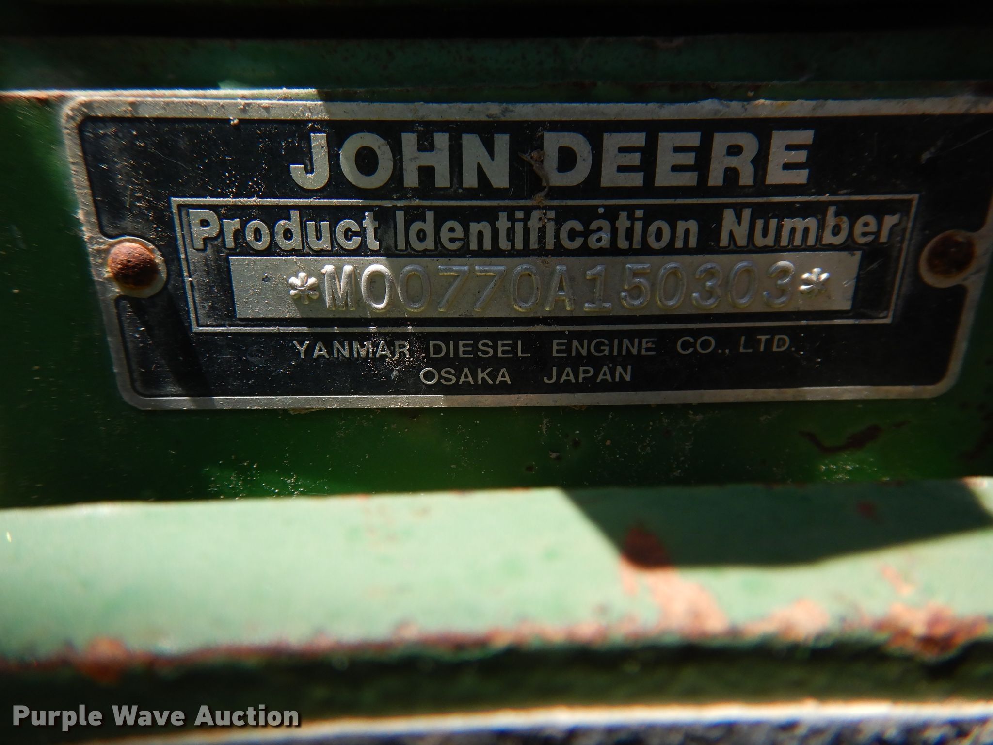 John Deere 770 tractor. 1,547 hours on meter, Serial: M00770A150303. Engine Cylinders: 3, Fuel type: Diesel. Transmission Manual, 4F - 1R. Operational PTO: 540, Three point, Loader John Deere 70, Bucket Width: 48".. Tires Front: 8.50-14, Rear: 13.50-16.1. Notes Front axle unmounted, Unknown operating condition. Seaboard Foods. Optima, OK 73945