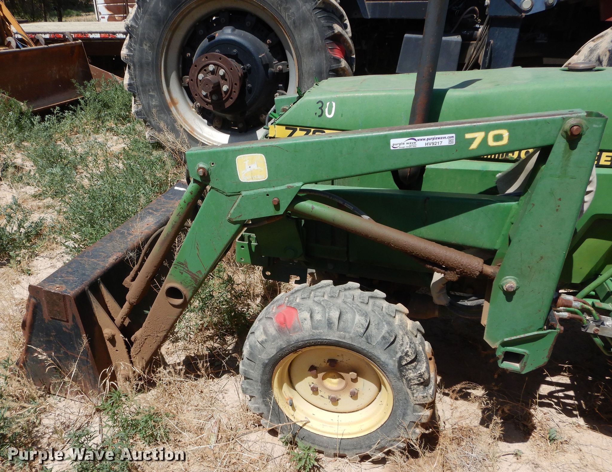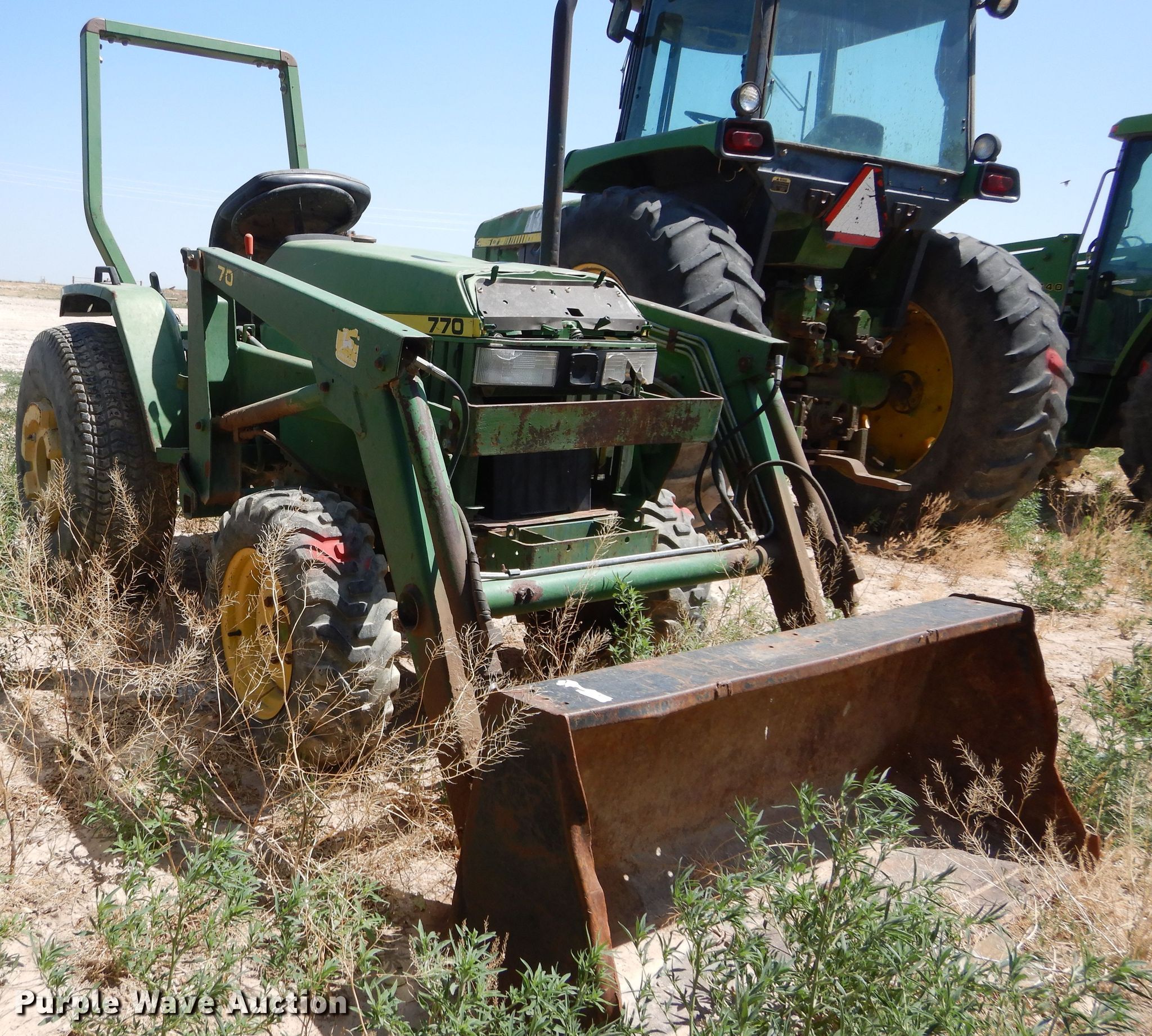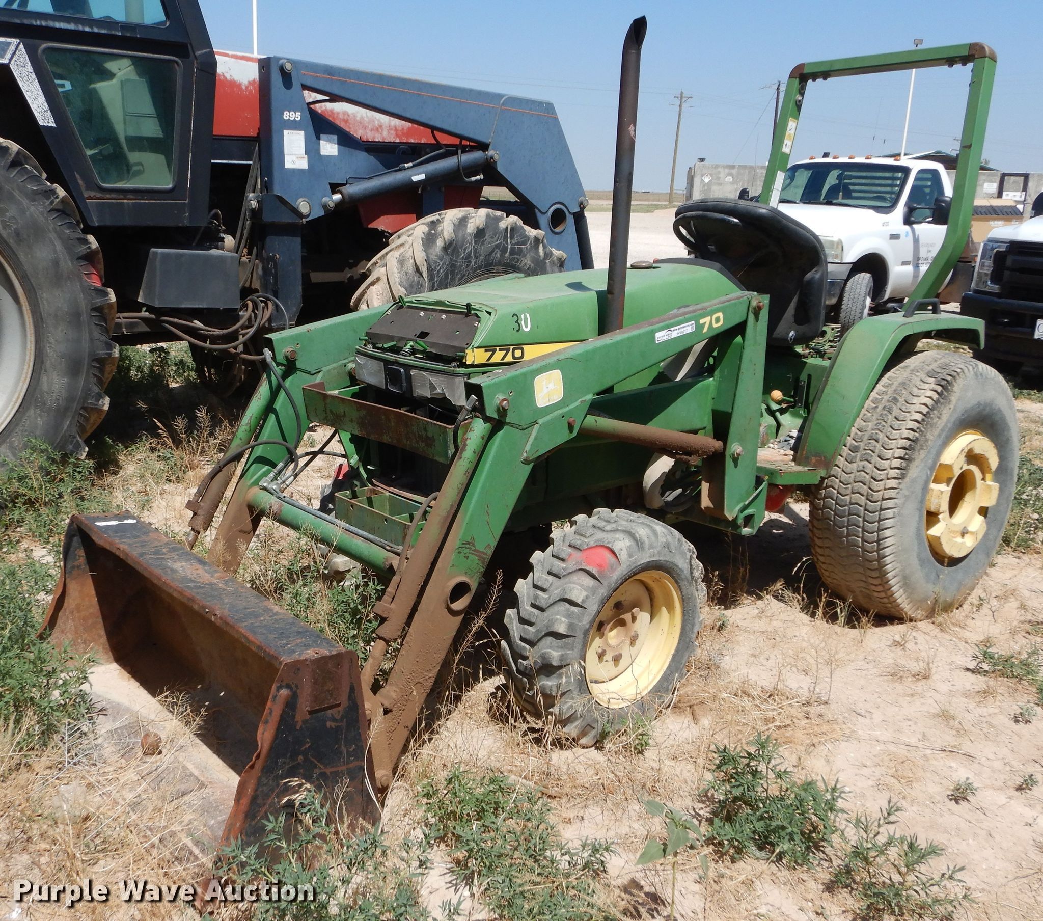 John Deere 770 tractor. Unknown hours on meter, Serial: M00770A141683. Engine John Deere , Cylinders: 3, Fuel type: Diesel. Transmission Manual, 4F - 1R. Operational PTO: 540. Tires Front: 25x9.50-14, Rear: 13.6-16. Notes Non-operational hour meter, Unknown operating condition. Seaboard Foods. Optima, OK 73945