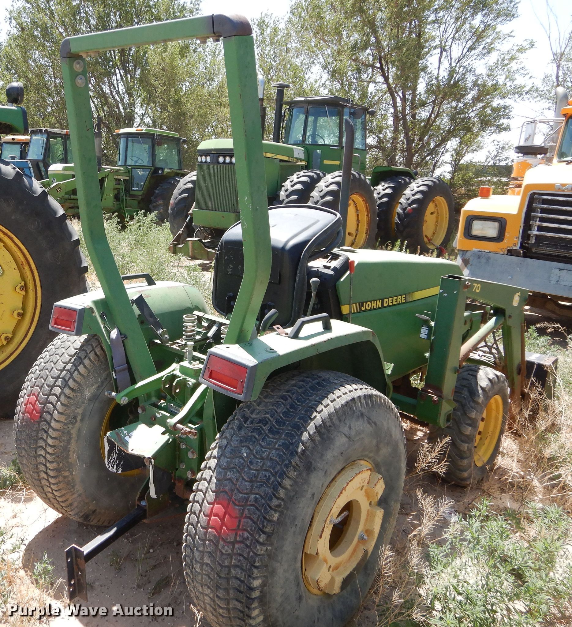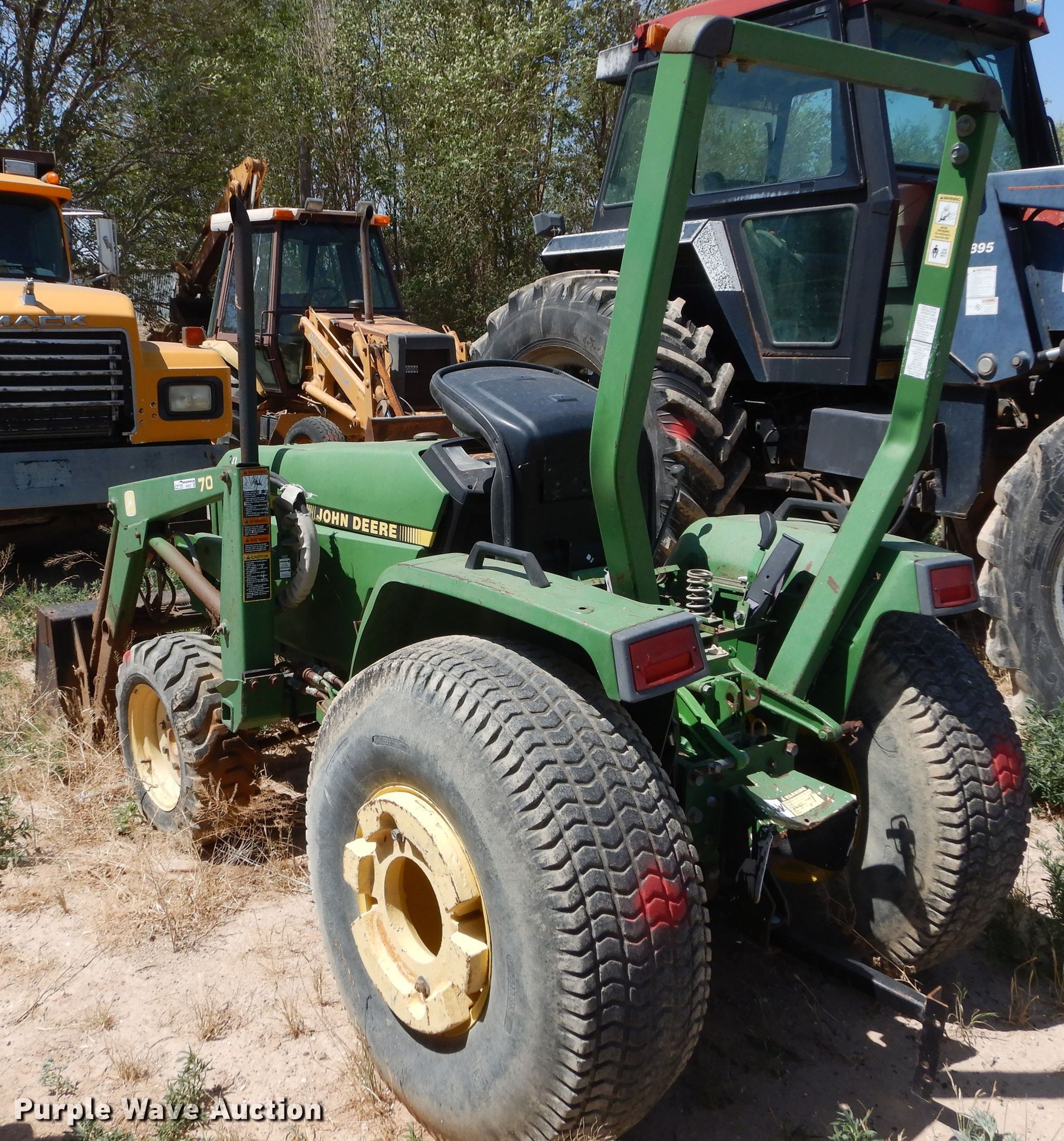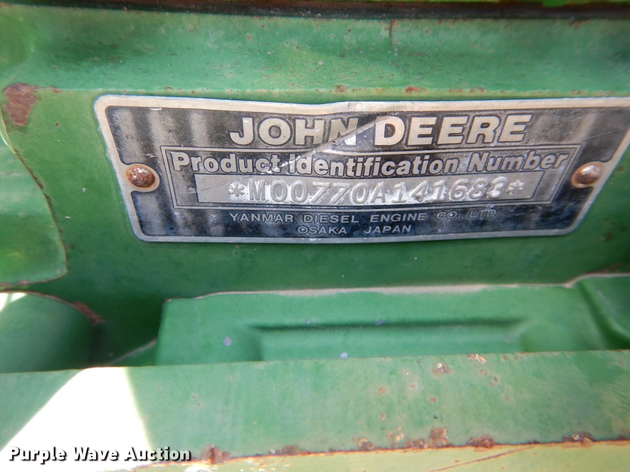 John Deere 770 tractor. Unknown hours on meter, Serial: M00770A141683. Engine John Deere , Cylinders: 3, Fuel type: Diesel. Transmission Manual, 4F - 1R. Operational PTO: 540. Tires Front: 25x9.50-14, Rear: 13.6-16. Notes Non-operational hour meter, Unknown operating condition. Seaboard Foods. Optima, OK 73945