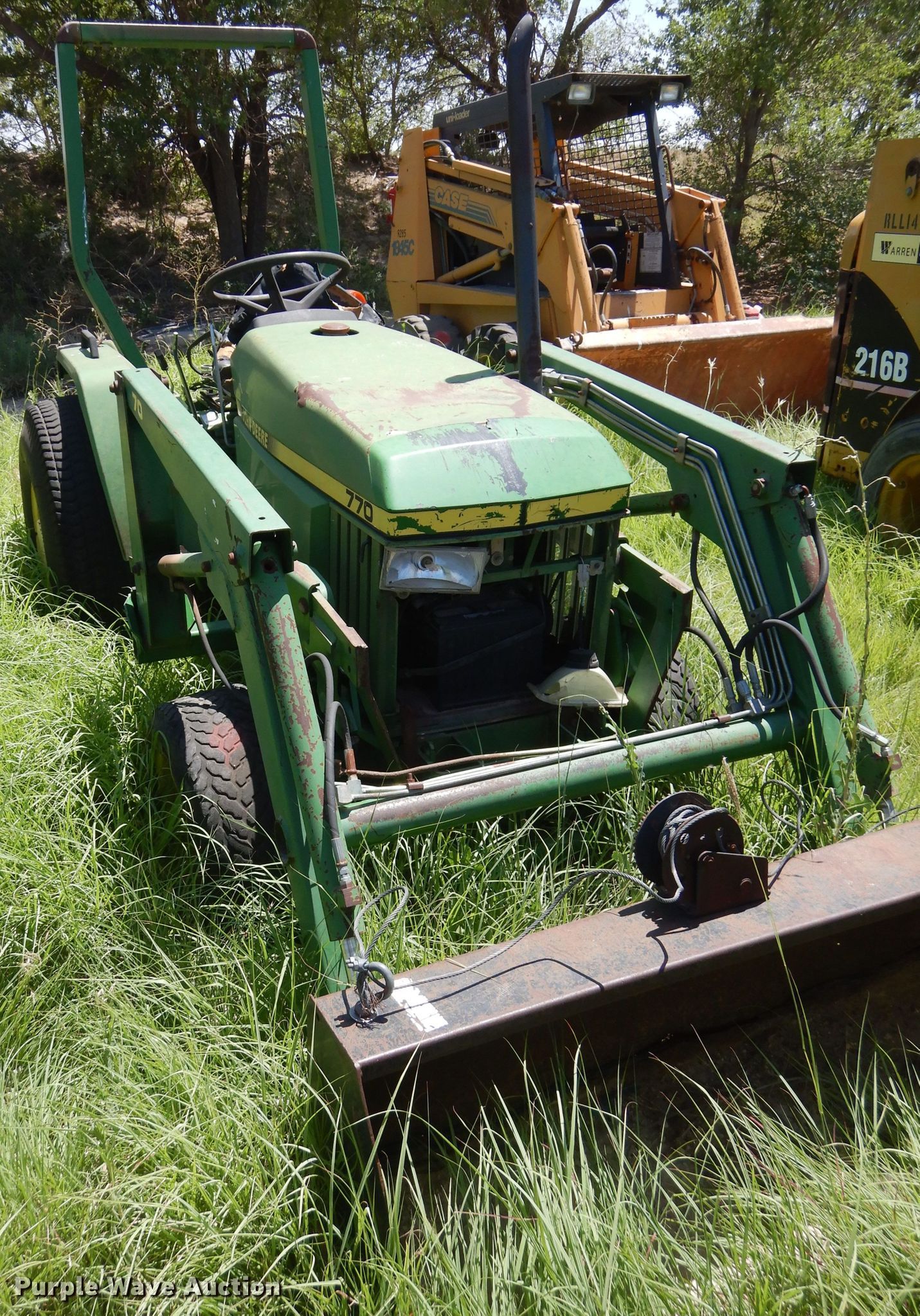 John Deere 770 tractor. 711 hours on meter, Serial: 141758. Engine Cylinders: 3, Fuel type: Diesel. Transmission Manual, 4F - 1R. Operational PTO: 540, Three point, Loader John Deere 70, Bucket Width: 48".. Tires Front: 25x8.50-14, Rear: 13.50-16. Notes Unknown operating condition. Seaboard Foods. Optima, OK 73945