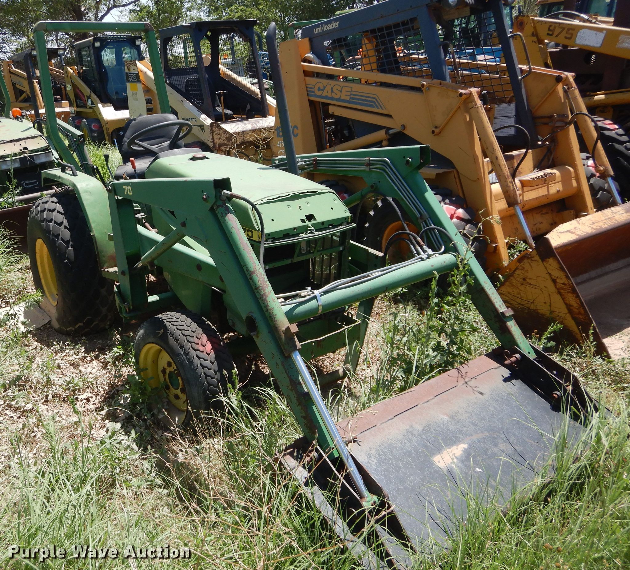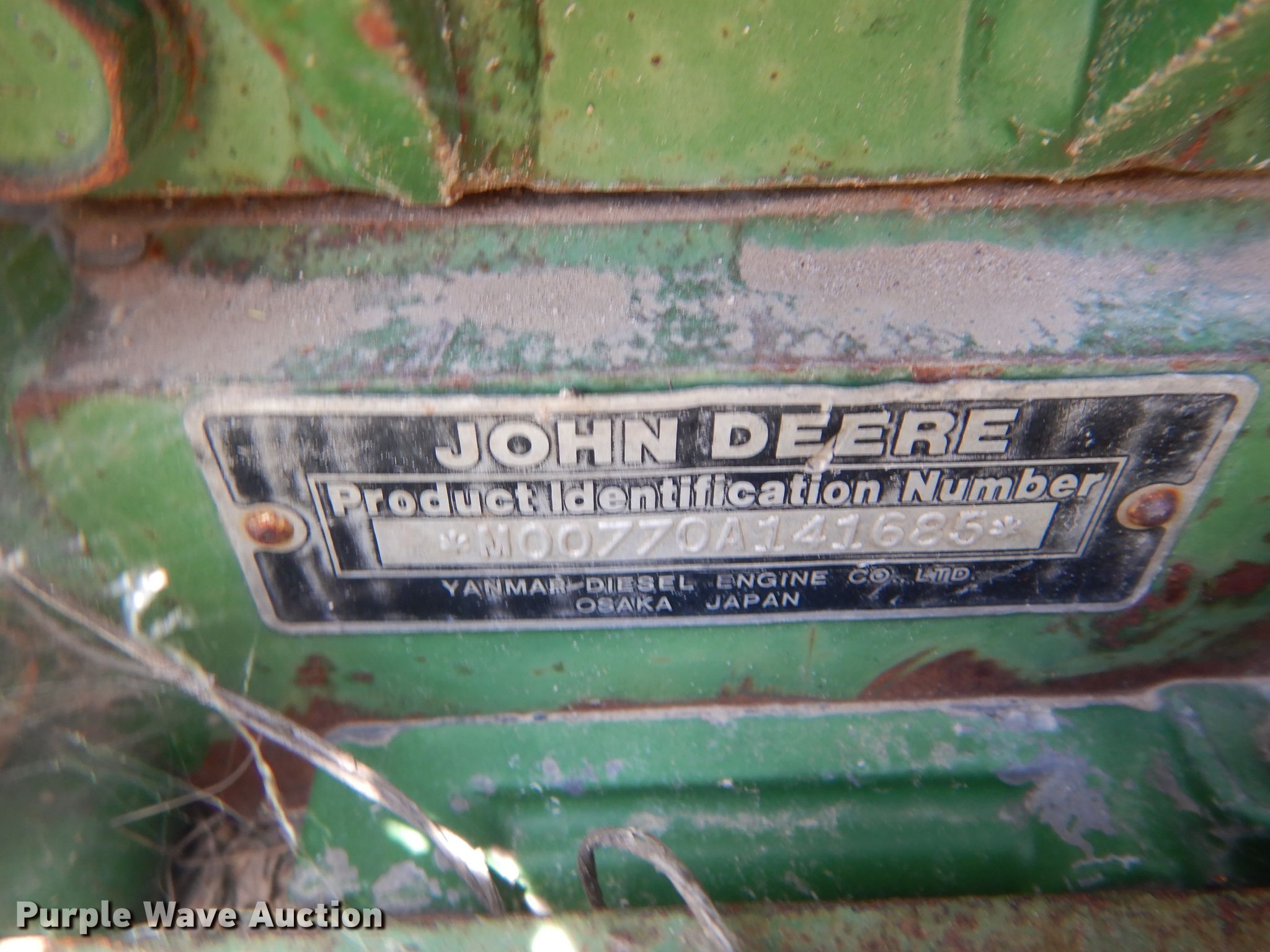 John Deere 770 tractor. 2,217 hours on meter, Serial: M00770A141685. Engine Cylinders: 3, Fuel type: Diesel. Transmission Manual, 4F - 1R. Operational Loader John Deere 70, Bucket Width: 48".. Tires Front: 25x8.50-14, Rear: 13.50-16. Notes Unknown operating condition , Serial M00770A141685. Seaboard Foods. Optima, OK 73945