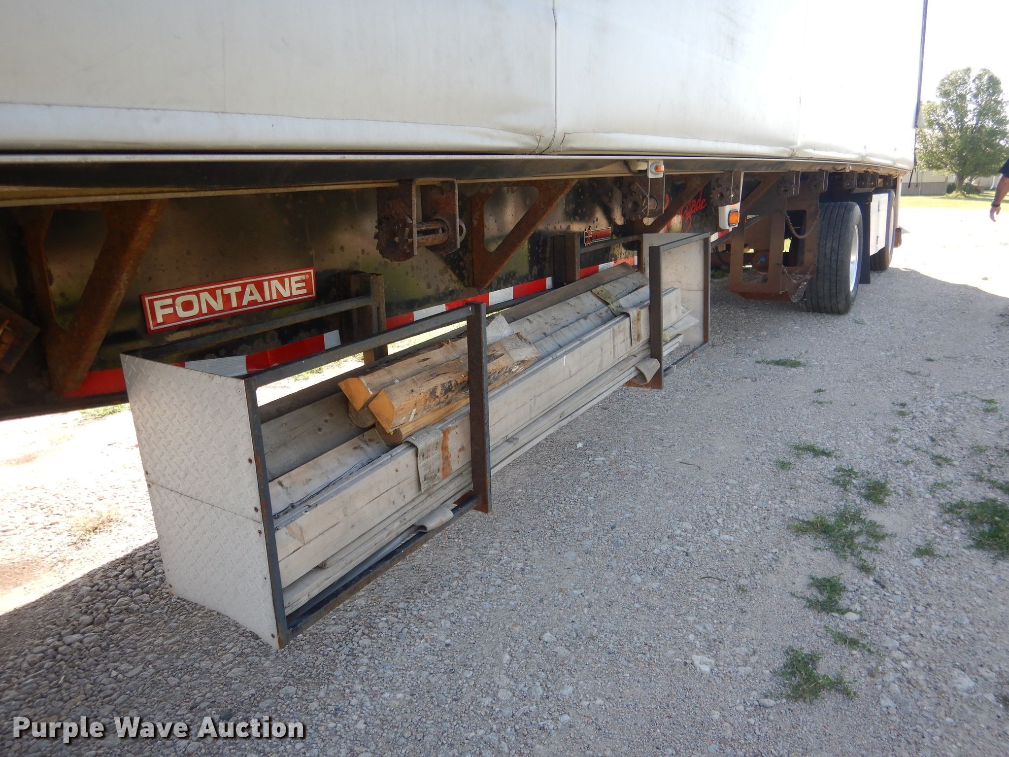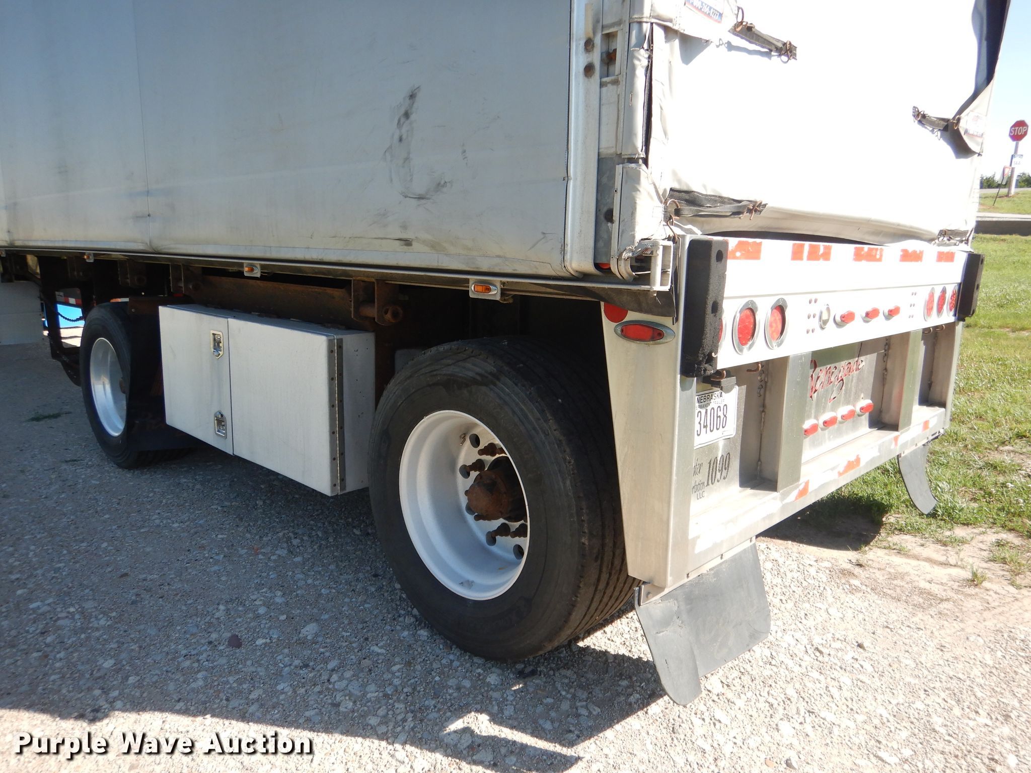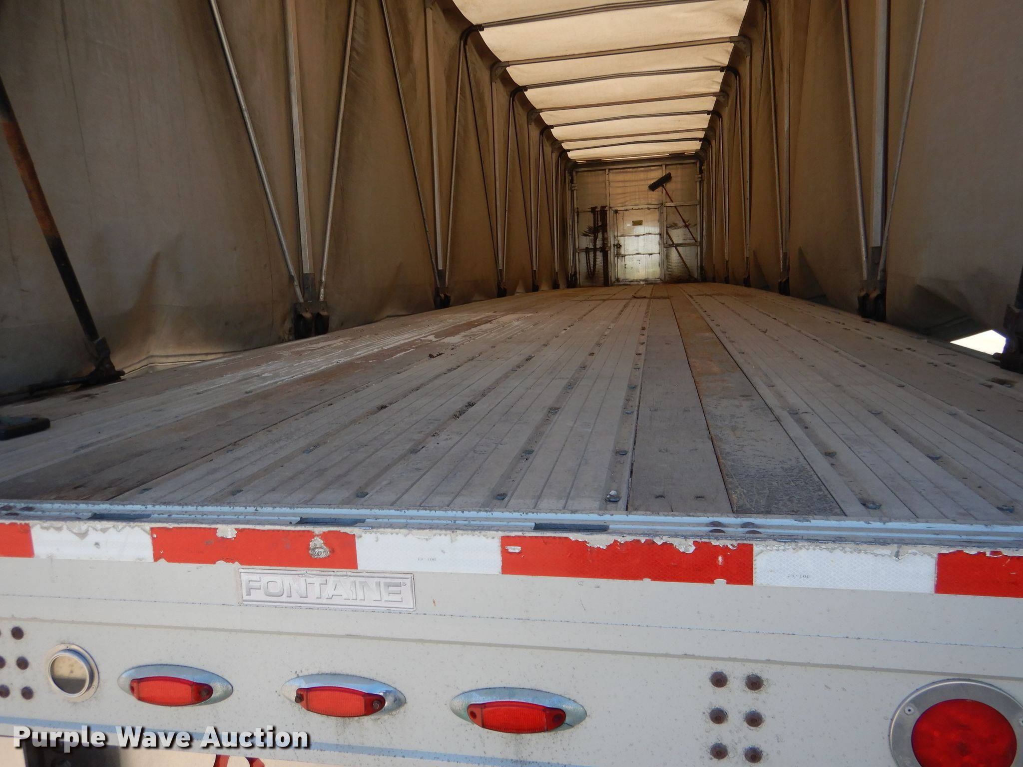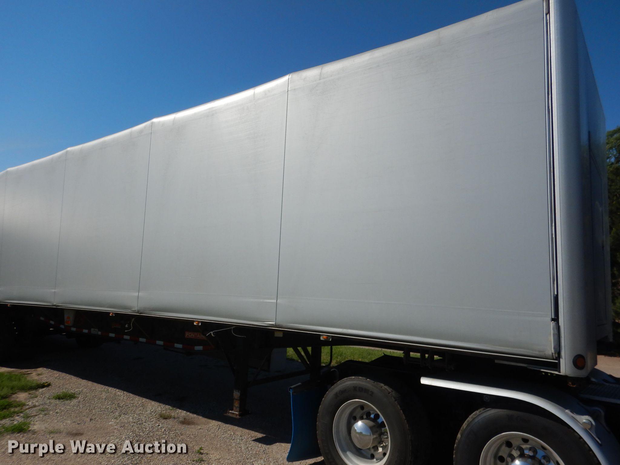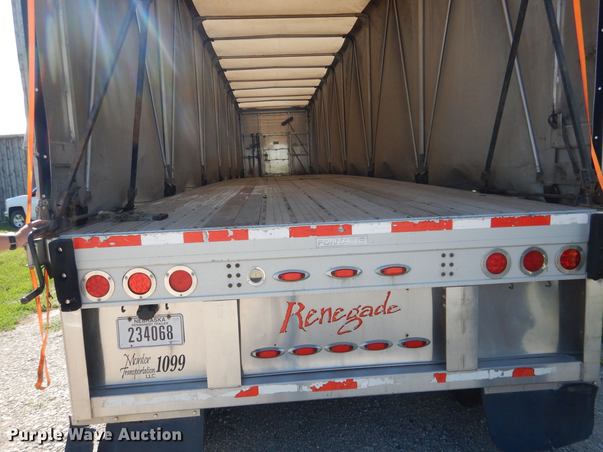 Purple Wave is selling a used Flat or Drop Deck Trailer in Nebraska. This item is a 2006 Fontaine Renegade conestoga trailer with the following: 48'L x 102"W overall, 8' side height, Aluminum deck, 2015 Quick Draw tarp system, Auxiliary airbag deflation system, Dual leg landing gear, Air suspension, Air brakes, Spread axle, 10'W spread, Aluminum wheels, 445/50R22.5 tires, GVWR 80,000 lbs
