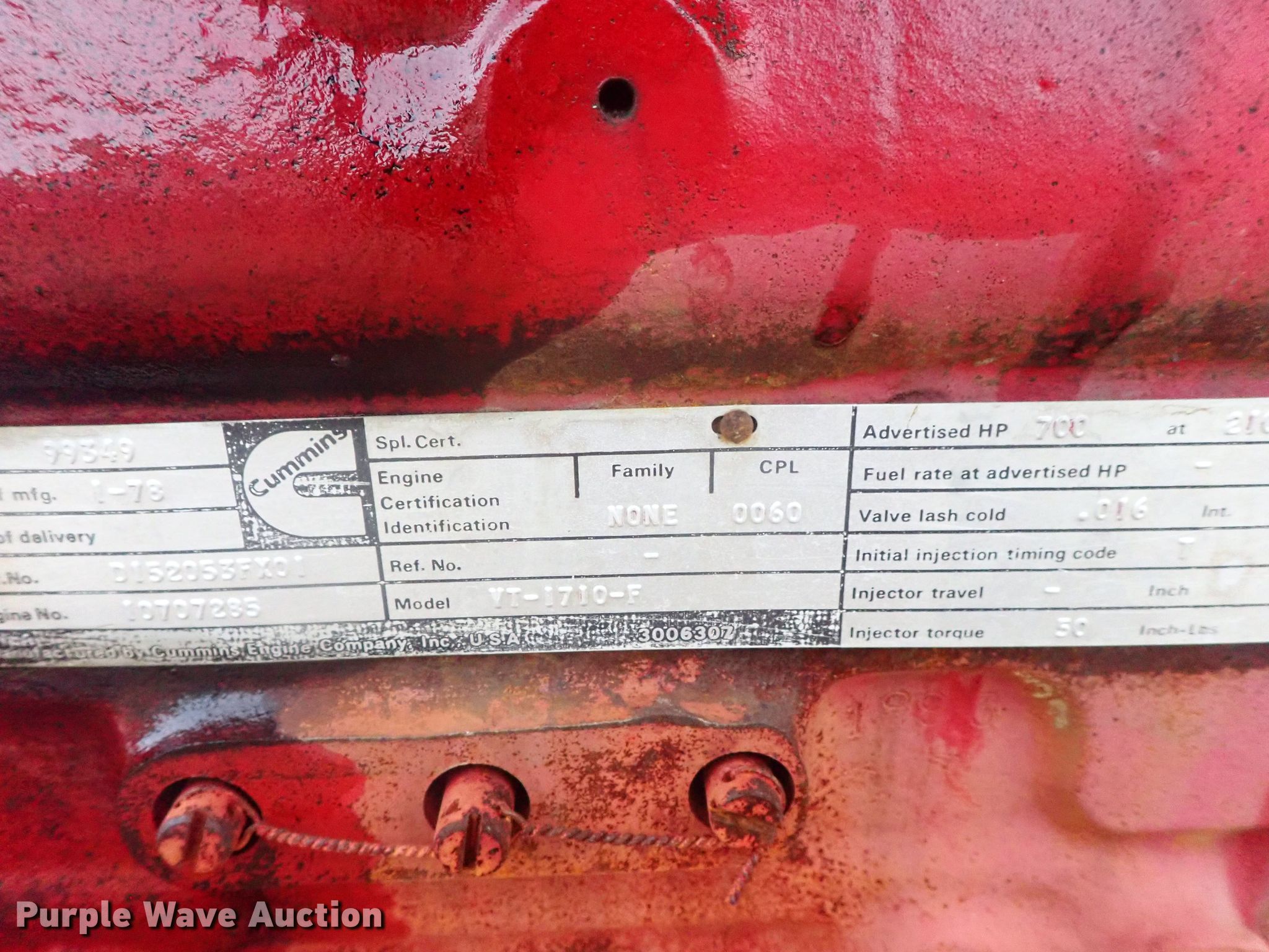 Purple Wave is selling a used Engine in Kansas. This item is a Cummins VT-1710-F 12 cylinder diesel engine with the following: 700 HP, Intake cracked