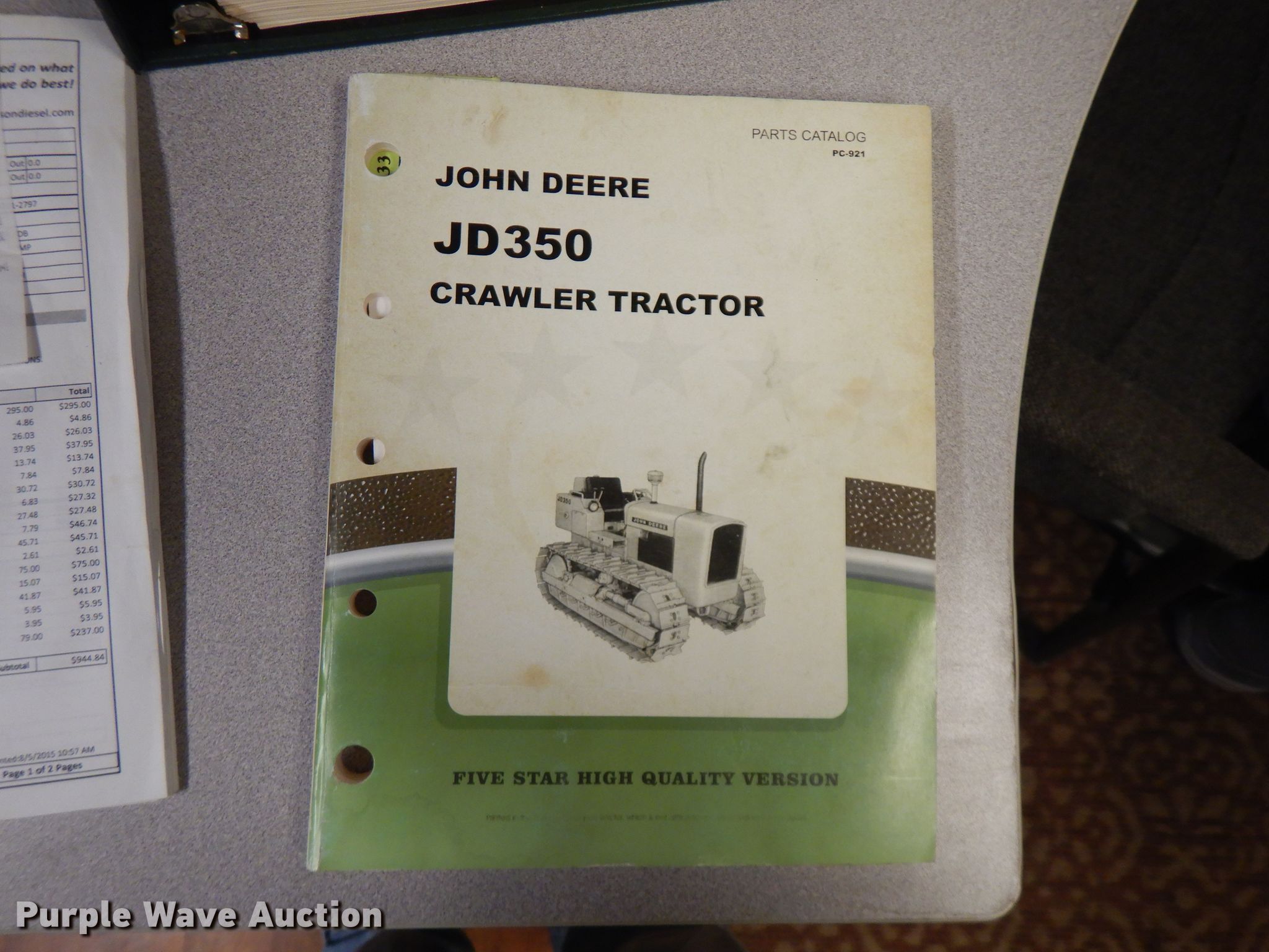 John Deere 350B dozer. 564 hours on meter, Serial: 26541. Engine John Deere , Displacement: 151 C.I.D., Cylinders: 3, Fuel type: Diesel, HP: 42. Transmission Manual, 4F - 4R. Operators station Steering: Clutch brake. Operational Dozer blade: 6-way Width: 80". Tracks Width: 12", Grouser pads: Triple Bottom rollers: 5. Notes Manuals. 17251 Virgin St. Tulsa, OK 74116