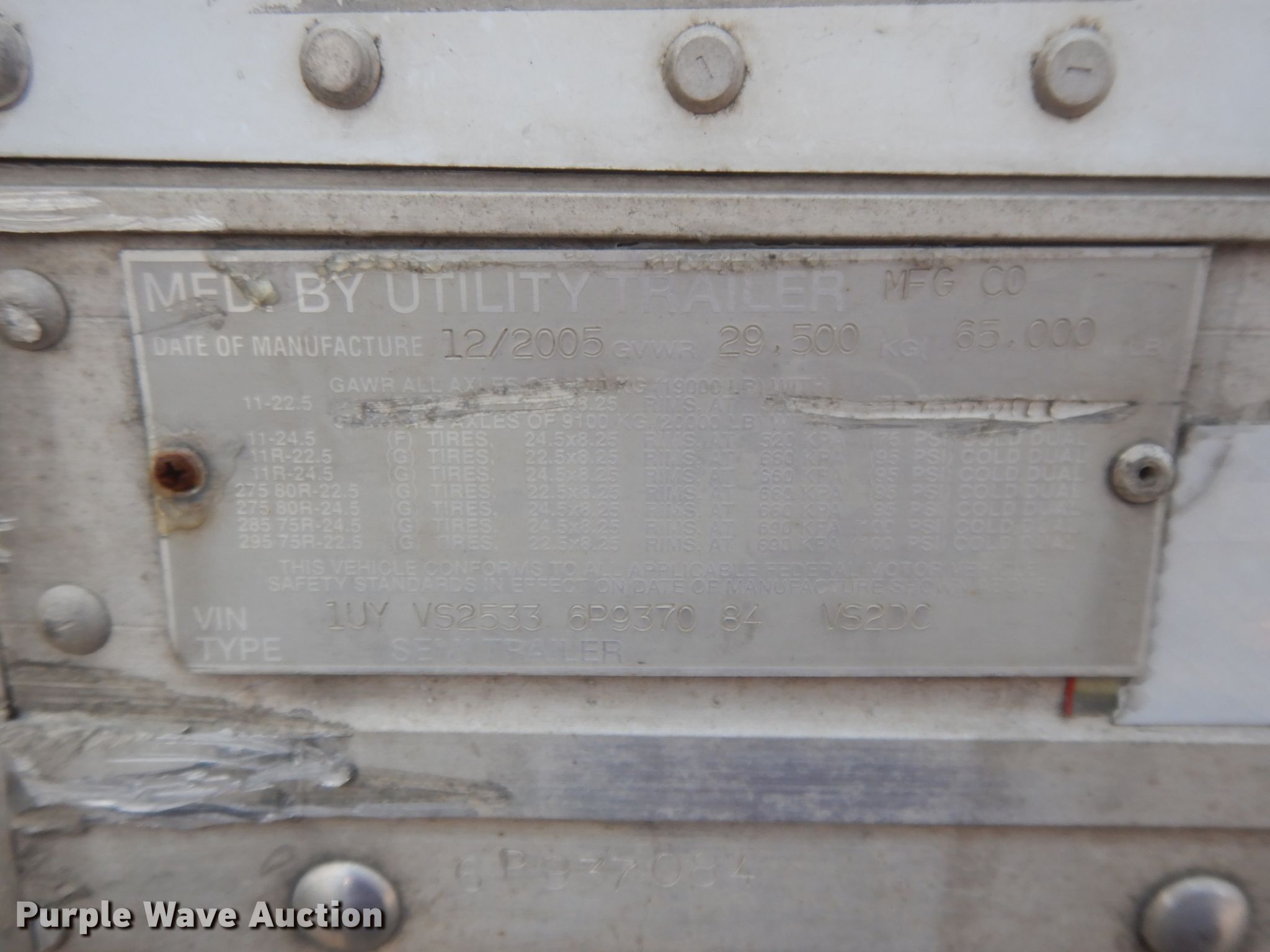 Purple Wave is selling a used Dry Van Trailer in Kansas. This item is a 2006 Utility dry van trailer with the following: 53'L x 102"W overall, Wood deck, Dual leg landing gear, Air suspension, Air brakes, Tandem axle, 295/75R22.5 tires, GVWR 65,000 lbs