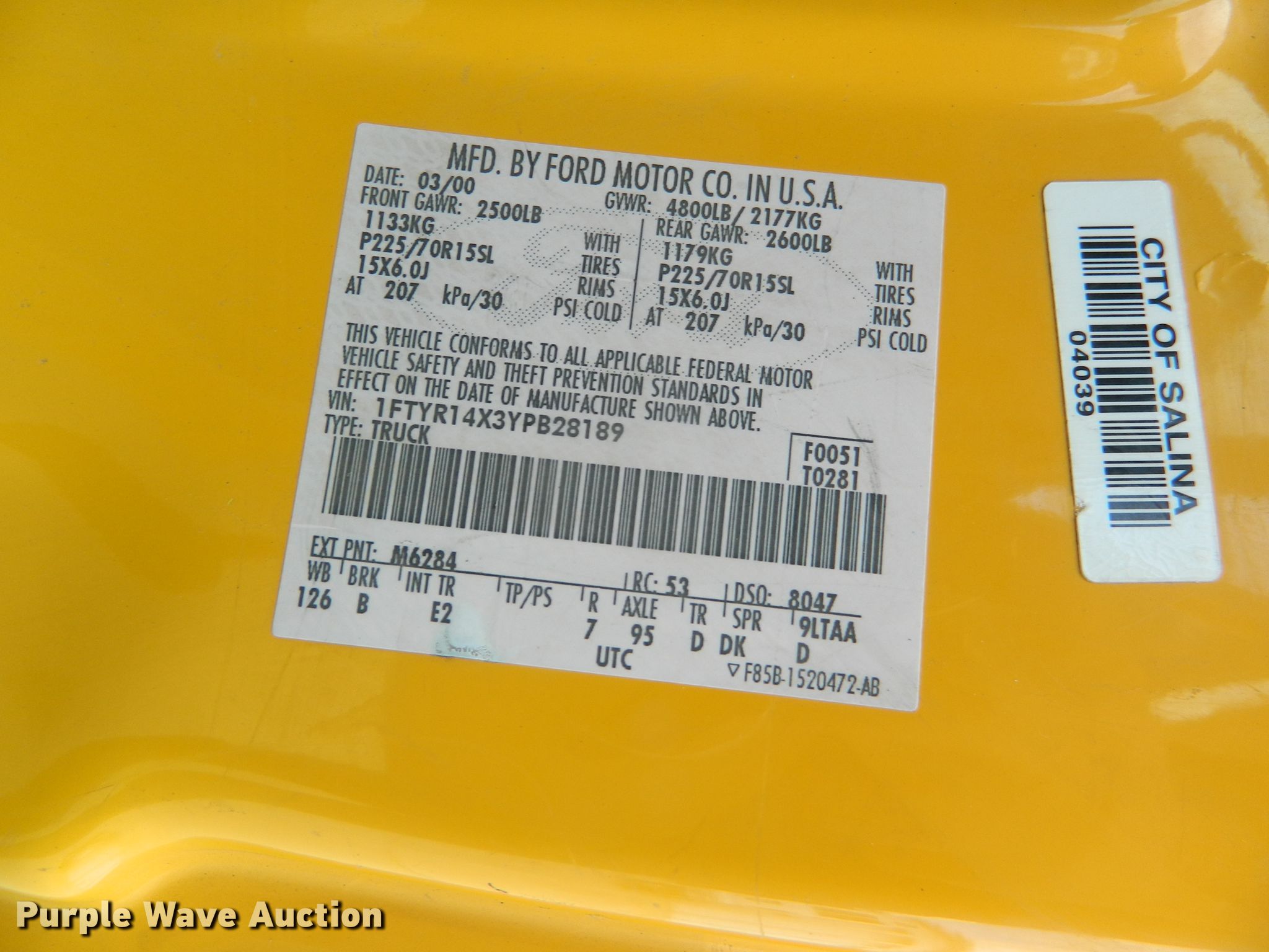 2000 Ford Ranger SuperCab pickup truck. 130,160 miles on odometer. Engine Displacement: 4.0L V6 OHV 12V, Cylinders: 6, Fuel type: Gas. Transmission Automatic. Interior AC, Heat. Tires Size: 215/75R15. Kansas title. 1FTYR14X3YPB28189. City of Salina. 412 Ash St. Salina, KS 67401