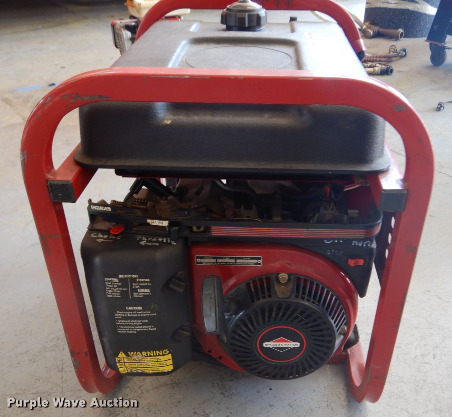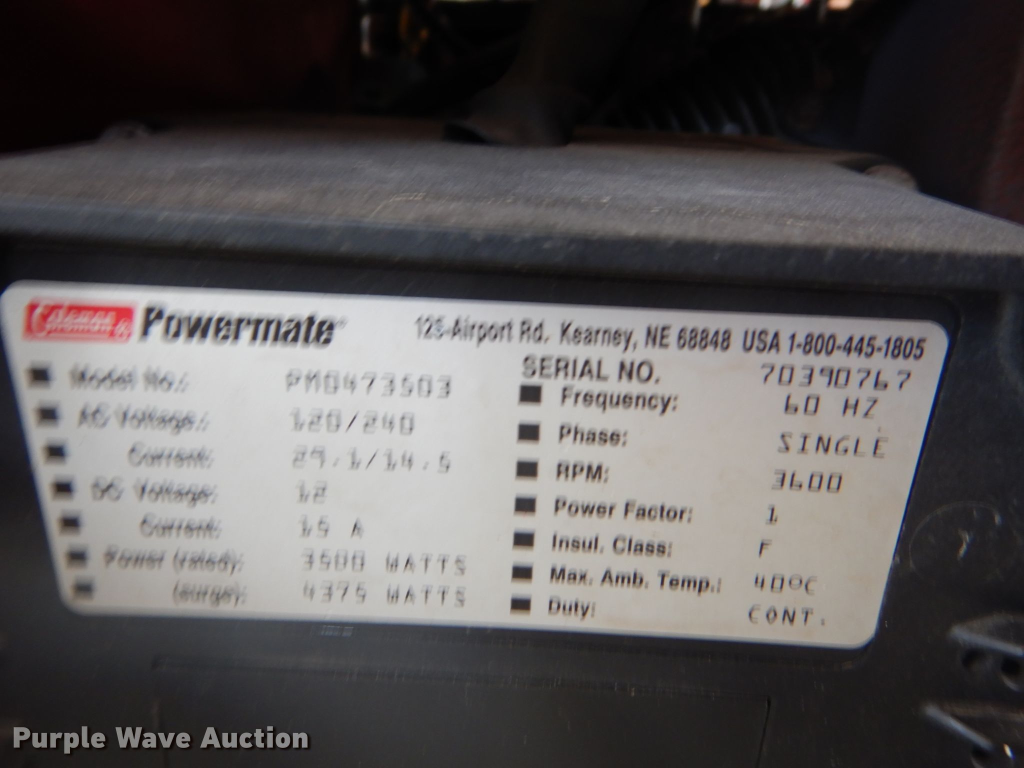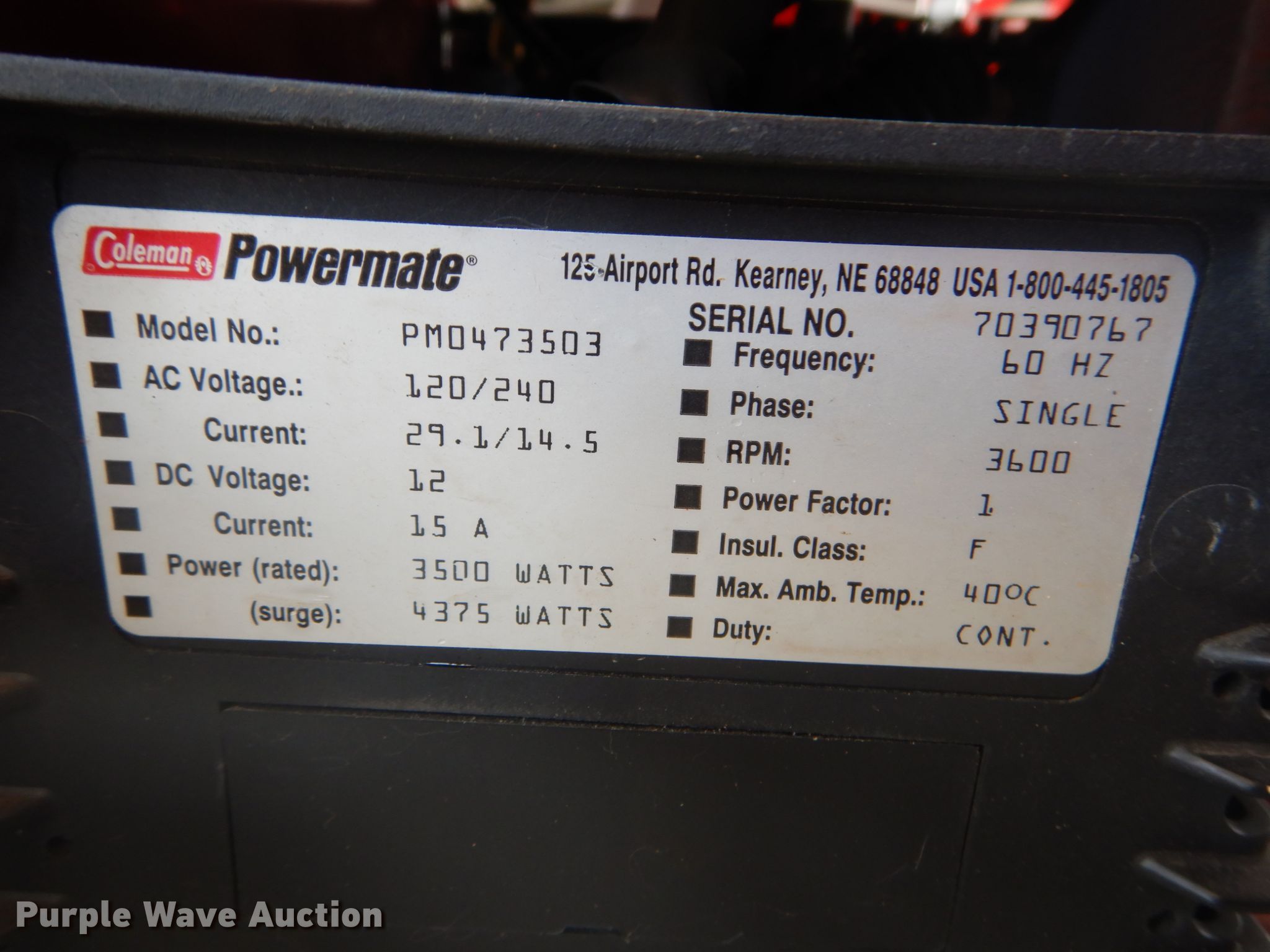 Purple Wave is selling a used Generator Set in Missouri. This item is a Coleman Powermate Vantage 3500 generator with the following: Briggs & Stratton single cylinder gas engine, 120/240V, Single phase