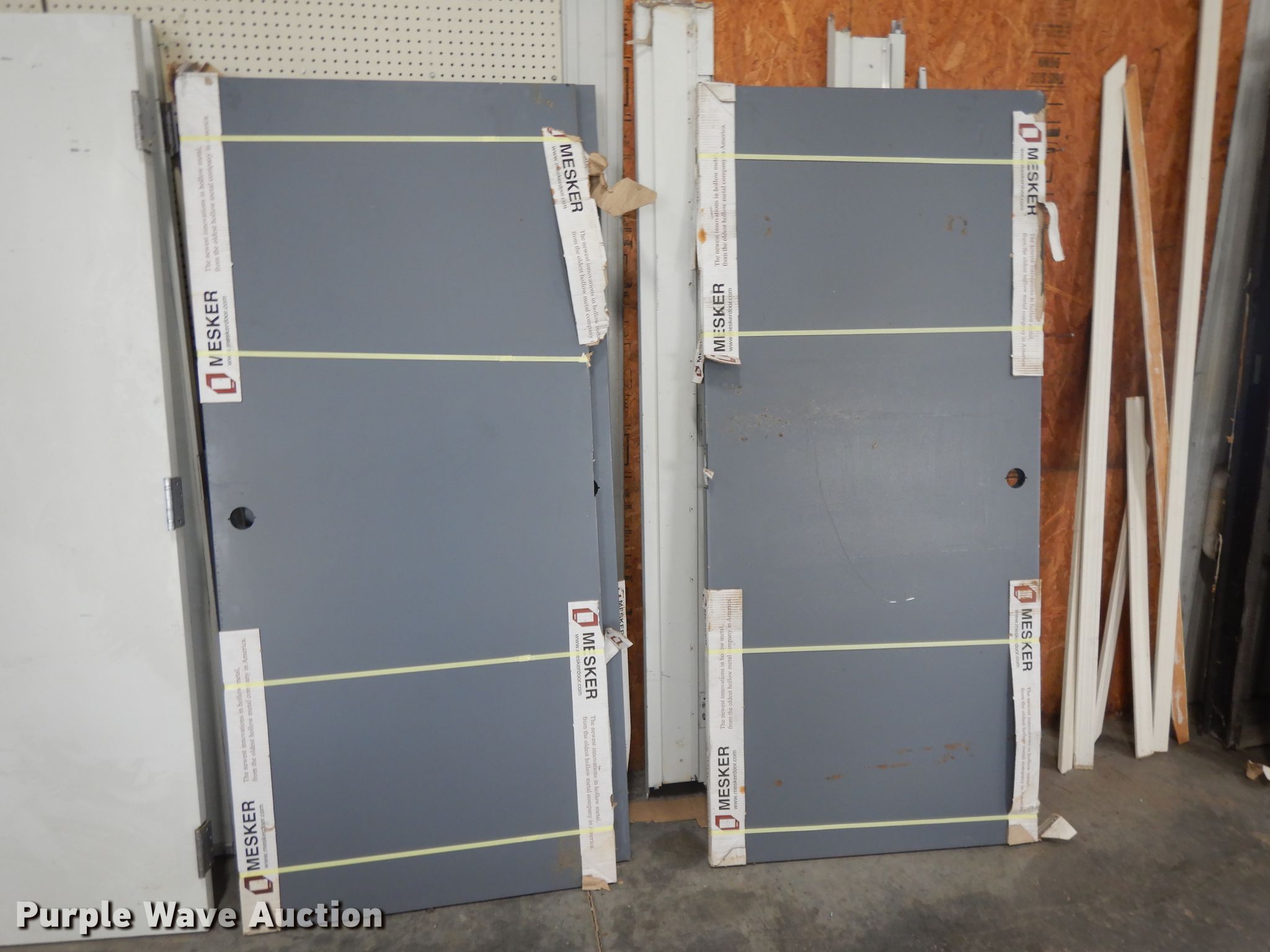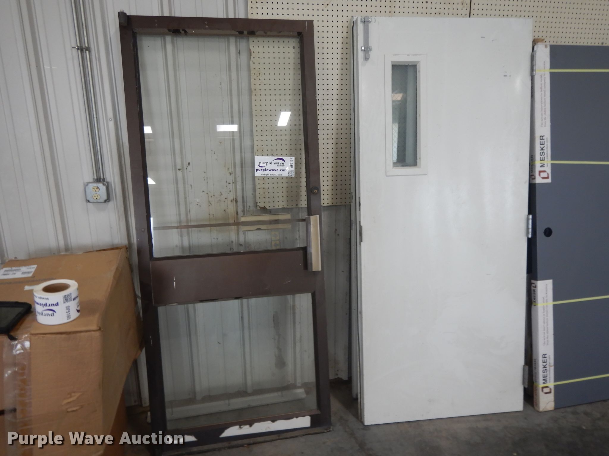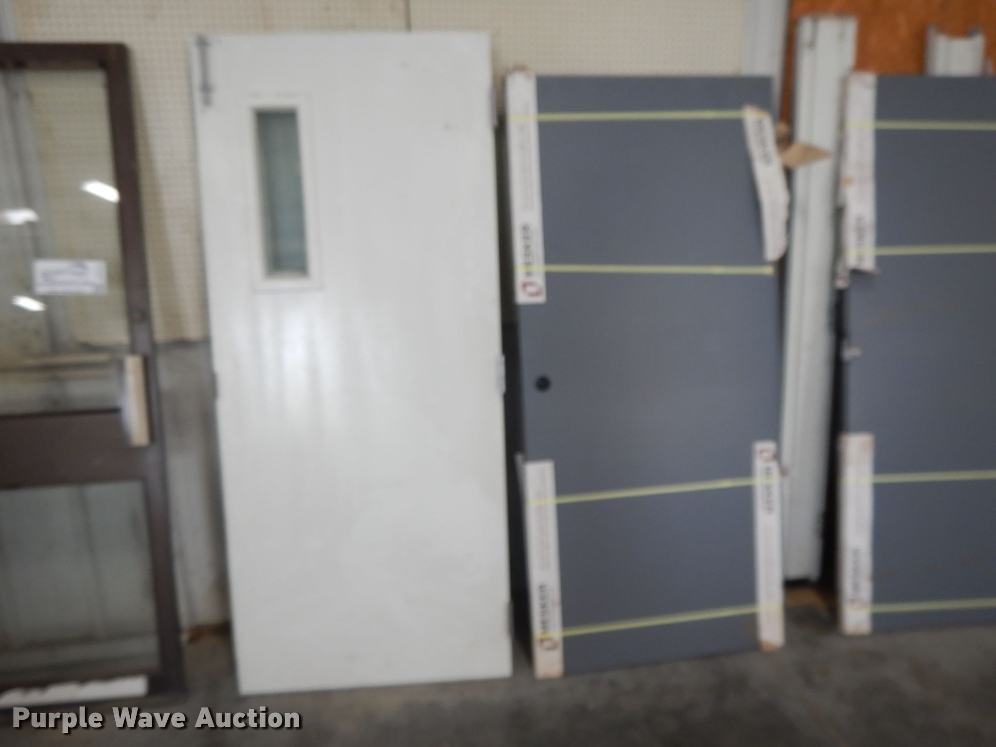 Purple Wave is selling a used Building Materials in Kansas. This item is a Building materials with the following: (5) Mesker steel doors, Part no. N807P1, (2) single window doors, Glass door, Approx. 10 wood doors