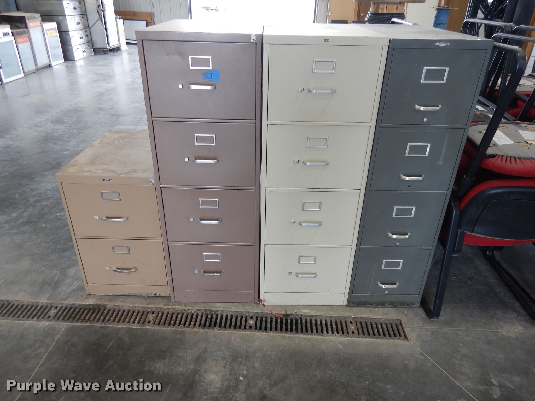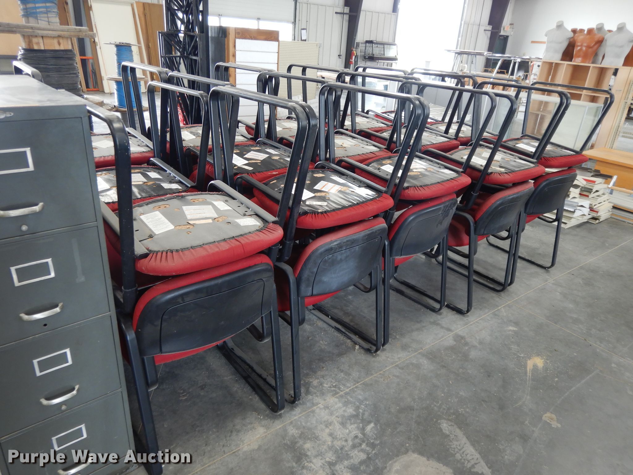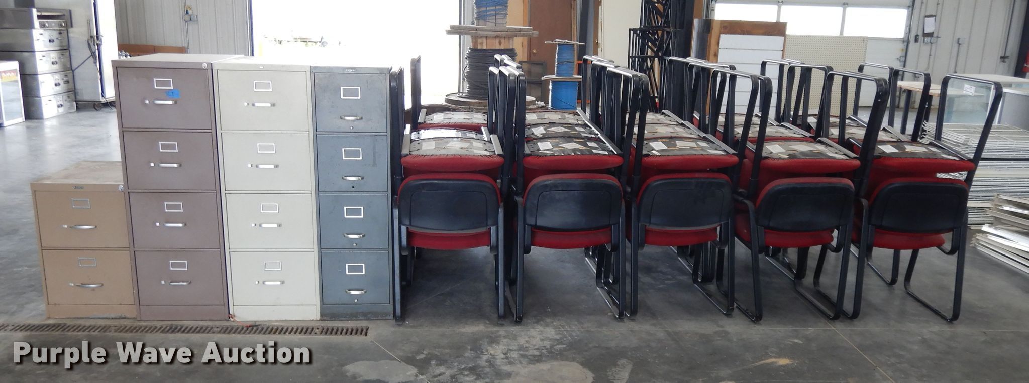 Purple Wave is selling a used Furniture in Kansas. This item is a Furniture with the following: (3) four drawer file cabinets, Two drawer file cabinet, (33) chairs, Round wood table, 30" diameter, Collapsible table, 40" diameter
