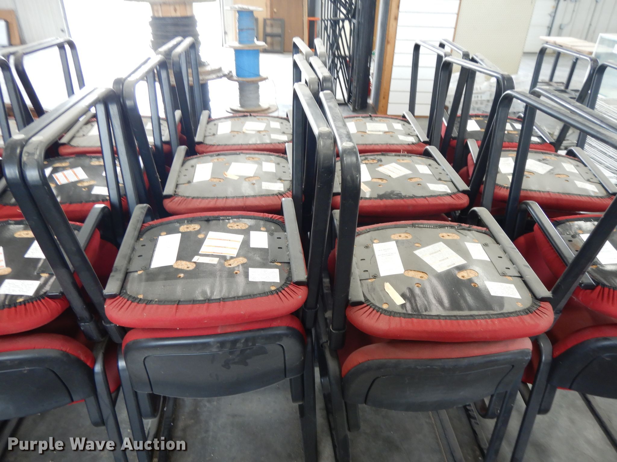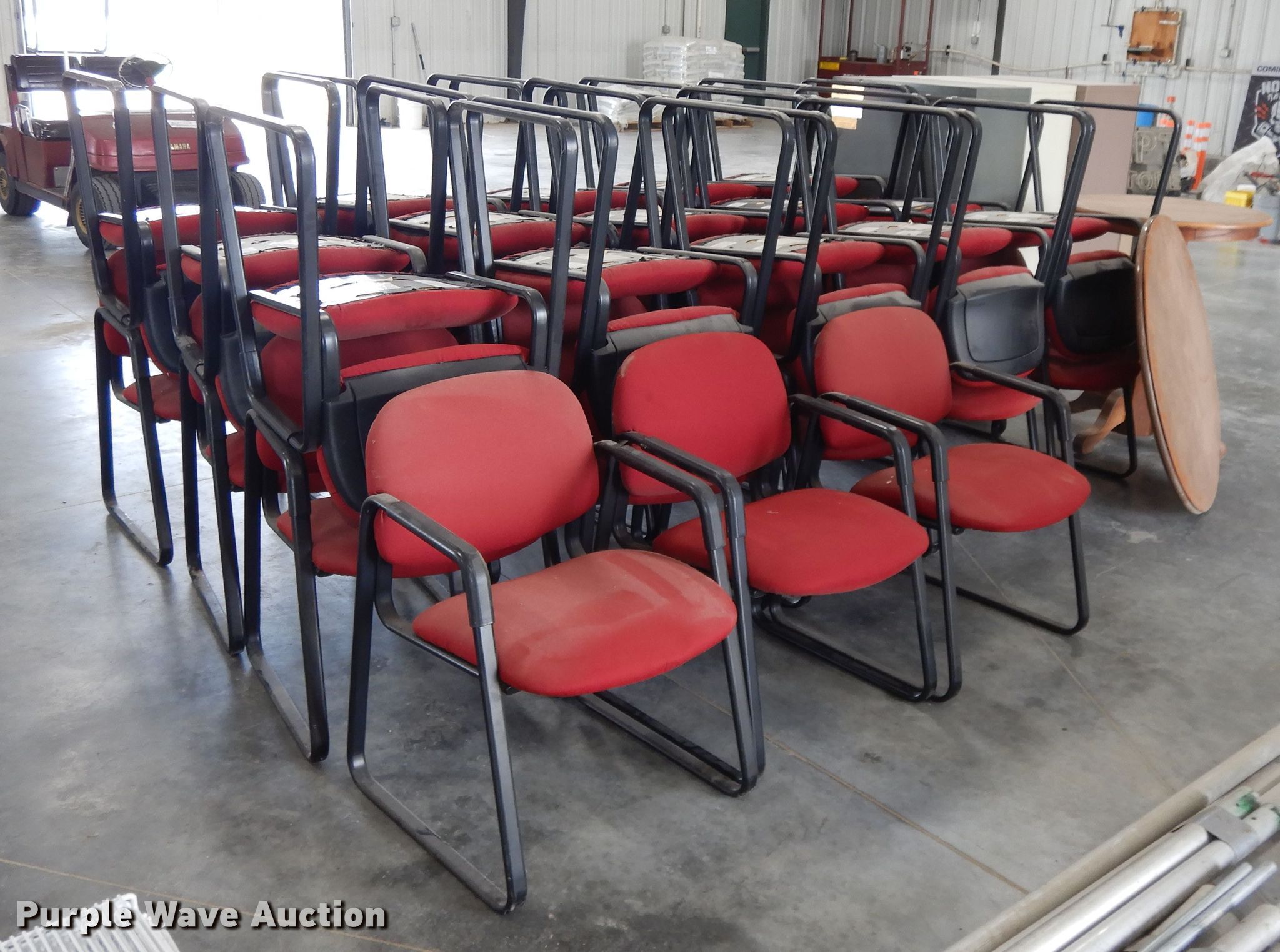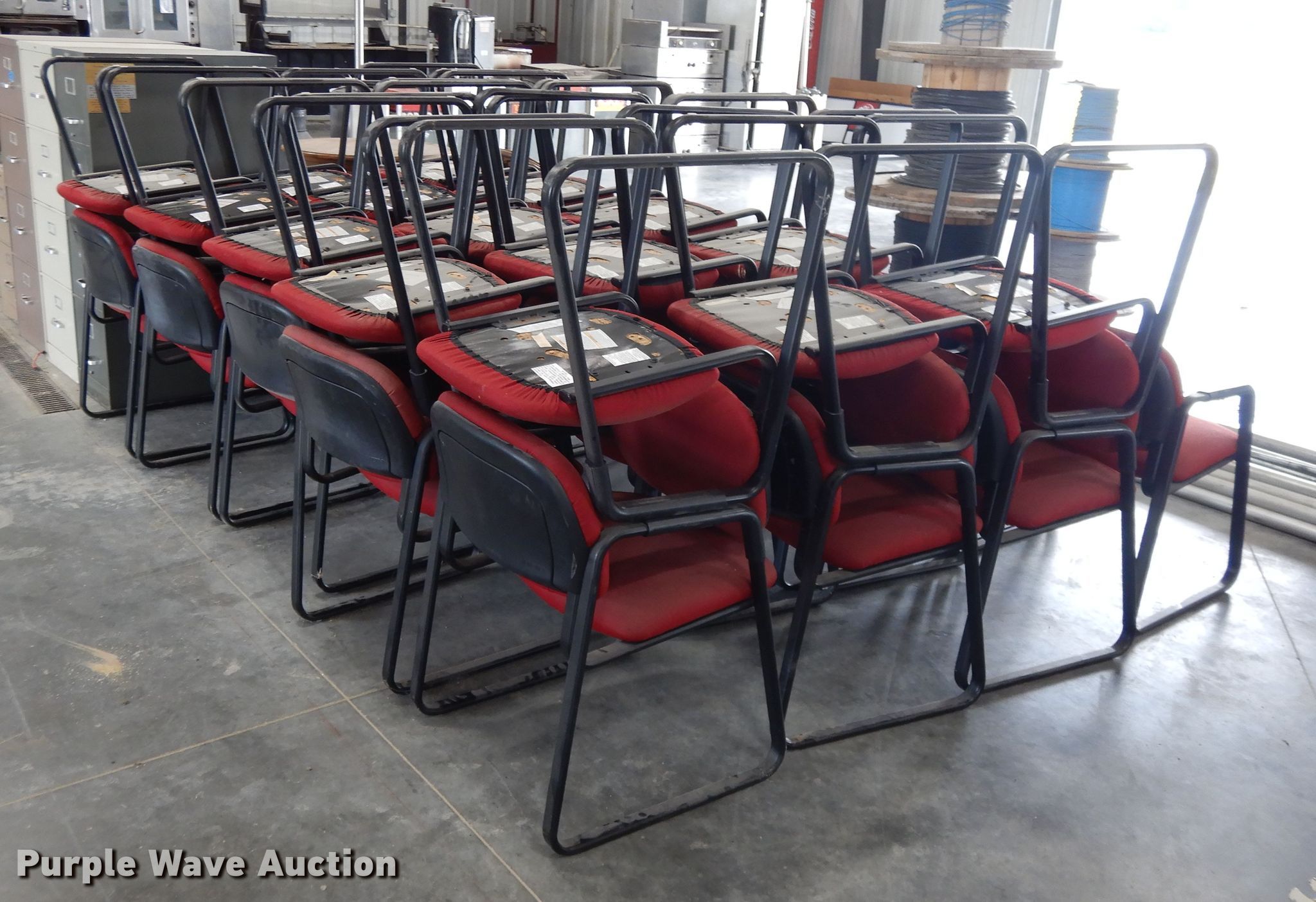 Purple Wave is selling a used Furniture in Kansas. This item is a Furniture with the following: (3) four drawer file cabinets, Two drawer file cabinet, (33) chairs, Round wood table, 30" diameter, Collapsible table, 40" diameter