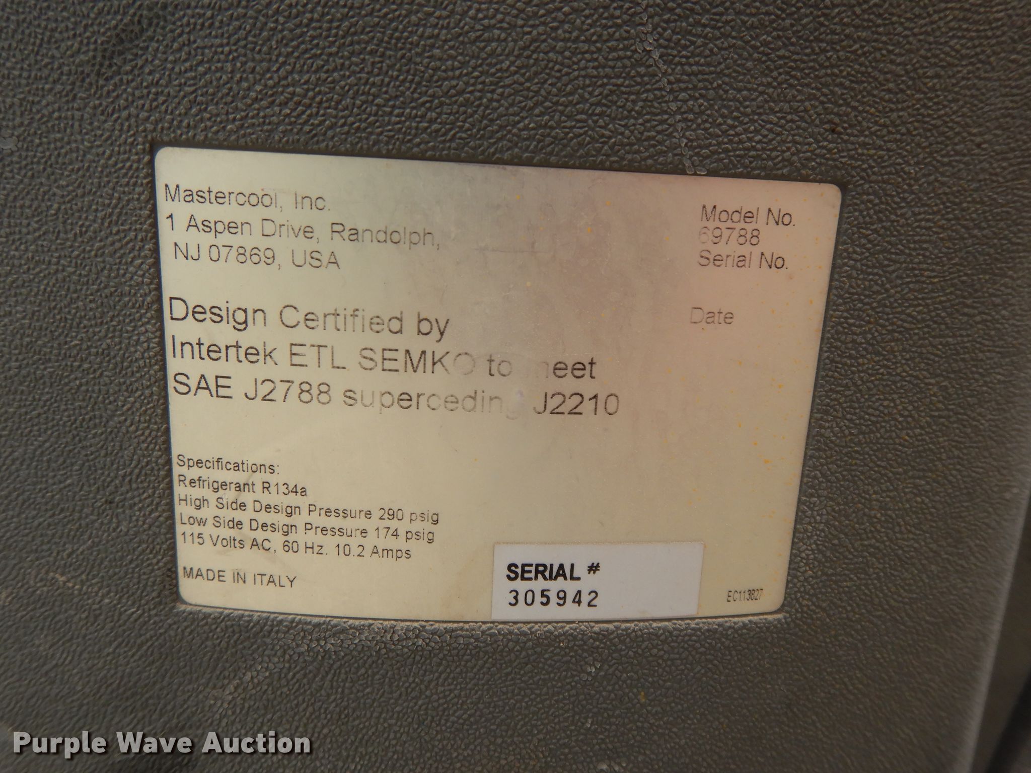 Purple Wave is selling a used Tools in Kansas. This item is a Mastercool 69788 AC machine with the following: 115V, 290 psig high side pressure, 174 psig low side pressure, R-134 only, No tanks included, Serial 305942