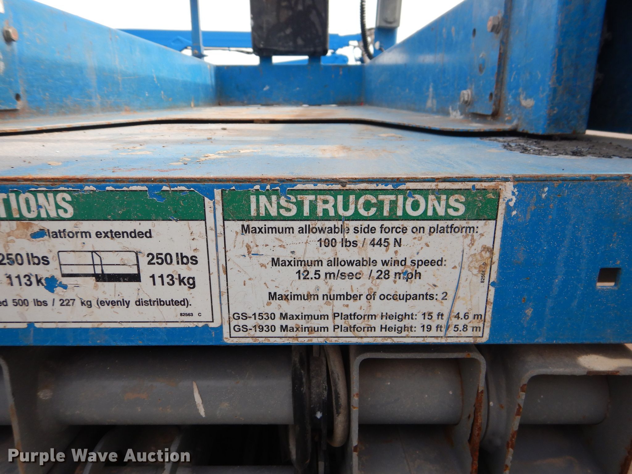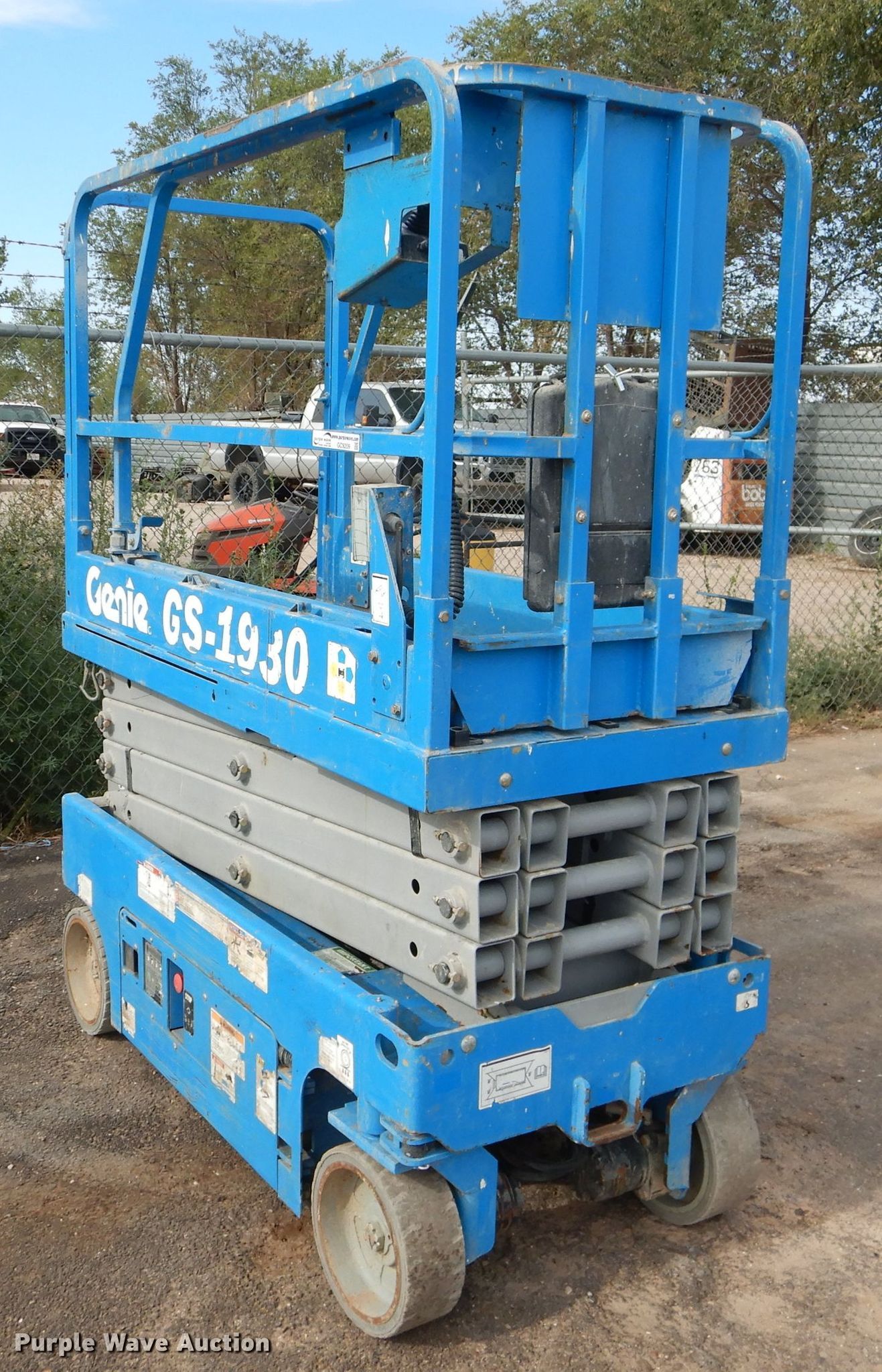 Purple Wave is selling a used Scissor or Vertical Lift in Texas. This item is a 2012 Genie GS-1930 scissor lift with the following: Maximum lift height: 19', Hydraulic outriggers, Hydraulic leveling, Platform: 60" L x 25" W, AC power outlet, Controls: Platform, Platform extensions: Powered