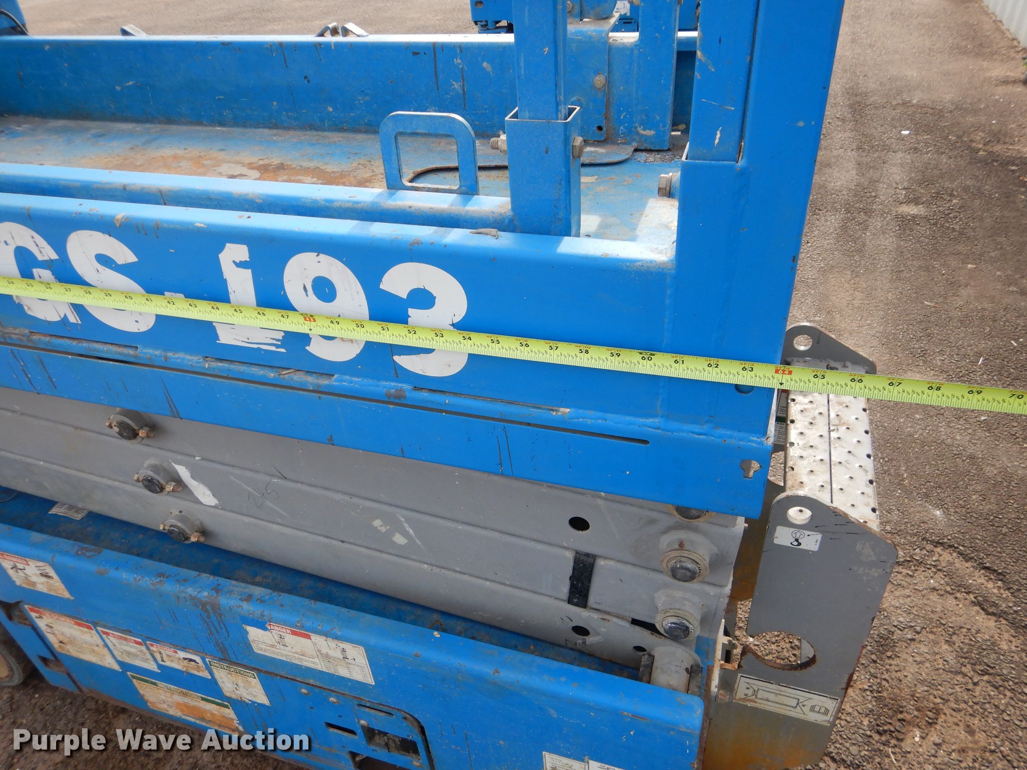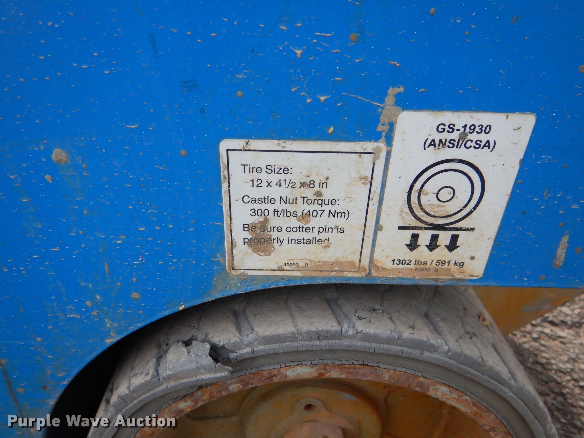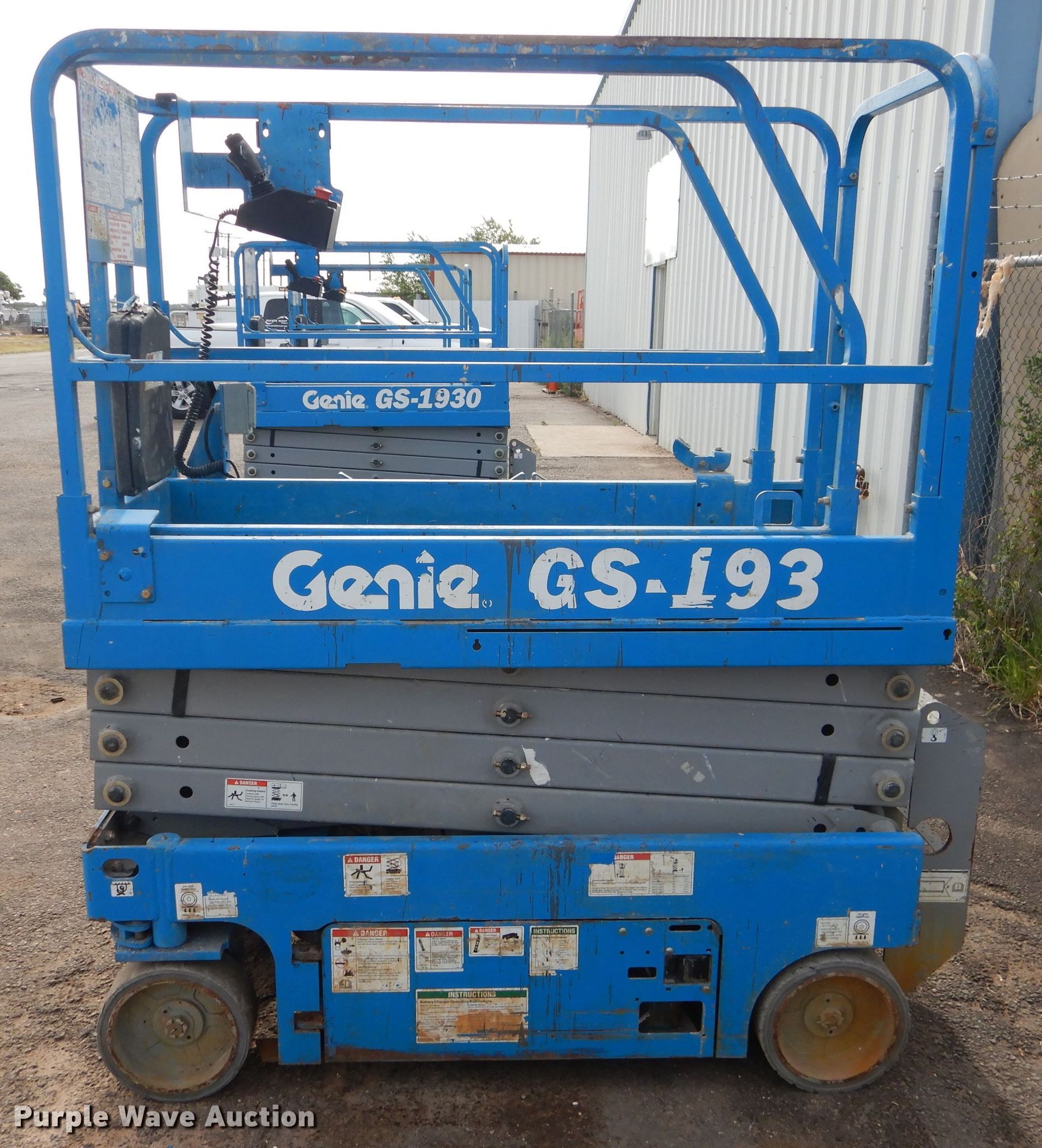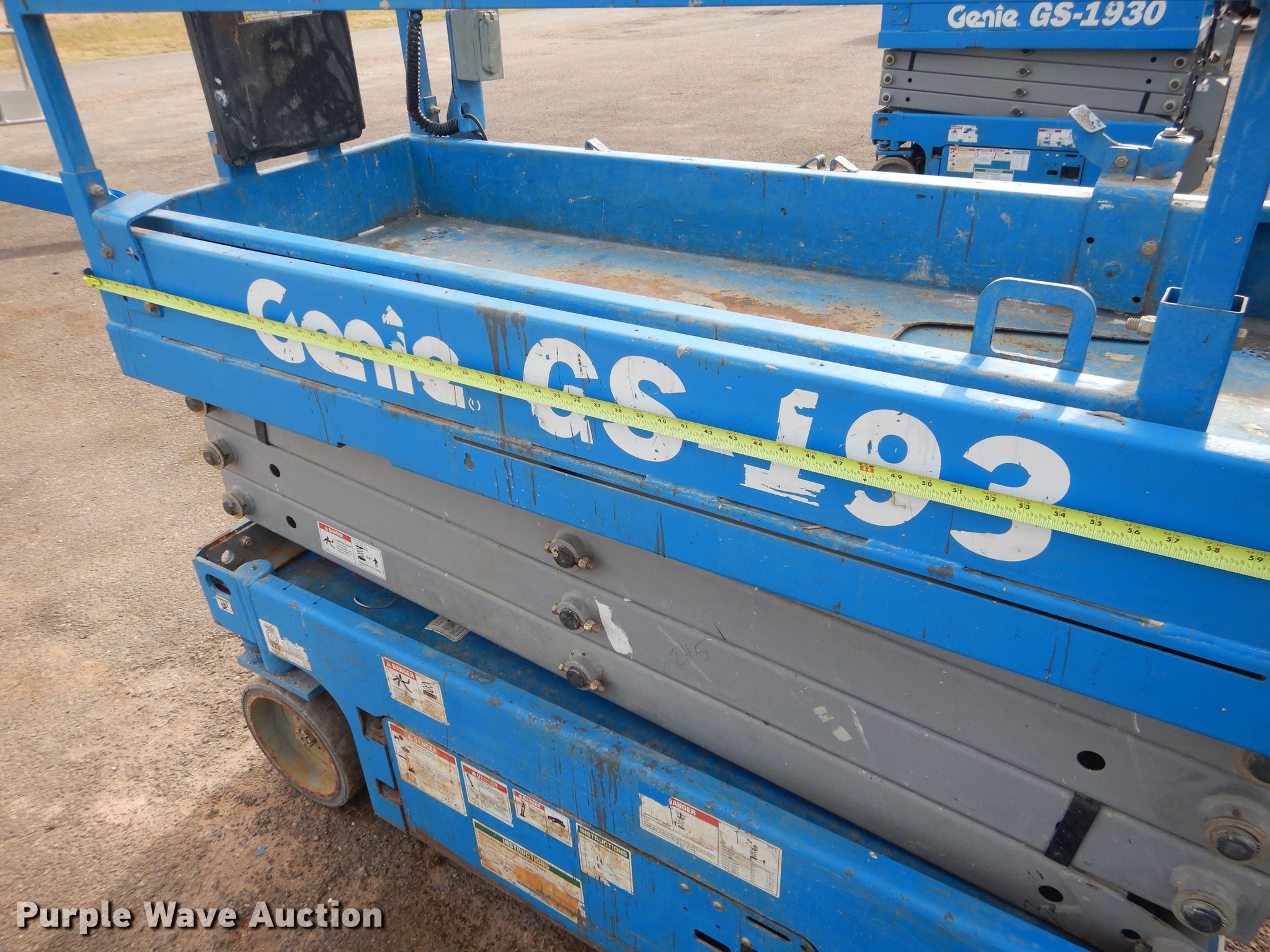 2012 Genie GS-1930 scissor lift. Electric Motor. Operational. Maximum lift height: 19', Hydraulic outriggers, Hydraulic leveling, Platform: 60" L x 25" W, AC power outlet, Controls: Platform, Platform extensions: Powered. Tires Tire size: 12x4.5x8, Solid, Non marking. B&K Equipment. 11737 US-62. Wolfforth, TX 79382