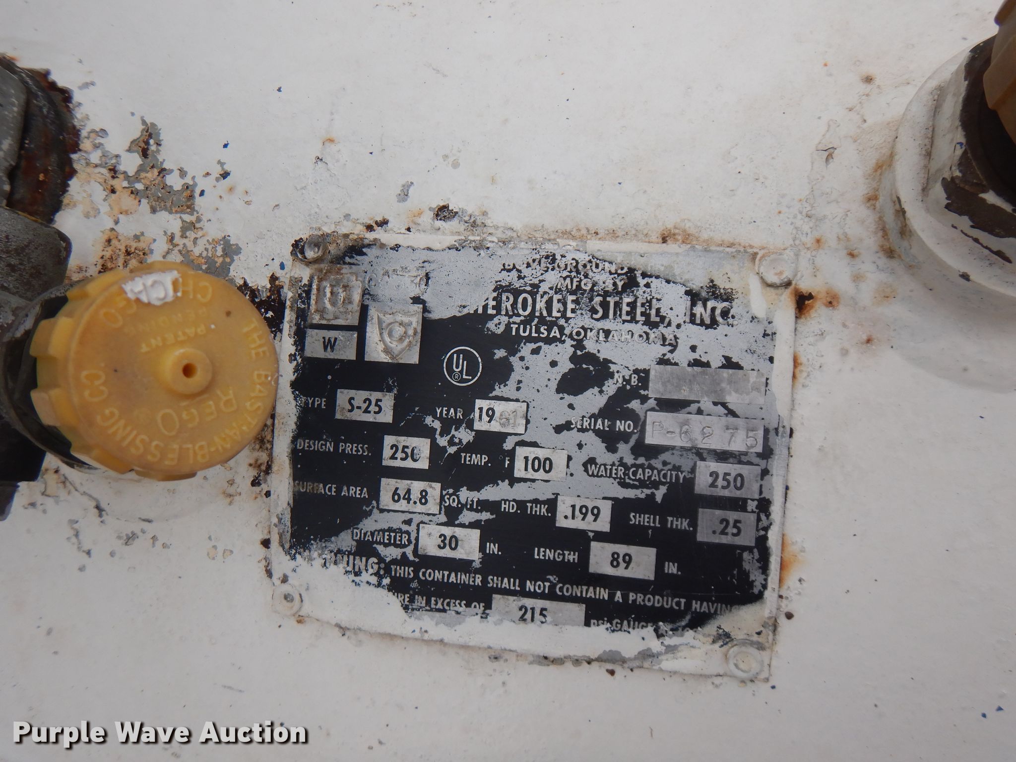 Purple Wave is selling a used Fuel and Lube in Oklahoma. This item is a Steel propane tank with the following: 250 gallon capacity, 0.25" shell thickness