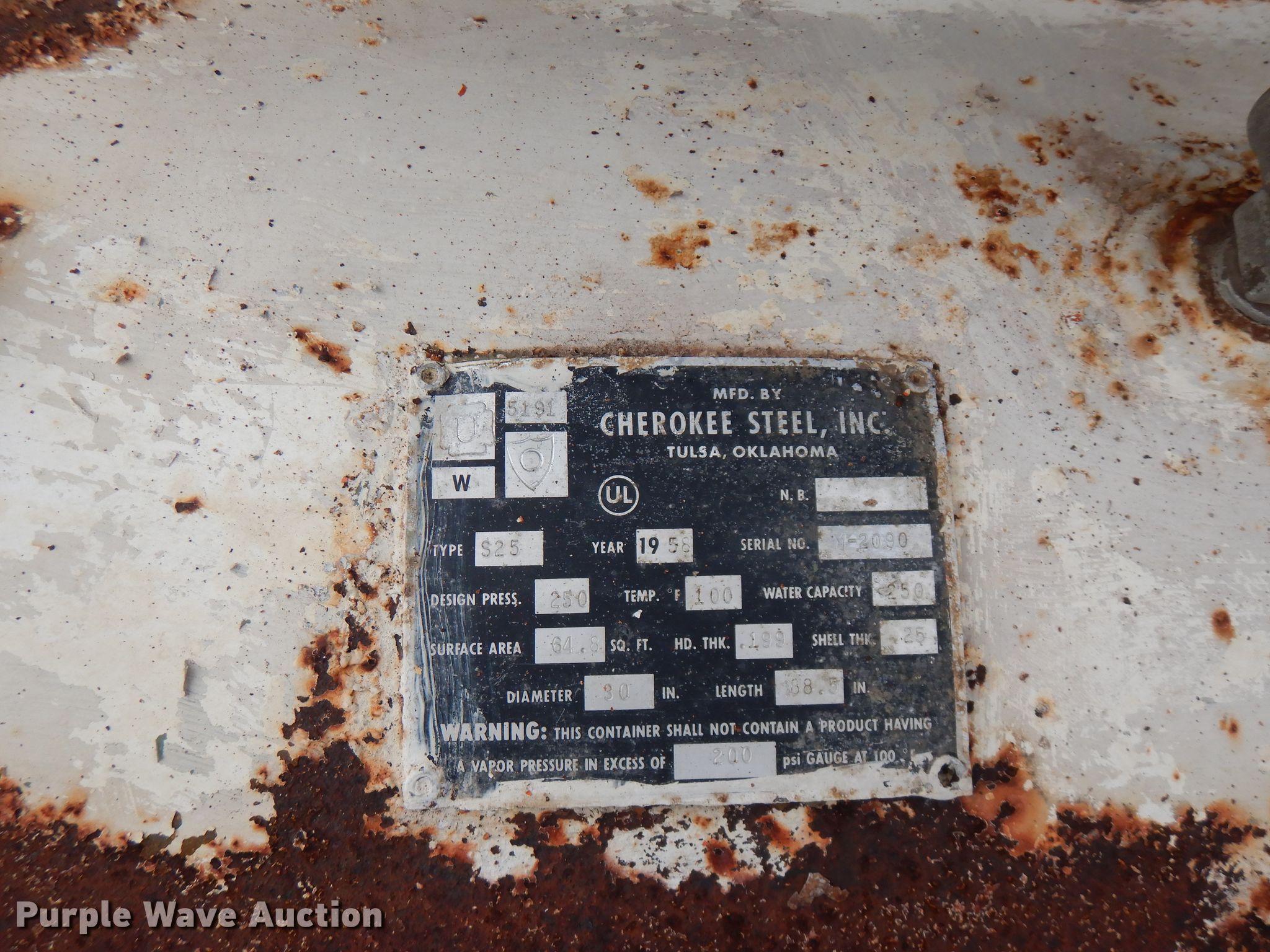 Purple Wave is selling a used Fuel and Lube in Oklahoma. This item is a Steel propane tank with the following: 250 gallon capacity, 0.25" shell thickness
