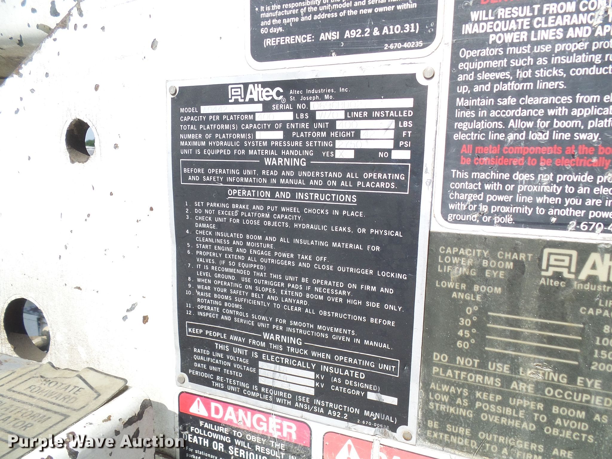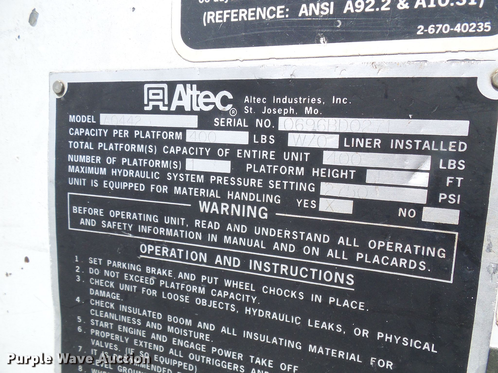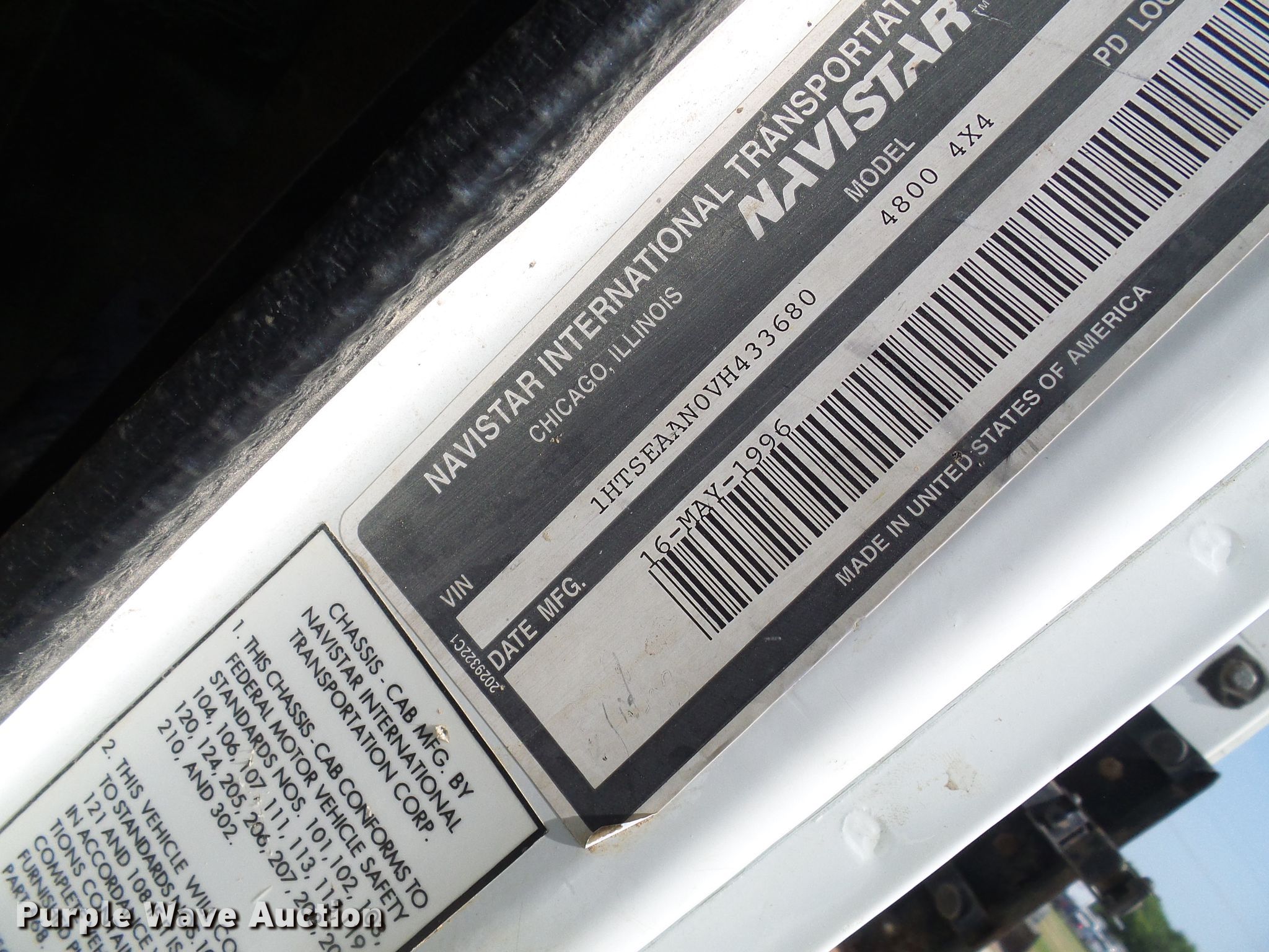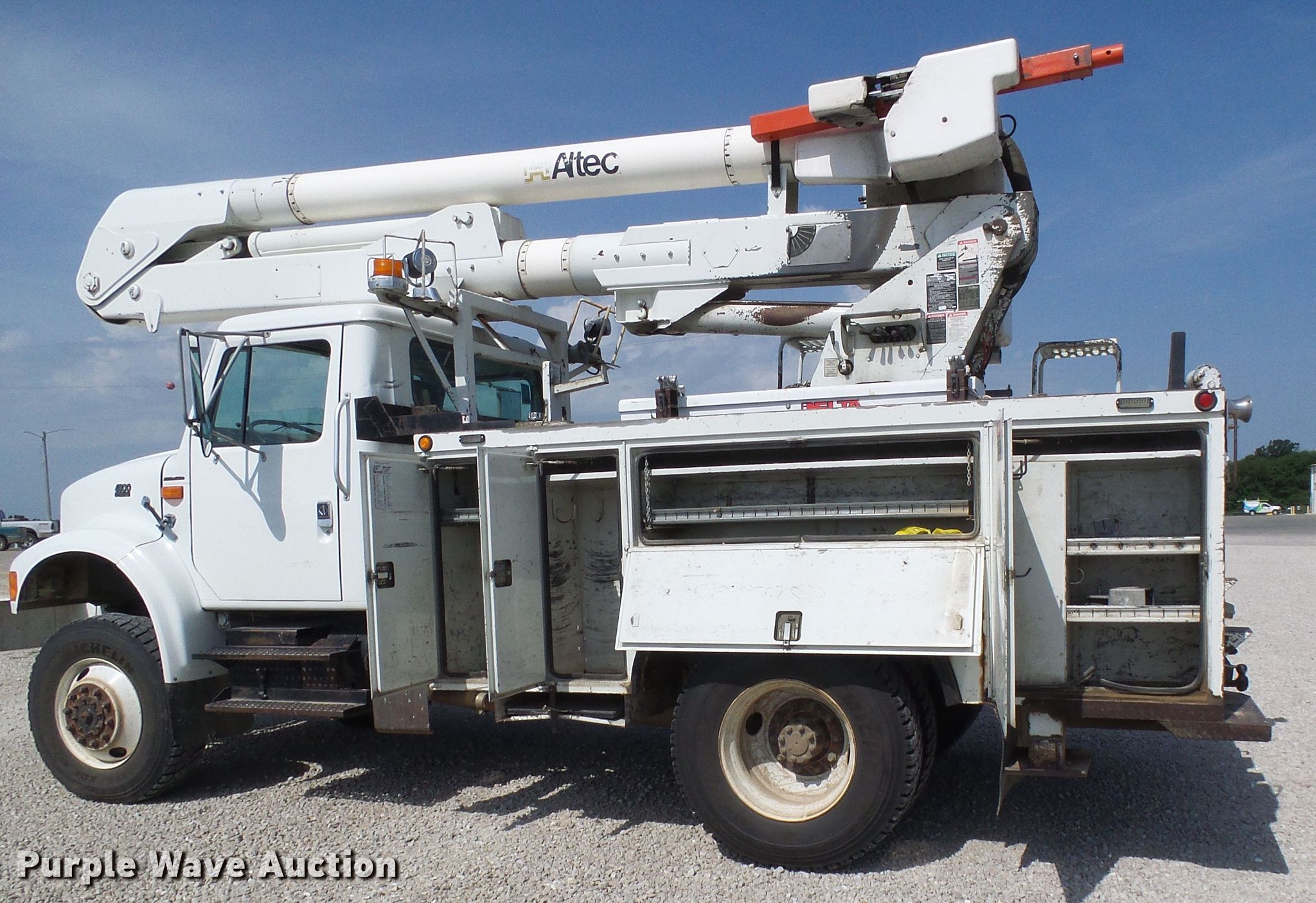 1997 International 4800 bucket truck. 226,059 miles on odometer, Unit #: 41. Engine International DT466 , Displacement: 7.6L, Cylinders: 6, Fuel type: Diesel. Transmission Eaton Fuller Road Ranger, Manual, Speed: 6. Chassis Four wheel drive, Axles: Single, Suspension: Spring, Brakes: Air, PTO. Interior Heat. Operational Utility bed Altec , Length: 11', Boom Altec AA042, Serial: 0696BD0271, Maximum lift capacity: 400 lbs, Maximum lift height: 42', Boom type: Articulating, Insulated, Man basket, Boom controls Ground, Platform/ basket, Material handler. Tires Size: 11R22.5. Missouri title. 1HTSEAAN0VH433680. Co-Mo Electric Cooperative. 448 Richard Blvd. Tipton, MO 65081