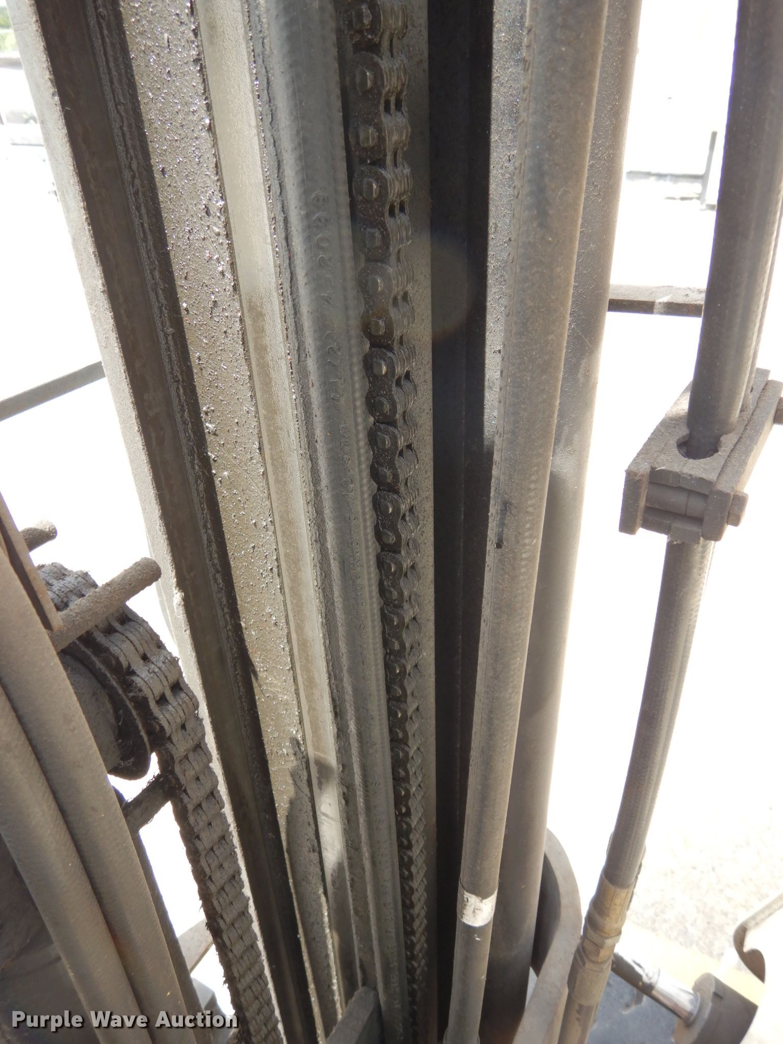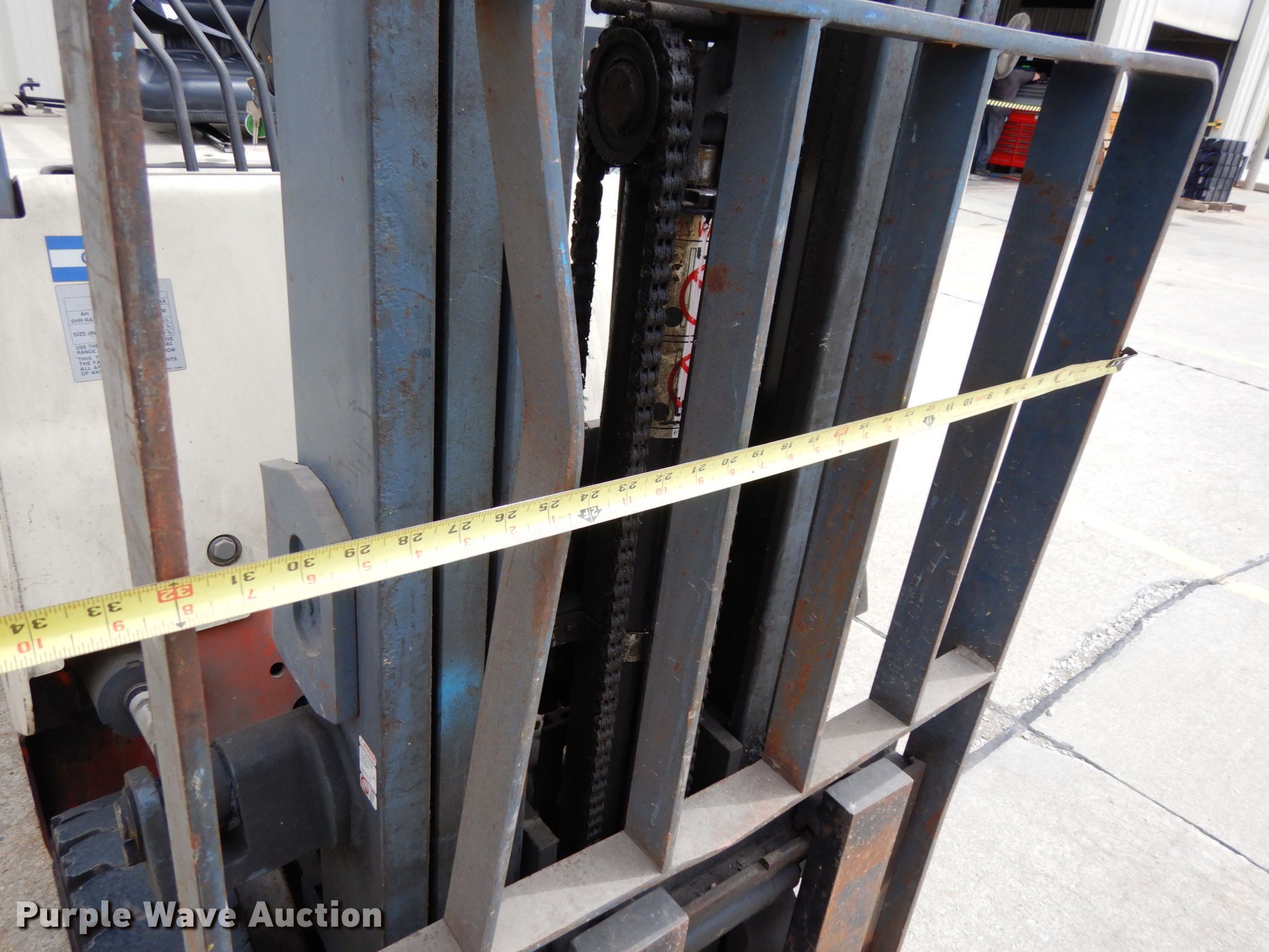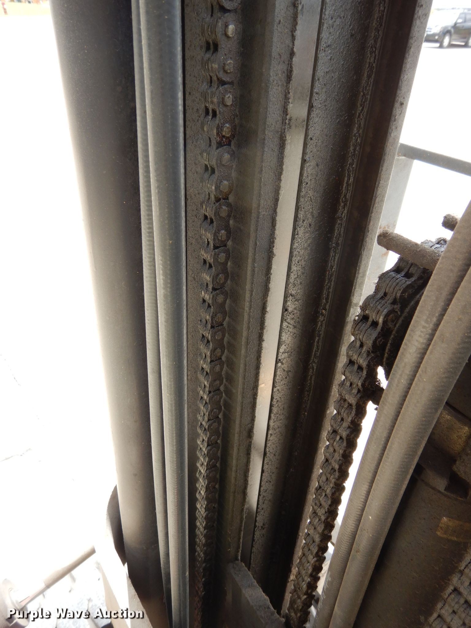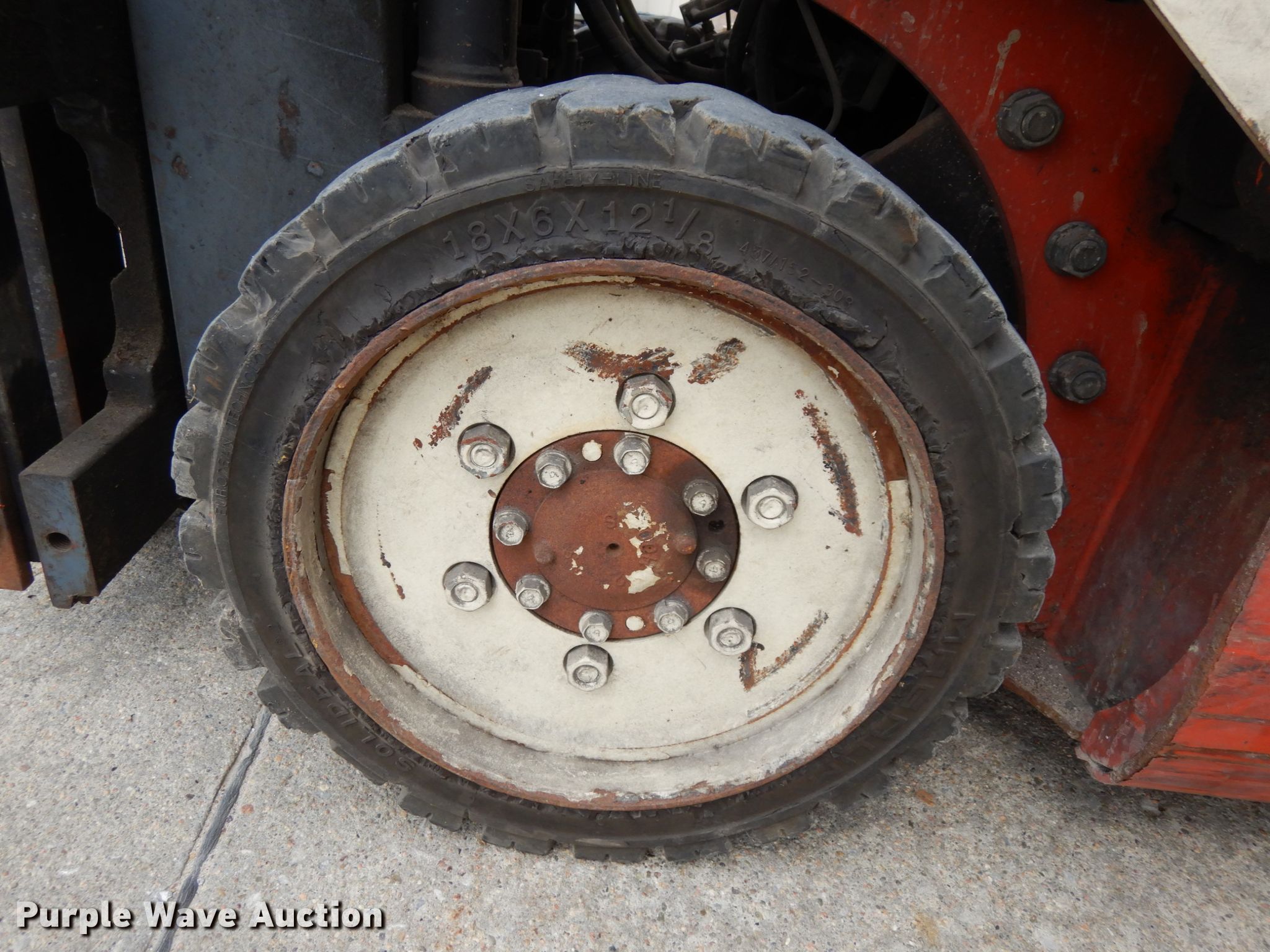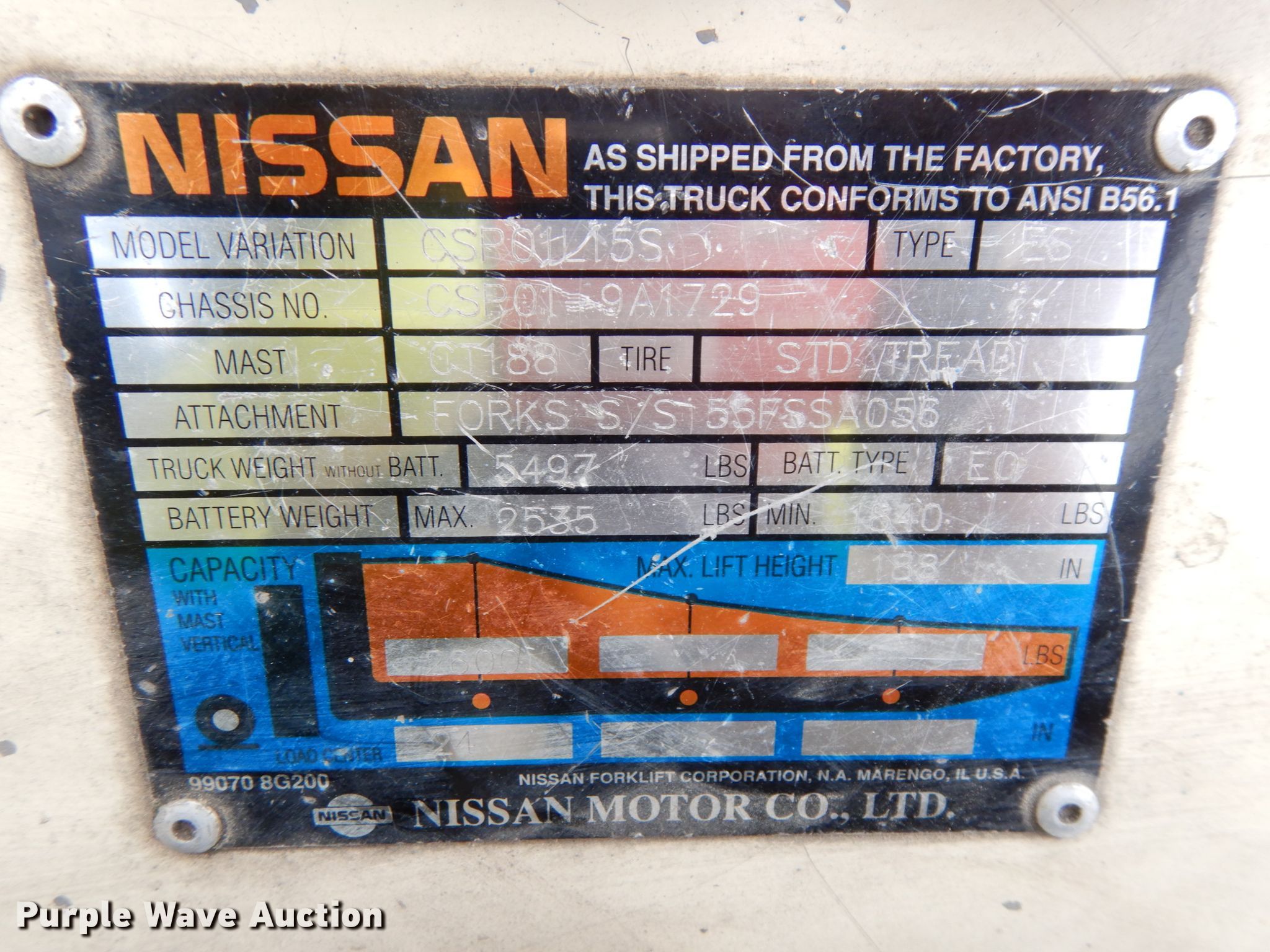 Nissan CSP01L15S forklift. 19,977 hours on meter, Serial: CSP01-9A1729. Electric motor. Transmission Hydrostatic. Operators station Canopy. Operational Maximum lift capacity: 2,600 lbs, Maximum lift height: 188", Mast stages: 3, Side shift, Mast tilt, Fork length: 42". Tires Front: 18x6x12-1/8, Rear: 14x4-1/4x8, Solid. RAKA. 10808 S 156th St. Omaha, NE 68138