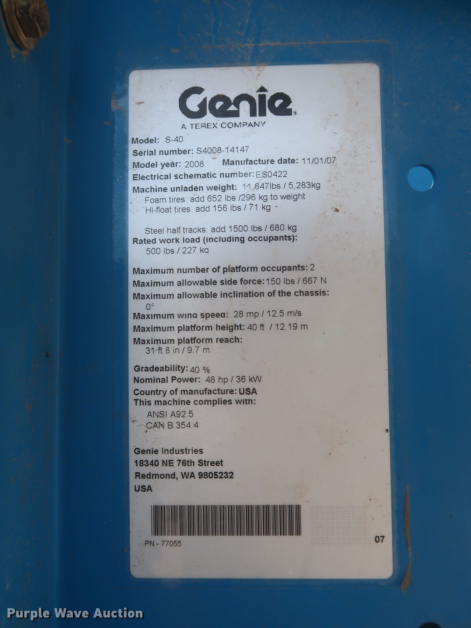 Purple Wave is selling a used Boom Lift in Oklahoma. This item is a 2008 Genie S-40 boom lift with the following: 2,752 hours on meter, Serial: S4008-14147