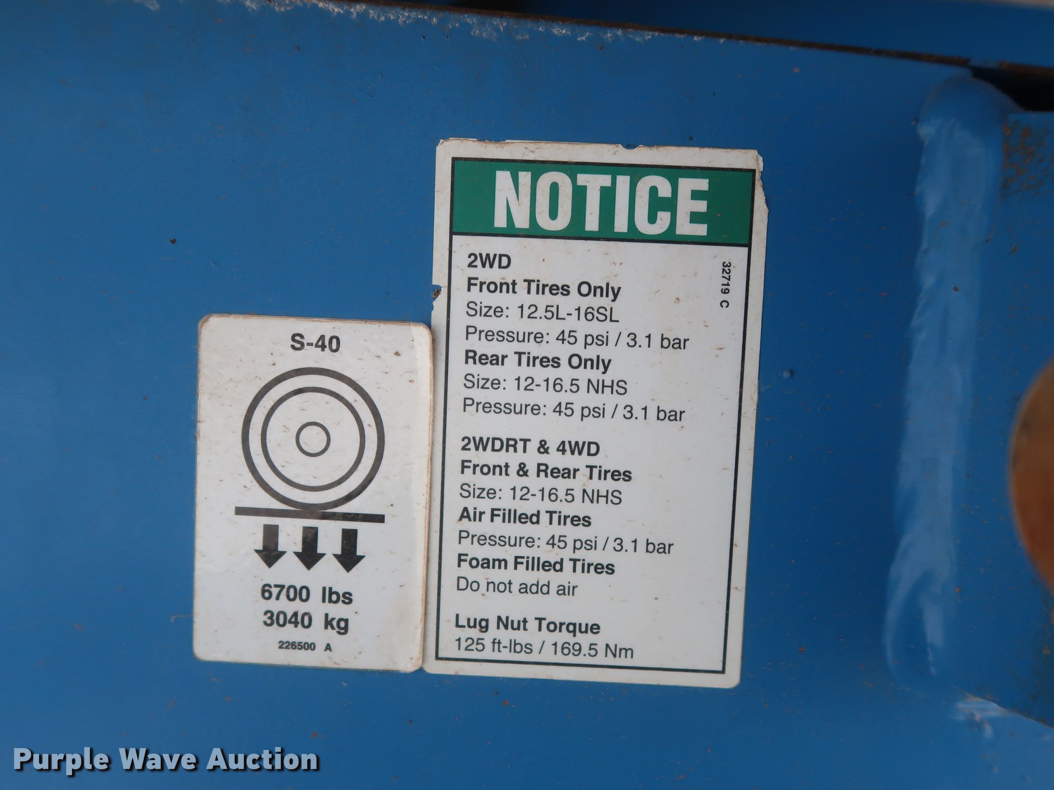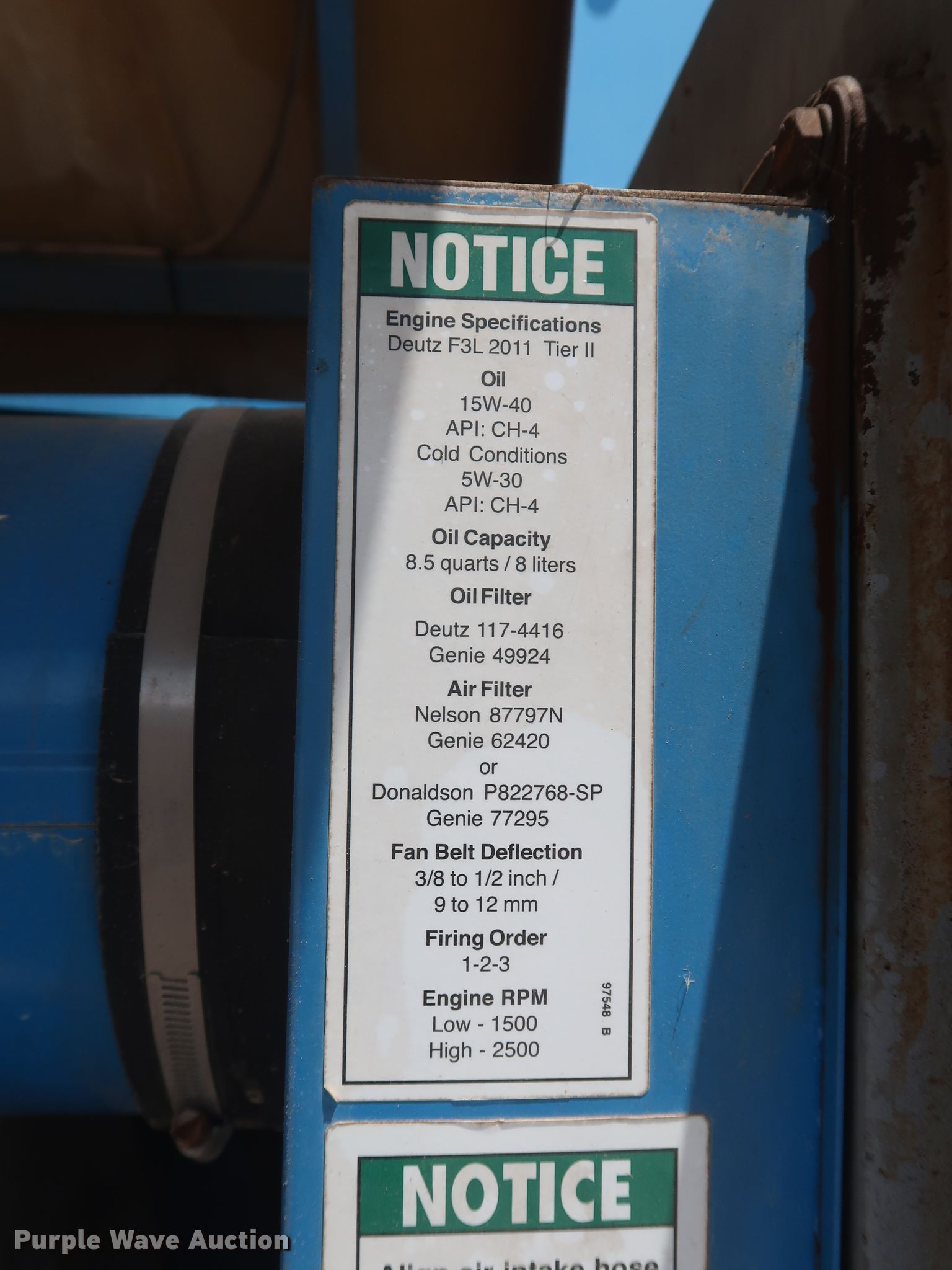 2006 Genie S40 boom lift. 3,380 hours on meter, Serial: S4006-10896. Engine Deutz F3L2011, Serial: 10168309, Displacement: 2.332L, Cylinders: 4, Fuel type: Diesel, HP: 48. Chassis Four wheel drive. Operational Rough terrain, Maximum lift capacity: 500 lbs, Maximum reach length: 31' 8", Maximum lift height: 40', Platform: 72" L x 30" W, AC power outlet, Controls: Platform, Ground, Platform rotation: Hydraulic, Safety alarm. Tires Tire size: 12-16.5. C&C Portable Equipment Rentals. 706 SE 4th St. Lindsay, OK 73052