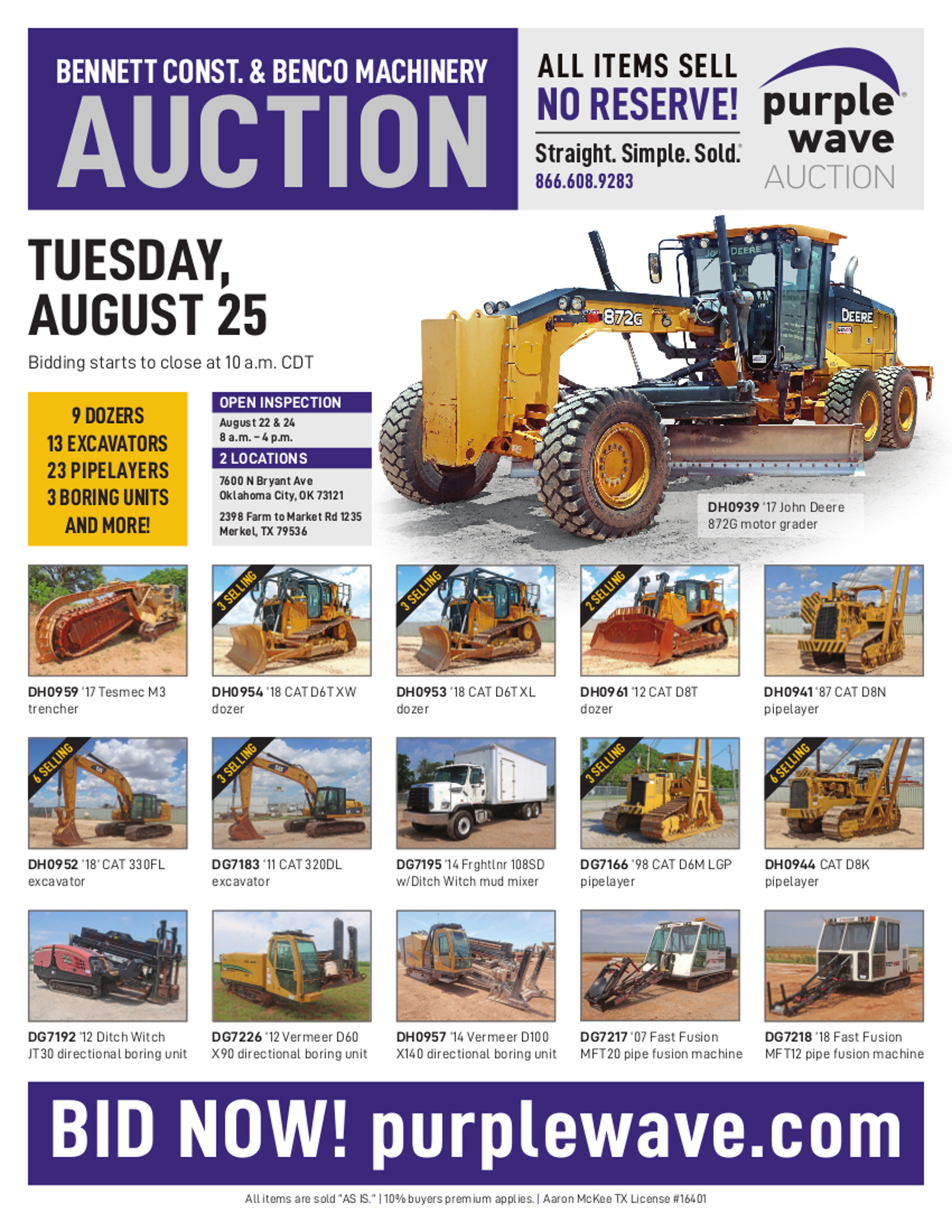 SOLD! August 25 Bennett Construction & Benco Machinery Equipment Auction