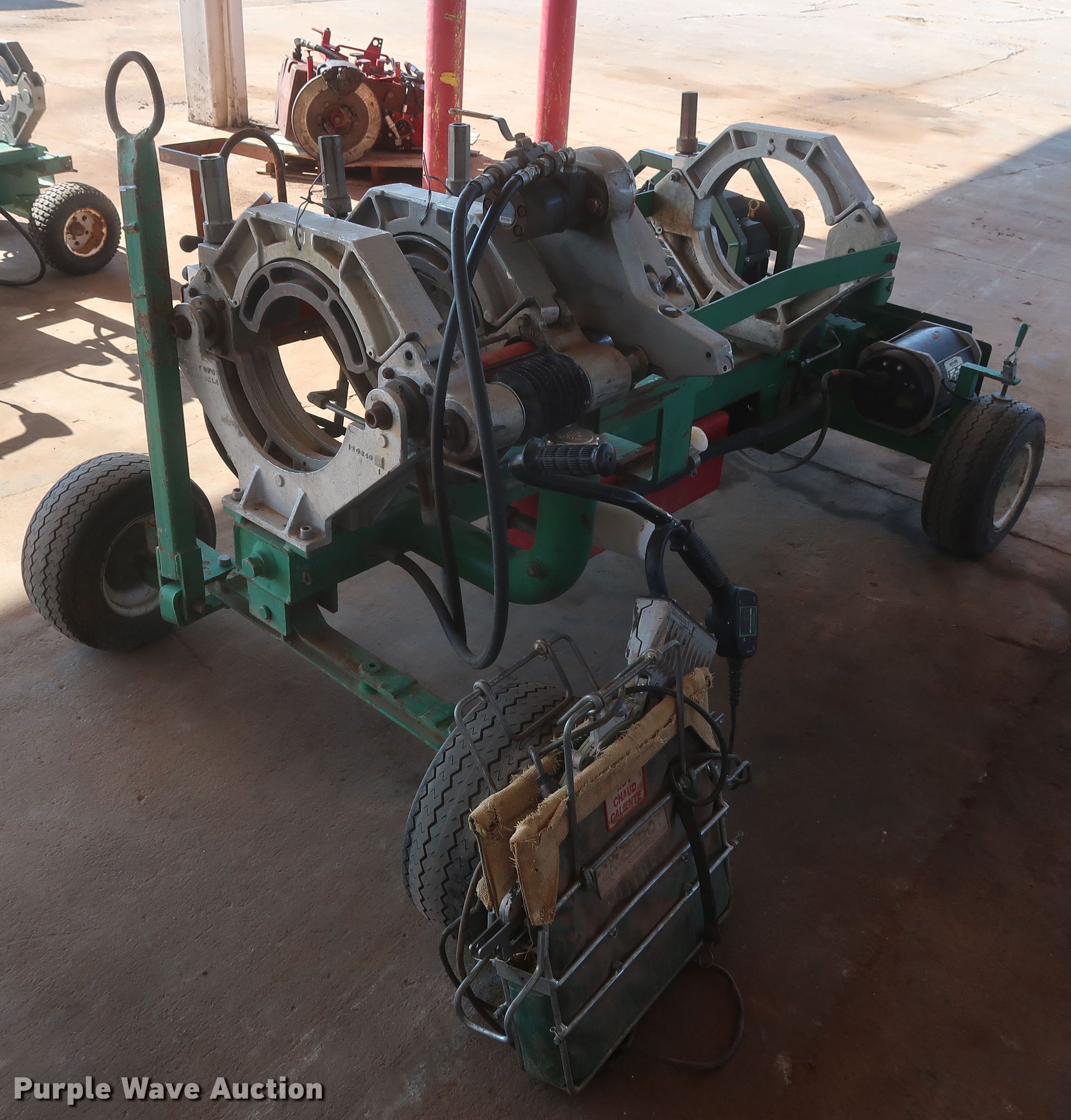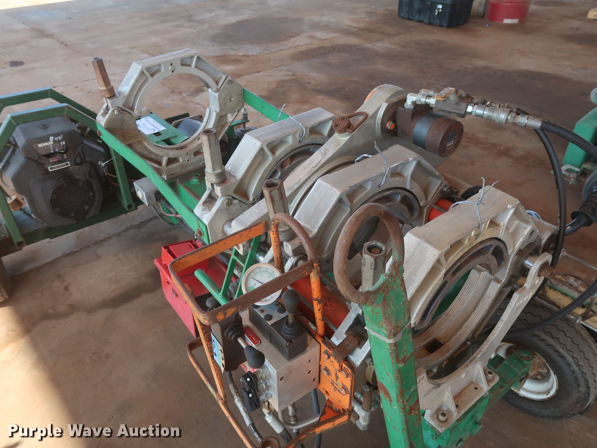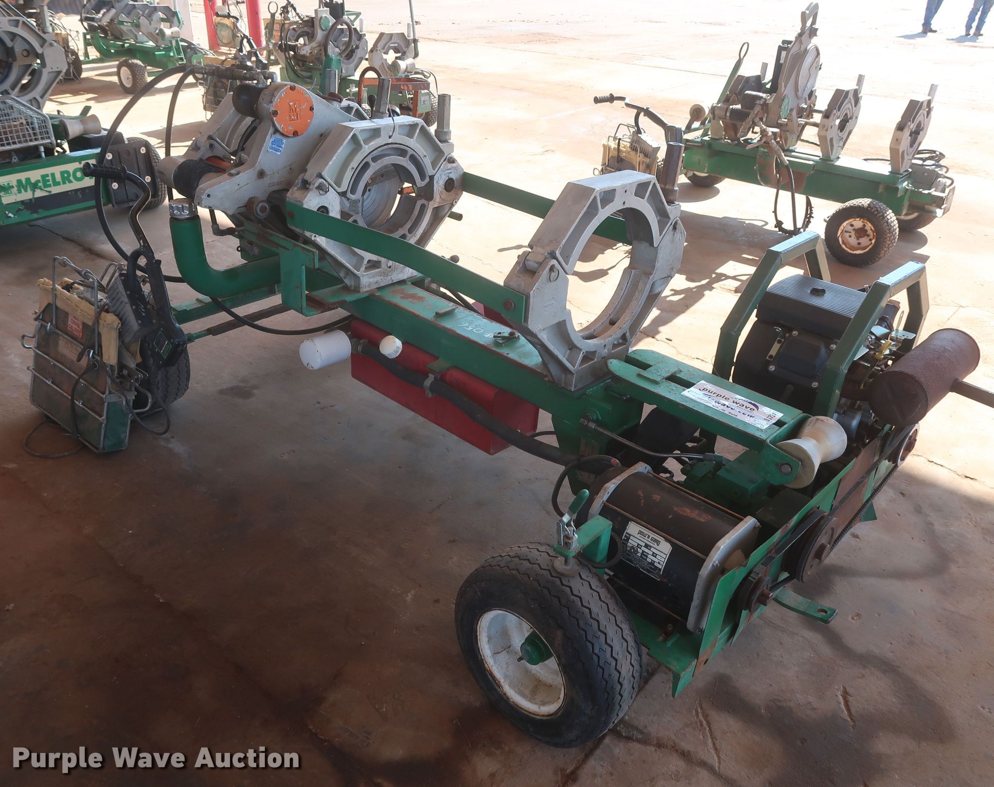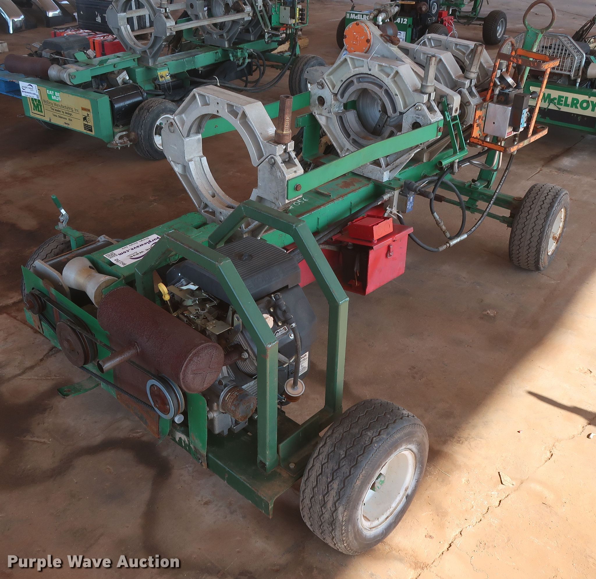 Purple Wave is selling a used Other Industrial or Business in Oklahoma. This item is a McElroy 412 poly pipe fusion machine with the following: 1,654 hours on meter, Kohler Magnum two cylinder gas engine, 18 HP, Four jaw carriage, 4" to 12" diameter pipe capacity, Facer, Heater, Insulated stand, 16.5/6.5-8 tires, Serial 9271070, Unit# 056