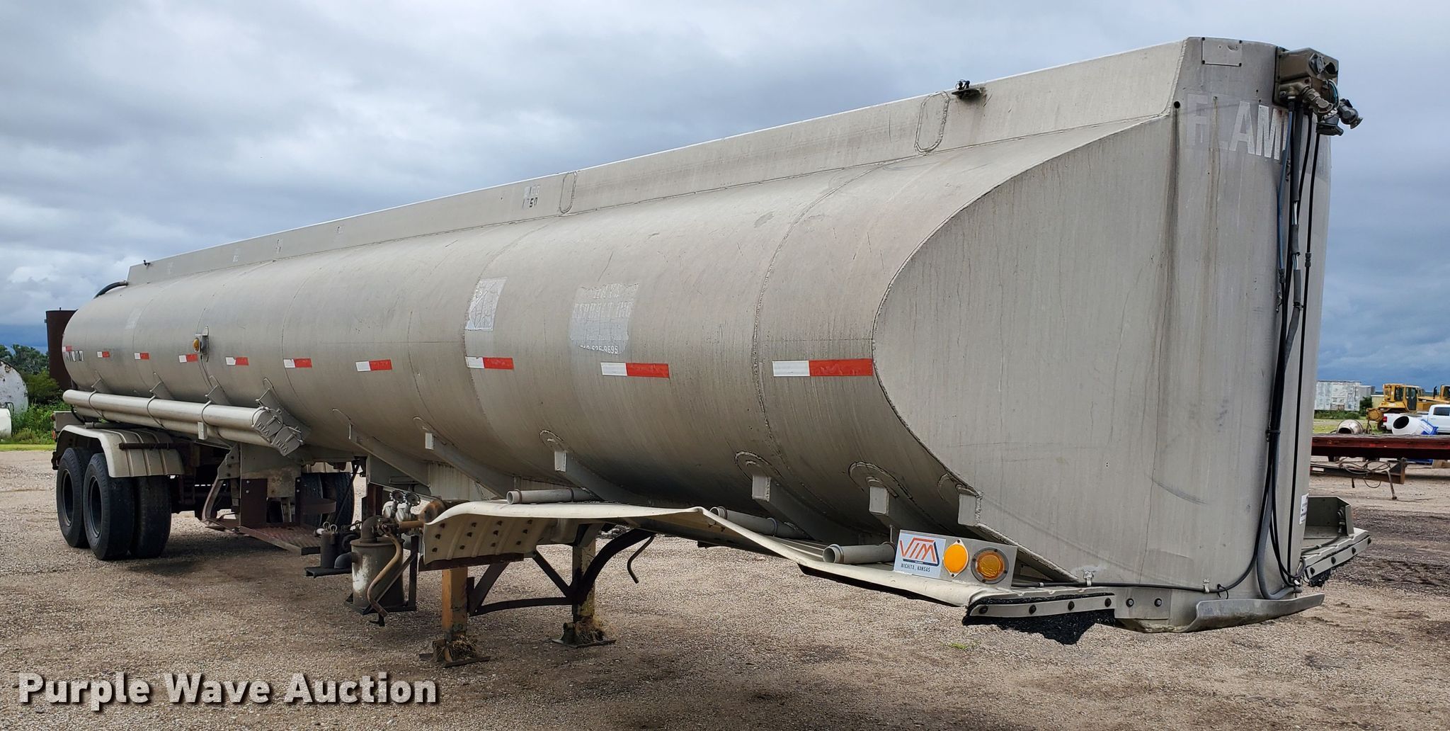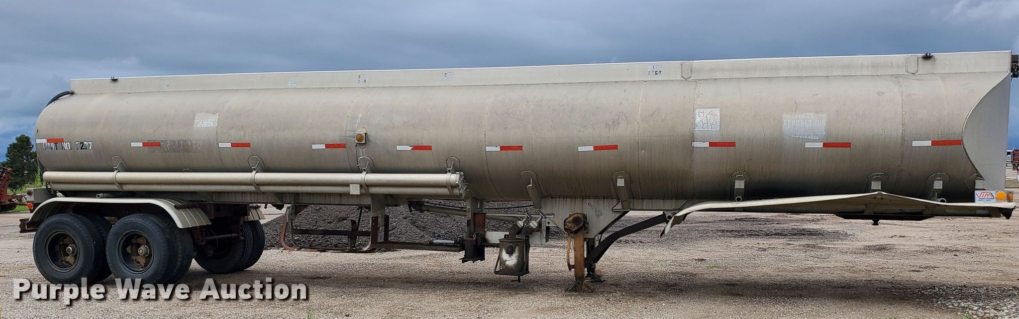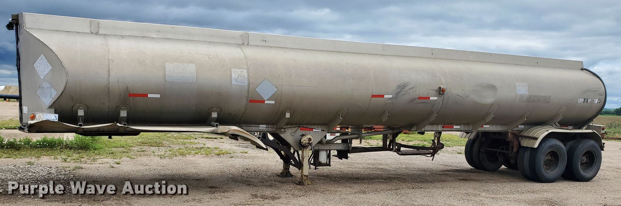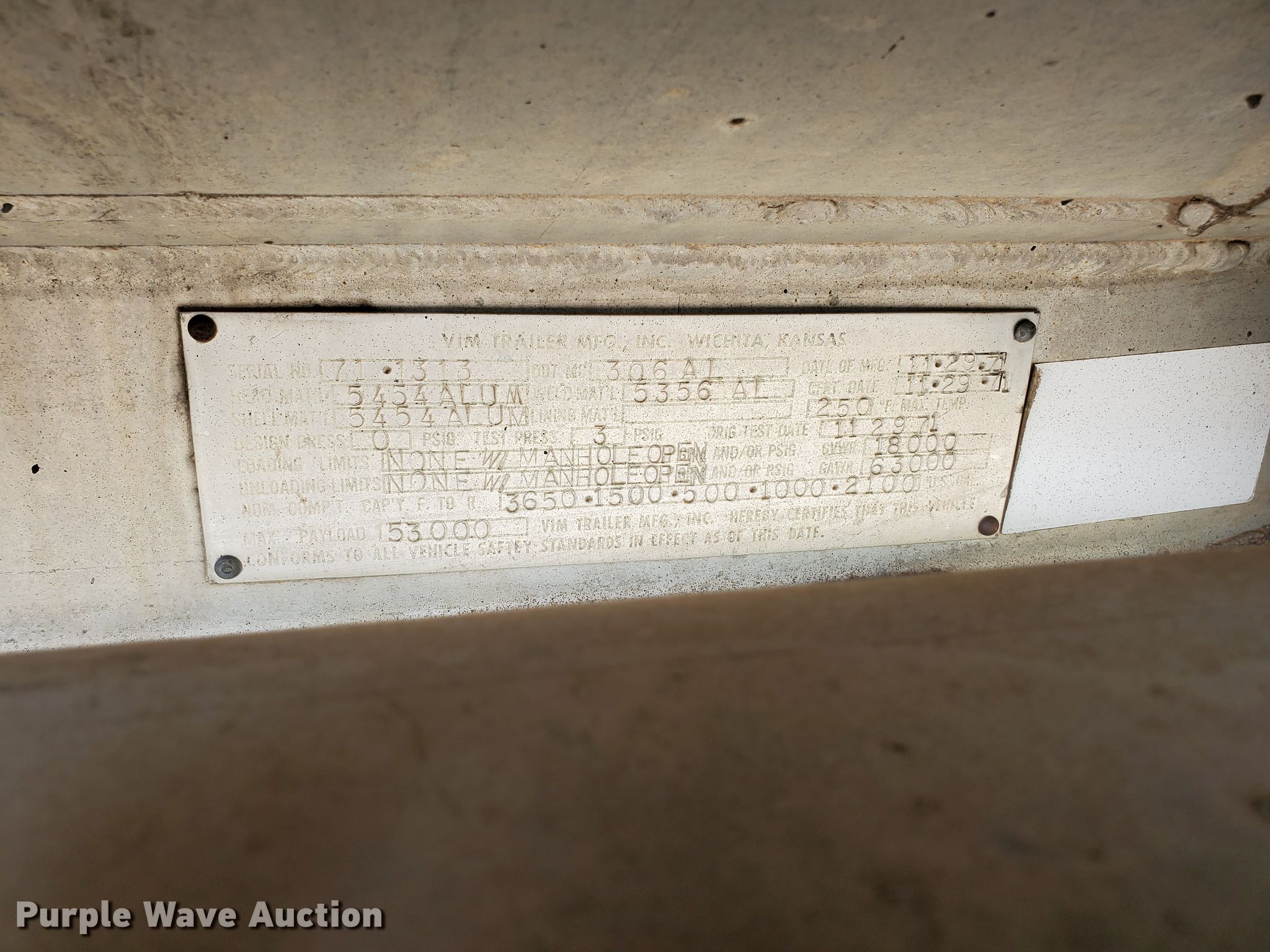 Purple Wave is selling a used Tank Trailer in Kansas. This item is a 1971 VIM tank trailer with the following: 40'L x 8'W overall, 8,750 gallon aluminum tank, (2) outlet valves, Dual leg landing gear, Spring suspension, Air brakes, Tandem axle, Steel wheels, 10.00-20 tires, GVWR 63,000 lbs, GAWR 18,000 lbs, Compartment walls have been cut-out to make single compartment, Previously used to haul used motor oil