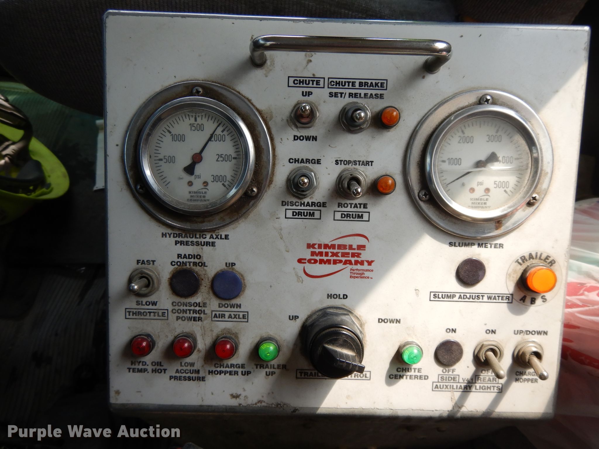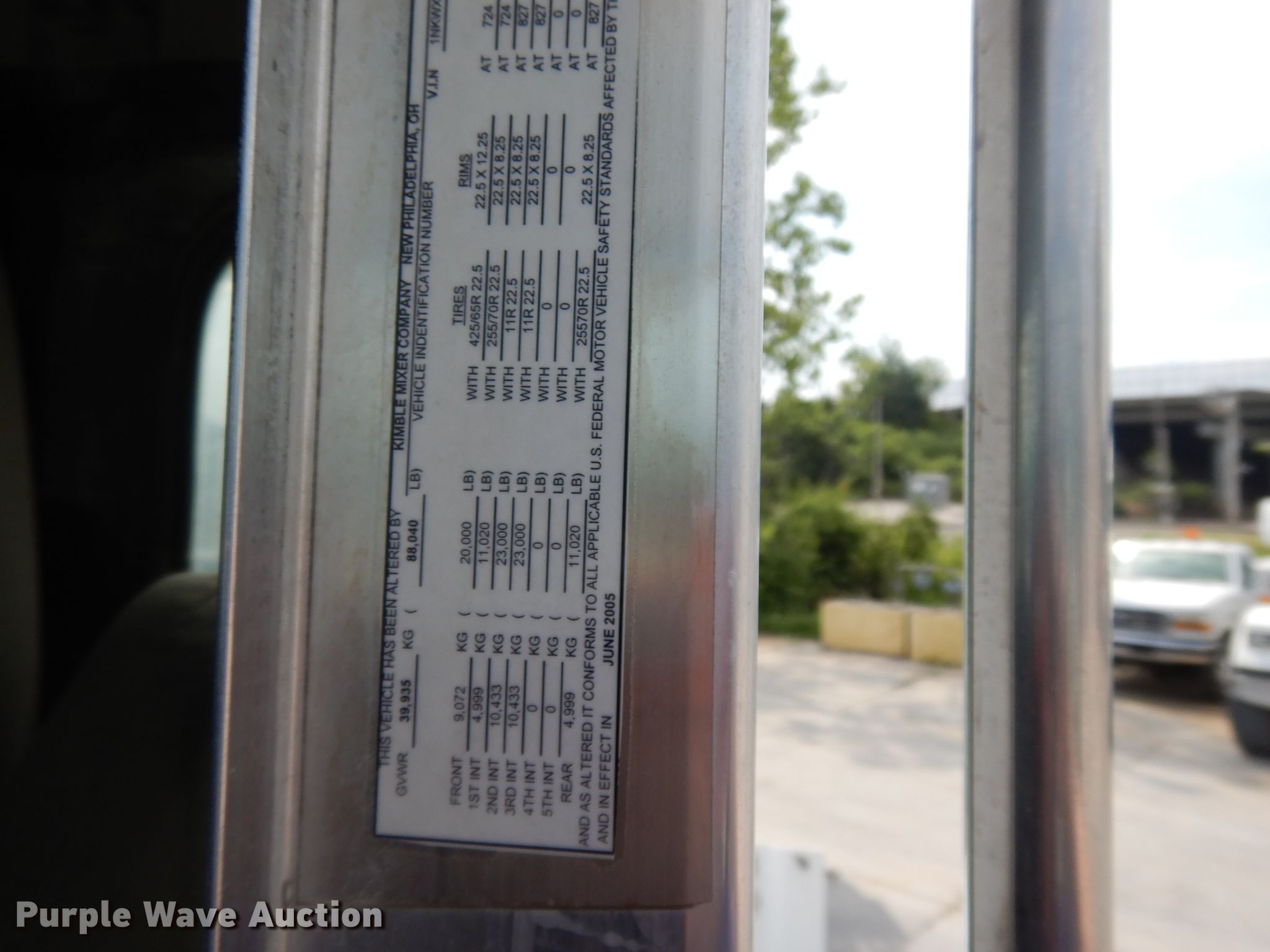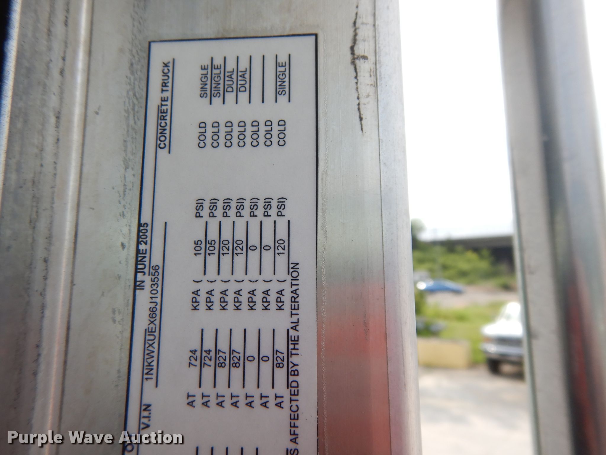 2006 Kenworth W900 ready mix truck. 155,839 miles on odometer, Engine hours: 16,215, Unit #: 15. Engine Caterpillar C13, Displacement: 12.0L, Cylinders: 6, Fuel type: Diesel. Transmission Manual, Speed: 9. Chassis Axles: Tandem, Pusher axle, Tag axle, Differential lock: Inter-axle, Suspension: Walking beam, Brakes: Air, PTO, GVWR: 88,040 lbs FAWR: 20,000 lbs, IAWR: 23,000 lbs, RAWR: 23,000 lbs, Lift axle GAWR: 11,020 lbs, Wheelbase: 248". Interior AC, Heat, Heated mirrors. Operational Mixer Kimble K2000, Serial: K210.5HD2751, Capacity: 10.5 cu.yd., Discharge: Rear, In-cab controls, Rear drum controls, Water tank: 150 gallon, Chute Extensions: 3, Chute type: Steel. Tires Front: 11R22.5, Rear: 425/65R22.5. Notes ABS light on, AC blows warm. Kansas title. 1NKWXUEX66J103556. Open inspection Aug. 26. 9900 W 75th St. Overland Park, KS 66204