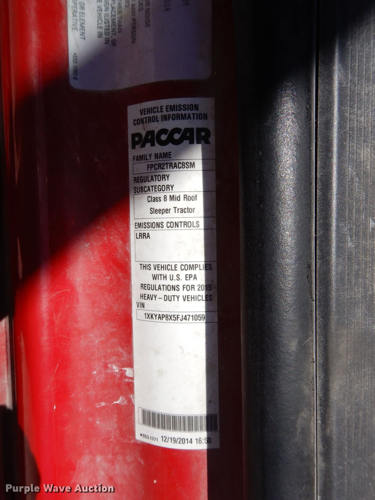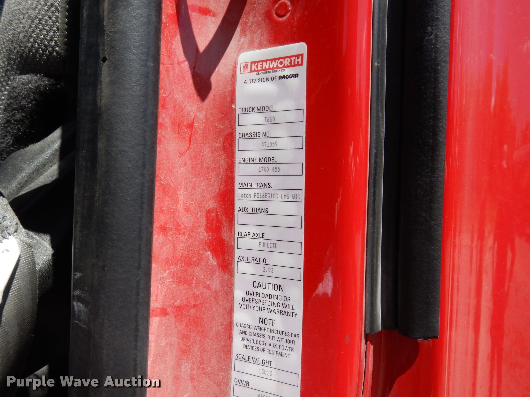 2015 Kenworth T680 semi truck. 499,594 miles on odometer, Engine hours: 13,216. Engine Paccar MX-13, Displacement: 12.9L, Cylinders: 6, Fuel type: Diesel, Engine brake. Transmission Automatic. Chassis Axles: Tandem, Differential lock: Inter-axle, Suspension: Air, Brakes: Air, PTO, GVWR: 46,000 lbs FAWR: 12,000 lbs, IAWR: 17,000 lbs, RAWR: 17,000 lbs, Wheelbase: 216". Interior AC, Heat, Power windows, Power locks, Cruise control, Air ride cab, Sleeper Sleeper length: 40", Beds: Single, Rear climate control. Operational Deck plate: Aluminum, Holland fwalz800xl00, Fifth wheel type: Fixed, Fuel tank: Dual. Tires Front: 11R22.5, Rear: 455/50R22.5. Notes Windshield chipped or cracked. Arkansas title. 1XKYAP8X5FJ471059. Open inspection Aug. 26. 2496 W Hudson Rd. Rogers, AR 72756
