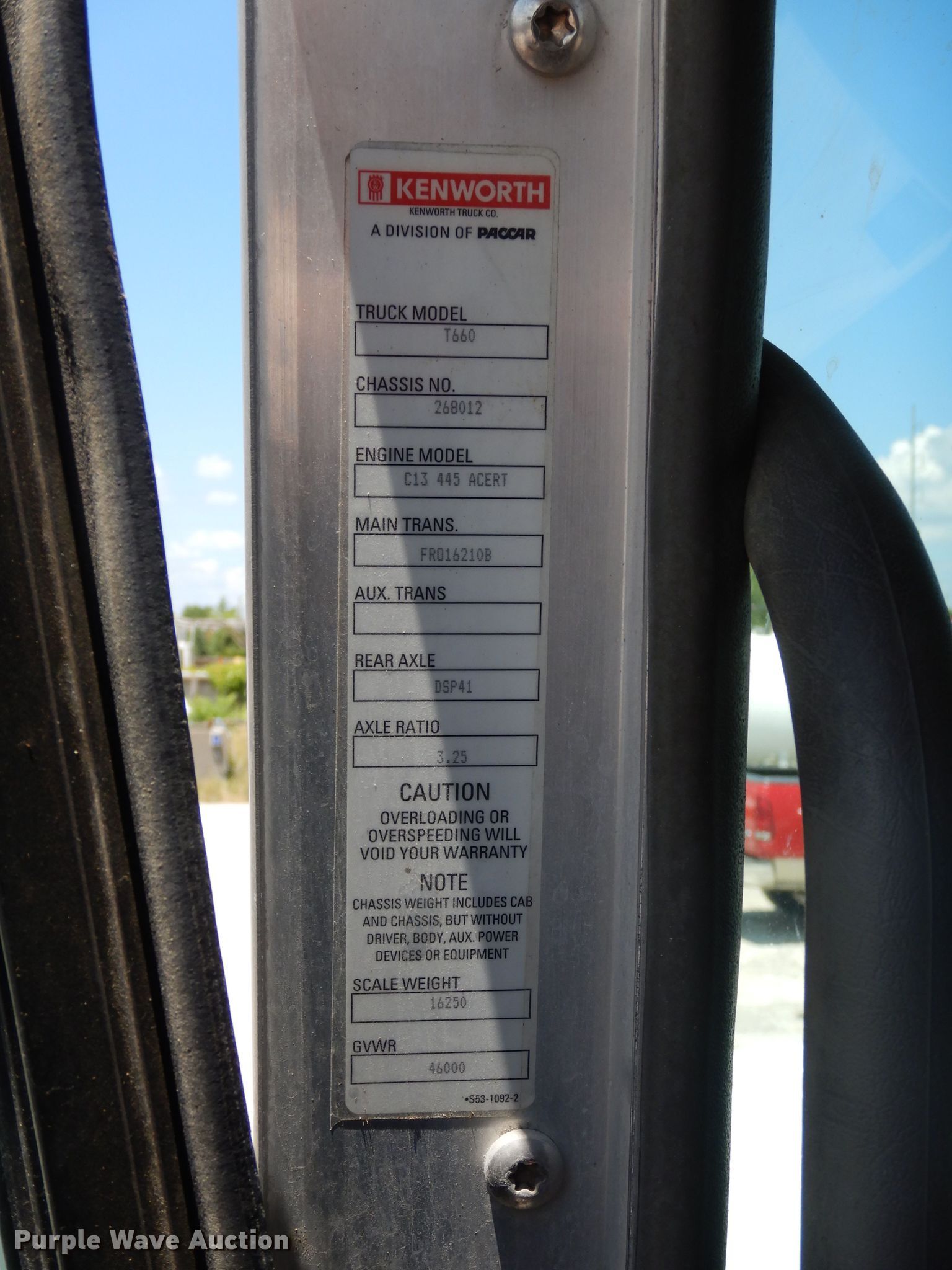 2010 Kenworth T660 semi truck. 815,987 miles on odometer, Engine hours: 17,406. Engine Caterpillar C13 Acert, Displacement: 13.0L, Cylinders: 6, Fuel type: Diesel, Engine brake. Transmission Eaton Fuller, Manual, Speed: 10. Chassis Axles: Tandem, Differential lock: Full, Suspension: Air, Brakes: Air, GVWR: 46,000 lbs FAWR: 12,000 lbs, IAWR: 17,000 lbs, RAWR: 17,000 lbs, Wheelbase: 216". Interior AC, Heat, Power windows, Power locks, Cruise control, Air ride cab, Sleeper Kenworth Aerocab, Sleeper length: 4', Beds: Single. Operational Deck plate: Steel, Fifth wheel type: Fixed, Fuel tank: Dual. Tires Front: 11R22.5, Rear: 445/50R22.5. Notes Hood cracked. Arkansas title. Title distribution may be delayed up to 45 days from verification of funds. 1XKADU8X5AJ268012. Open inspection Aug. 26. 2496 W Hudson Rd. Rogers, AR 72756