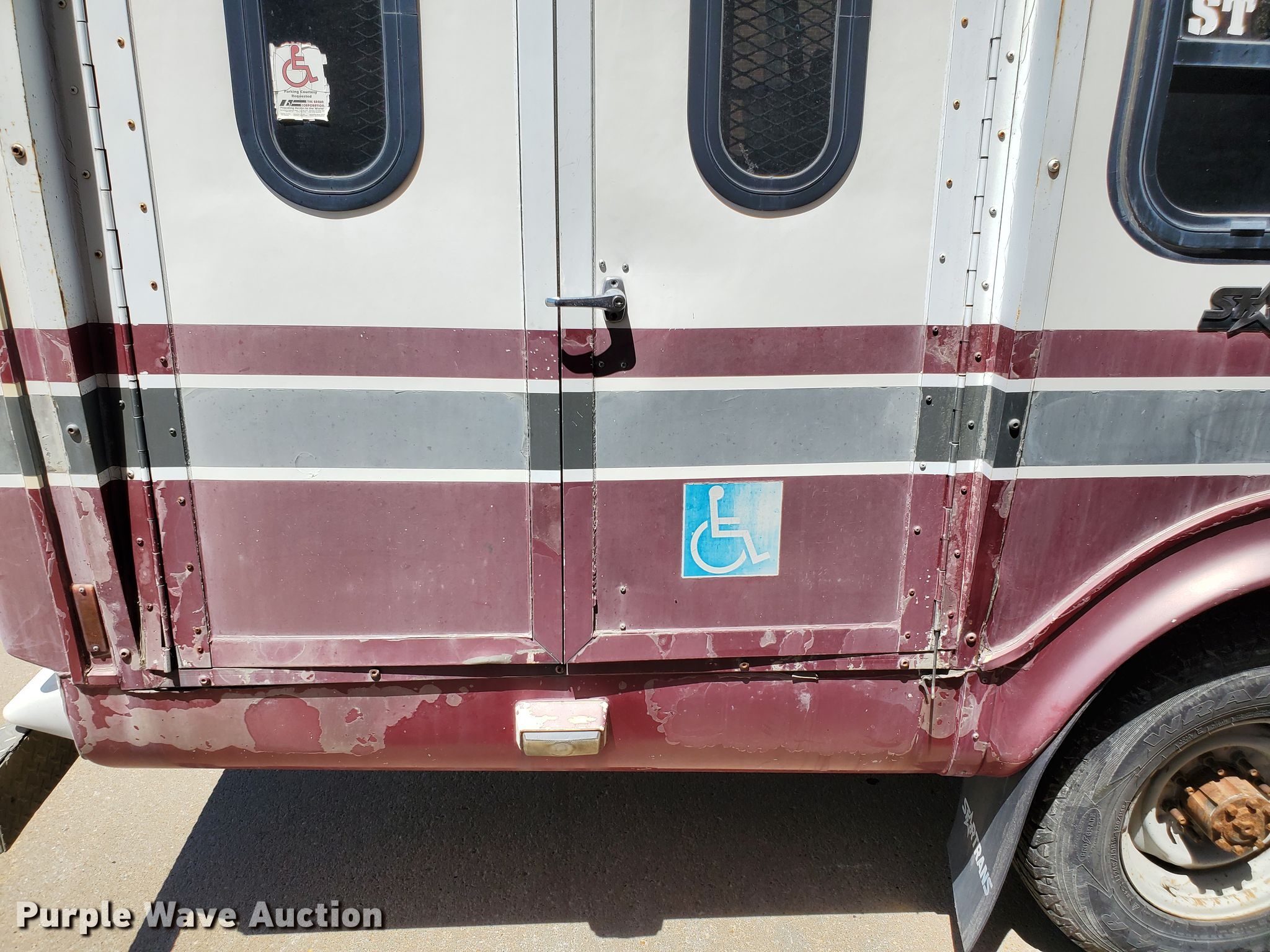 1993 Ford Econoline E350 StarTrans shuttle bus. 93,301 miles on odometer. Engine Displacement: 5.8L OHV 16V, Cylinders: 8, Fuel type: Gas. Transmission Automatic. Chassis Axles: Single, Suspension: Spring, Brakes: Hydraulic. Interior AC, Heat, Passengers: 10, Wheelchair lift. Tires Size: 245/75R16. Notes Possible fuel issues, Unknown operating condition. Kansas title. Title distribution may be delayed up to 14 days from verification of funds. 1FDJE37H4PHB36870. USD 271. 421 Main St. Stockton, KS 67669