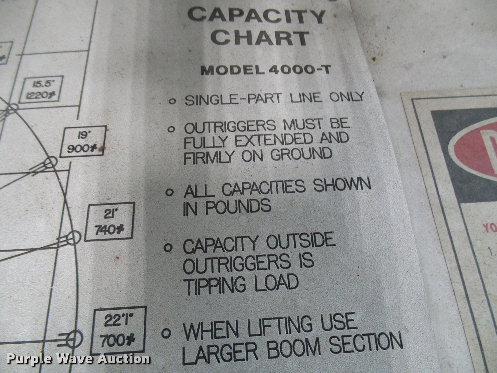 2003 Pitman 4000-T mini digger derrick. 479 hours on meter, Kubota D722E three cylinder diesel engine, Hydrostatic transmission, 2,500 lbs max lift capacity, 25' max lift height, Insulated and telescopic boom, Man basket, Ground boom controls, Remote control, 18" diameter auger, Bit extensions, Certification expired on March 12,2020, 9"W extendable tracks, Boom serial 0207200183, 10'L x 66"W trailer Spring suspension, Electric brakes, Tandem axle, 215/85R16 tires, GVWR 10,400 lbs. Missouri title. 1S9US10263H543059. City of Marshall Municipal Utilities. 765 W North St. Marshall, MO 65340